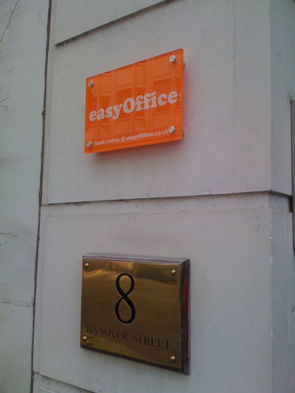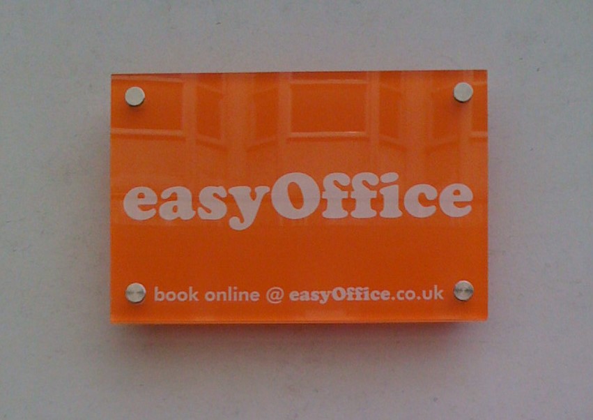 Easy Office London office sign bright orange corporate branded sign. reversely printed detail fitted to raised mounted 10 mm glass look acrylic panel.