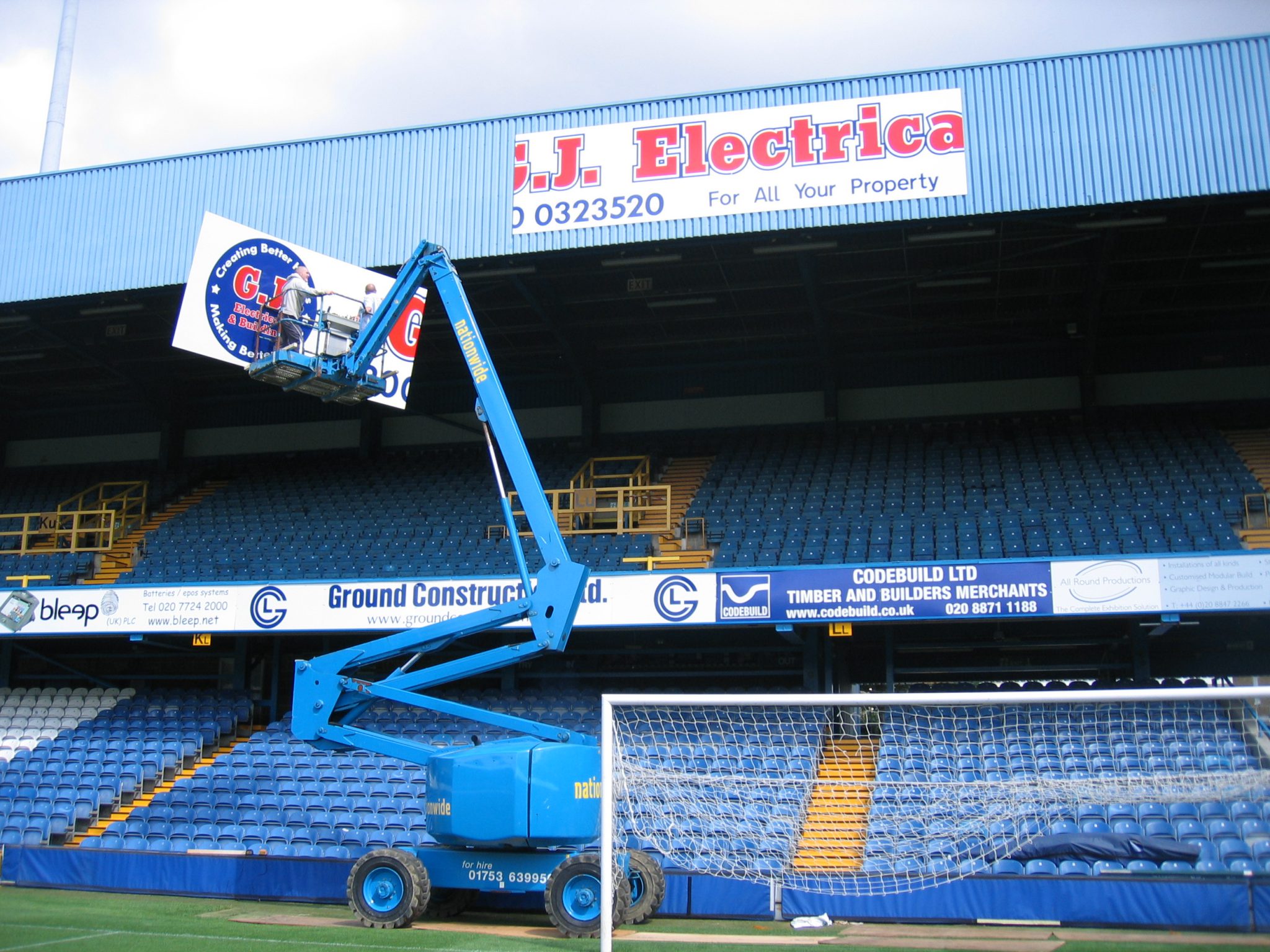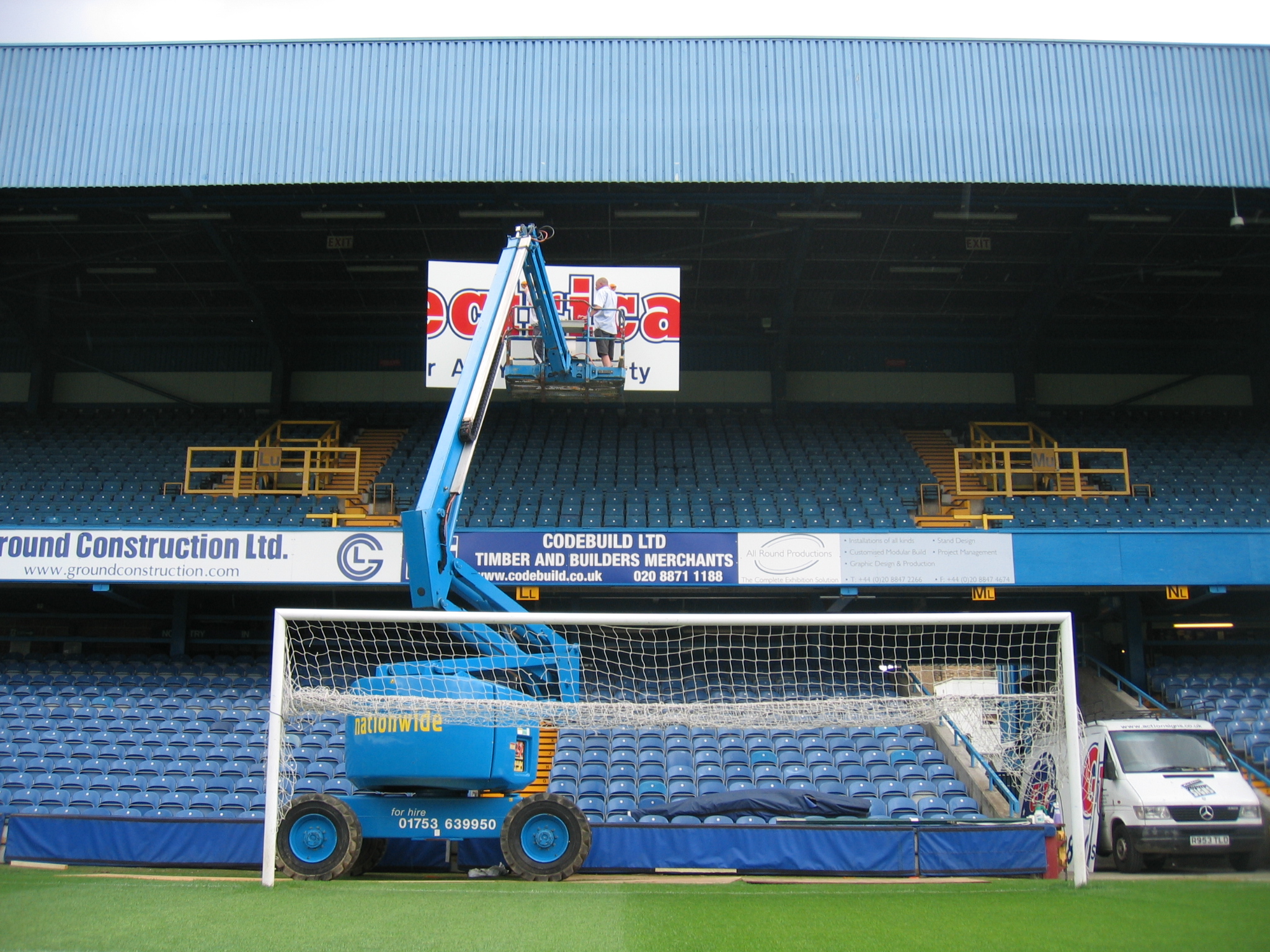 Advertising Hoarding Installation Installation of large format advertising hoarding at QPR's football stadium in London. Sports and Stadium Signs Share this sign