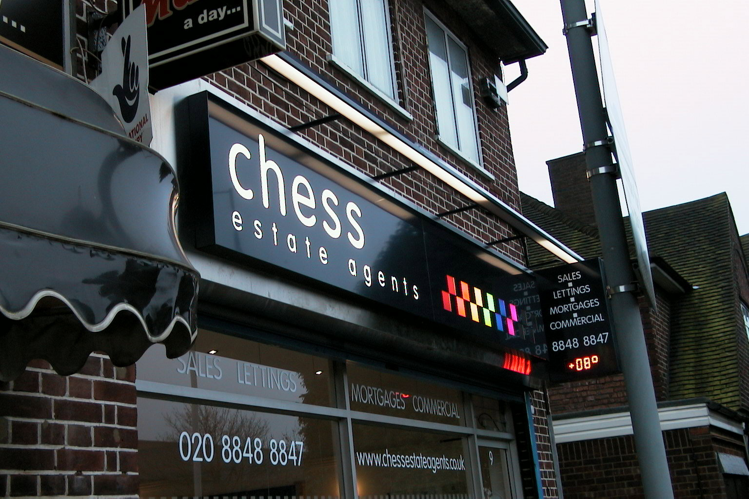 Back-lit Estate Agent Fascia (Chess) Back-lit sign for London estate agents with multi-coloured acrylic inlay and illumination from above by trough light. Shop Signs Share this sign