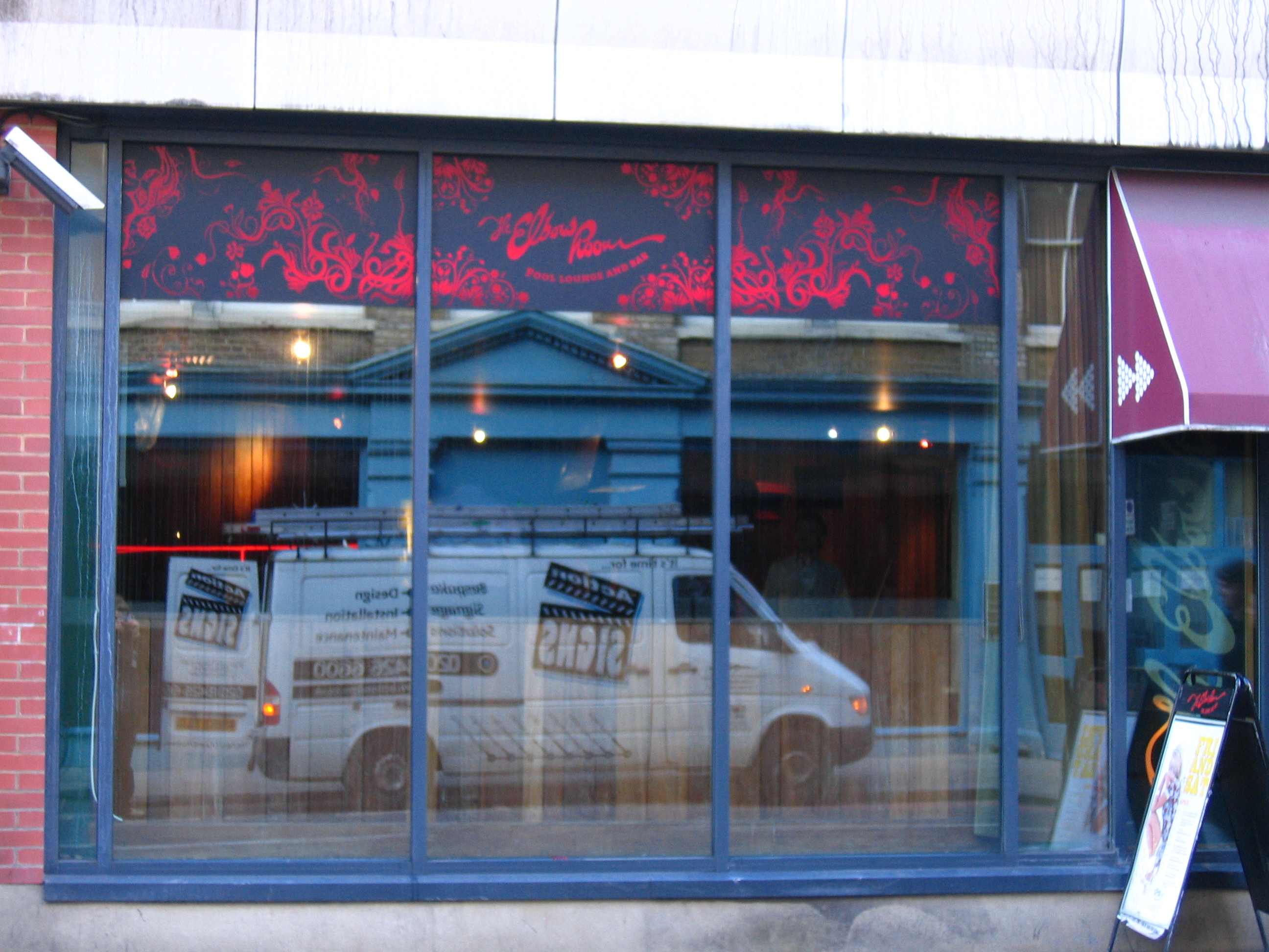 This custom graphic has a dual purpose, it provides contrasting branding in the daytime and an illuminated version in the evening as the internal lighting glows through the translucent vinyl.