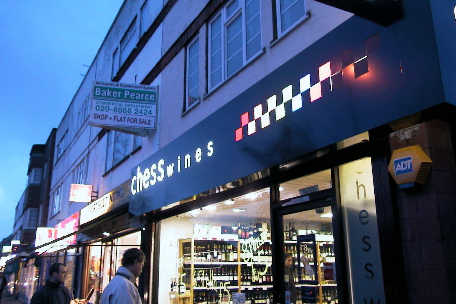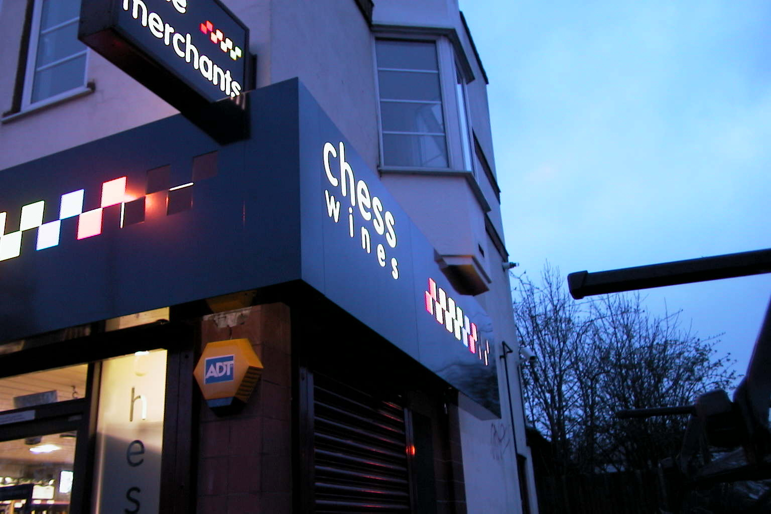 Back-Lit Wine Shop Fascia Back-lit sign for London wine shop with multi-coloured acrylic inlay together with matching projection sign. Shop SignsProjection Signs Share this sign