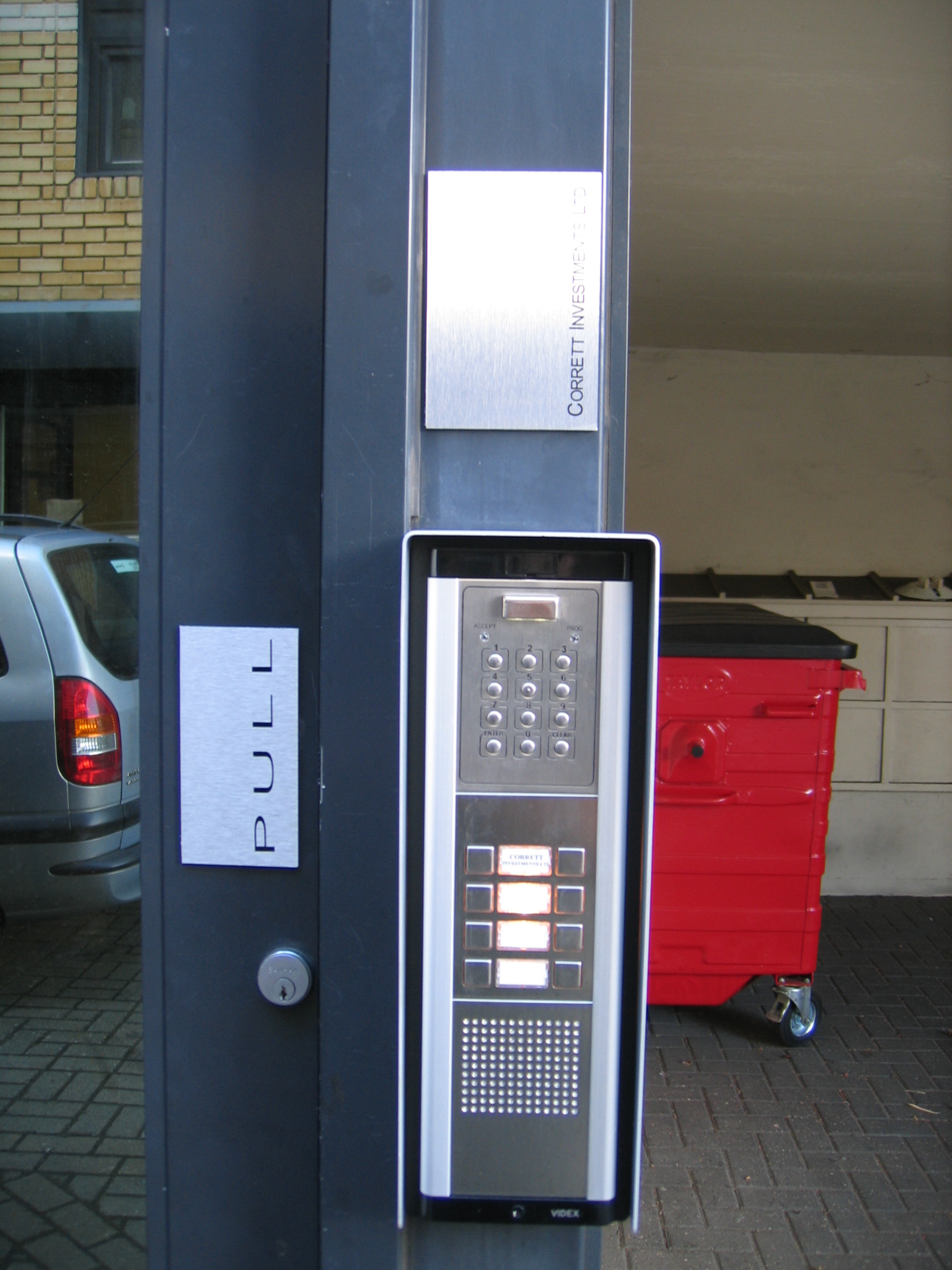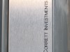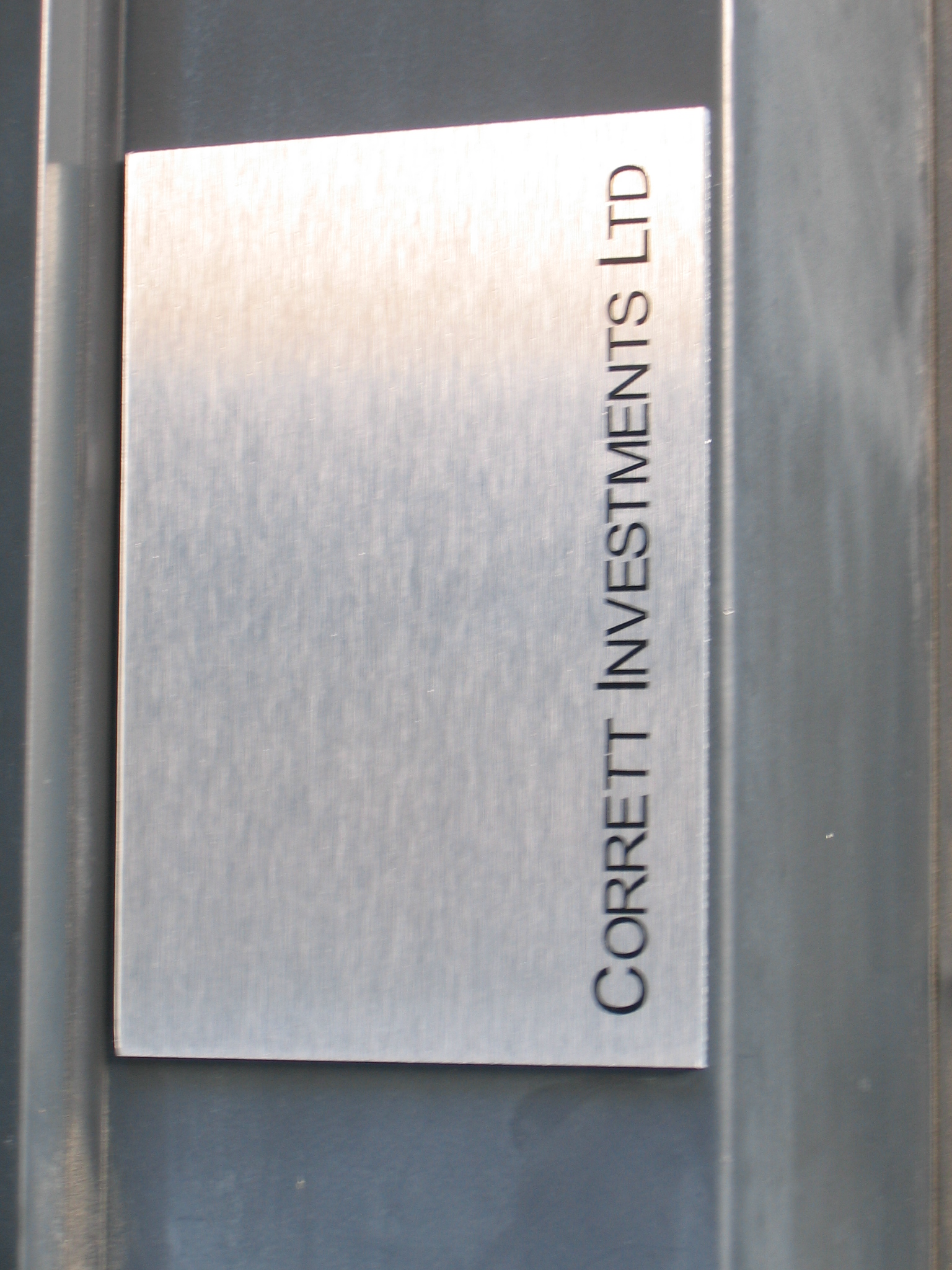 Brushed Stainless Steel Black Letters Small company name metal panel in brushed stainless steel for investment firm located next to doorbell. Metal SignsDoor SignsPlaques Share this sign
