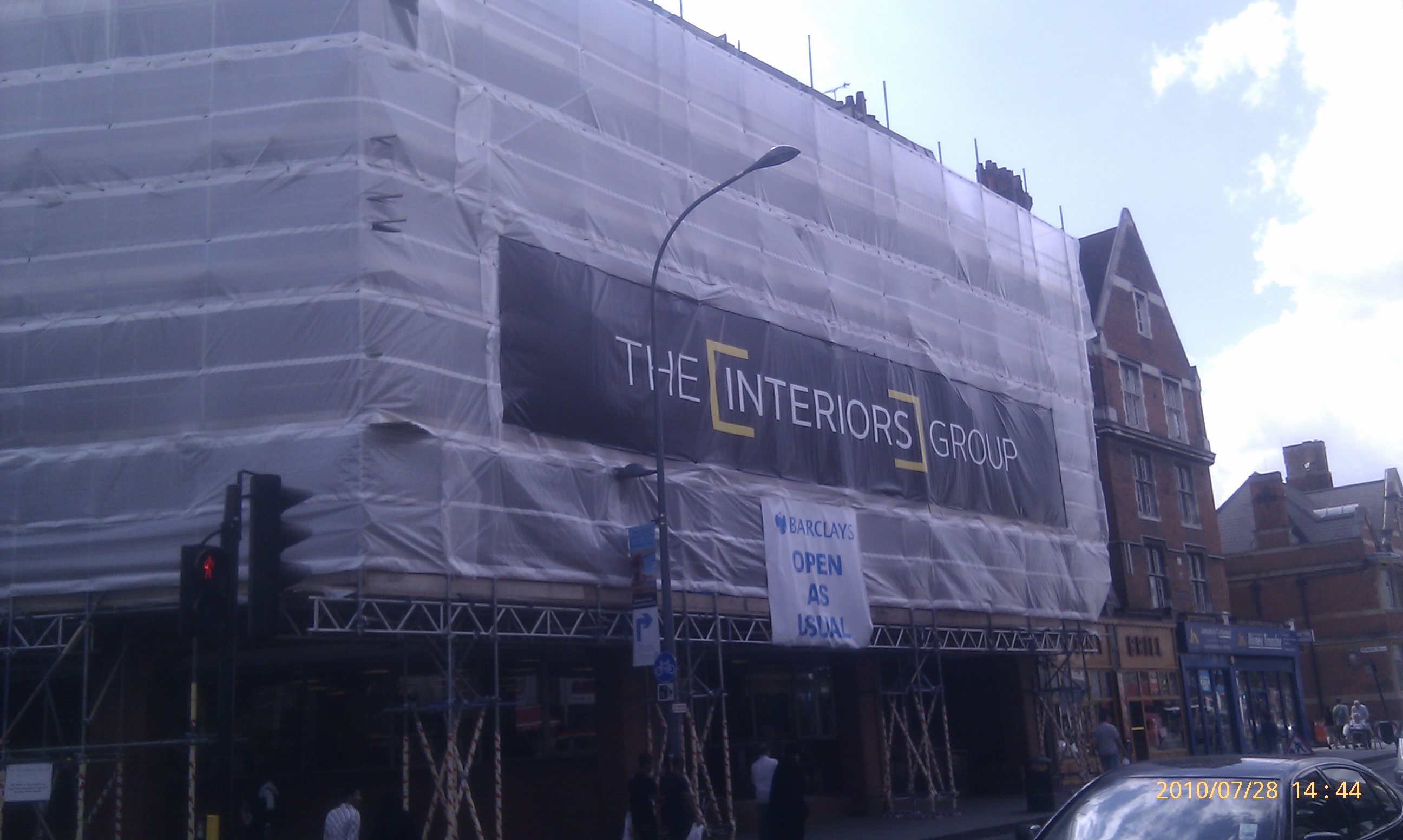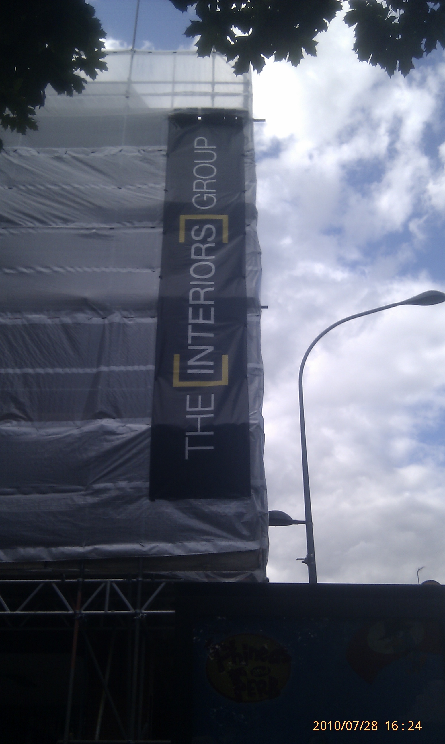 Large horizontal and vertical-orientation banners for wrapped building under construction. These types of banners are often seen on large construction, renovation and building projects to advertise key commercial features regarding the relevant project or to promote brand awareness.