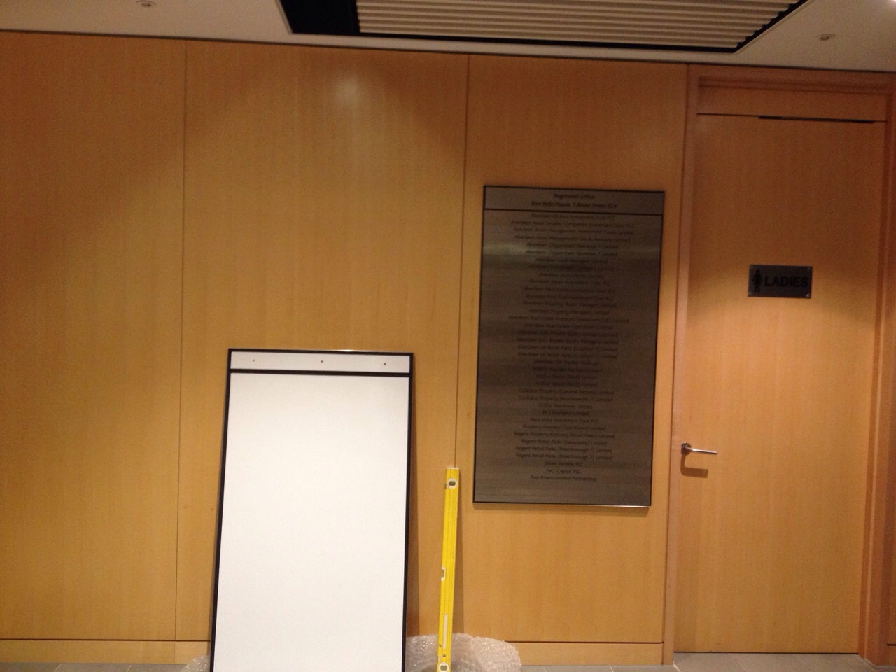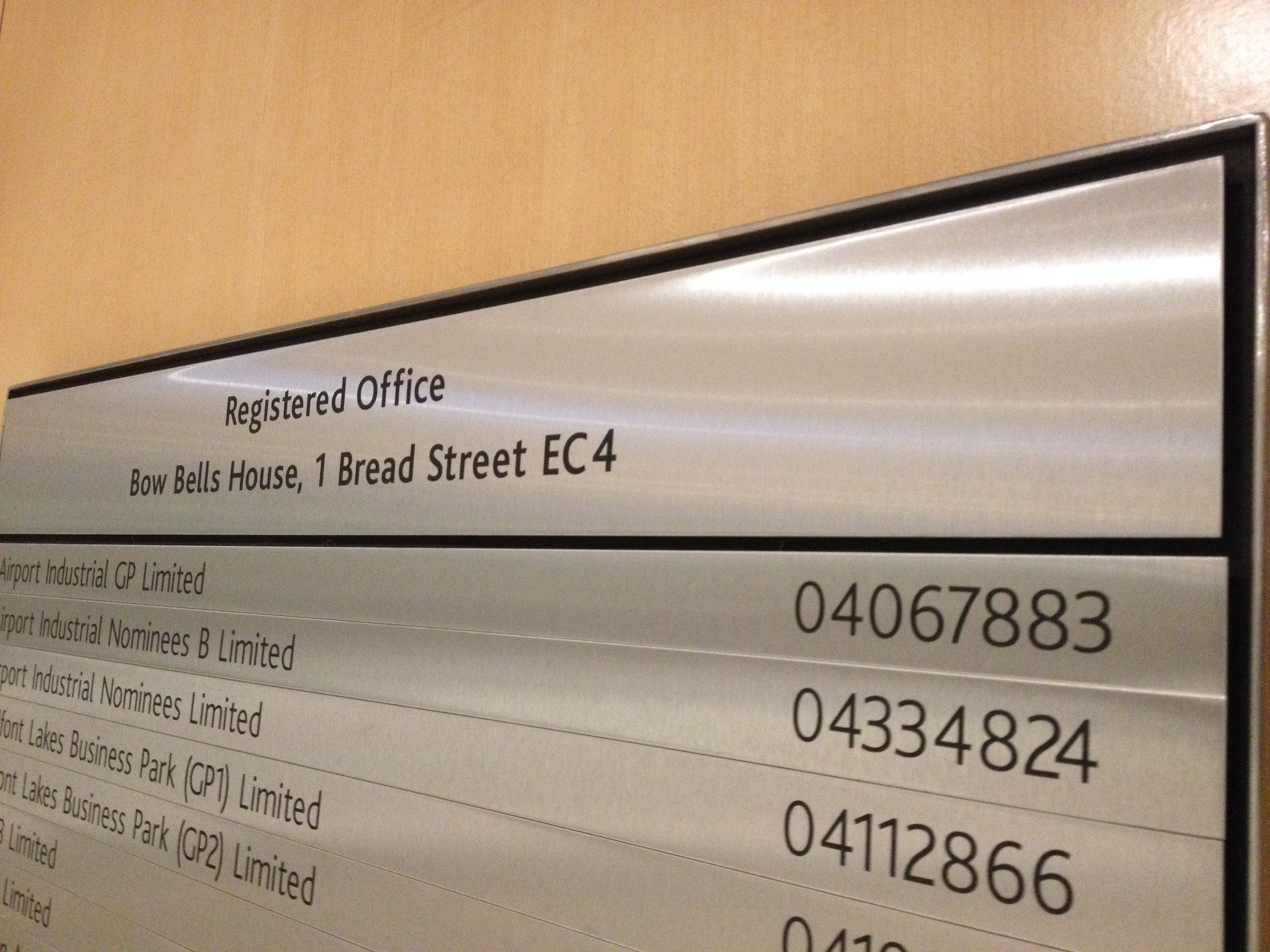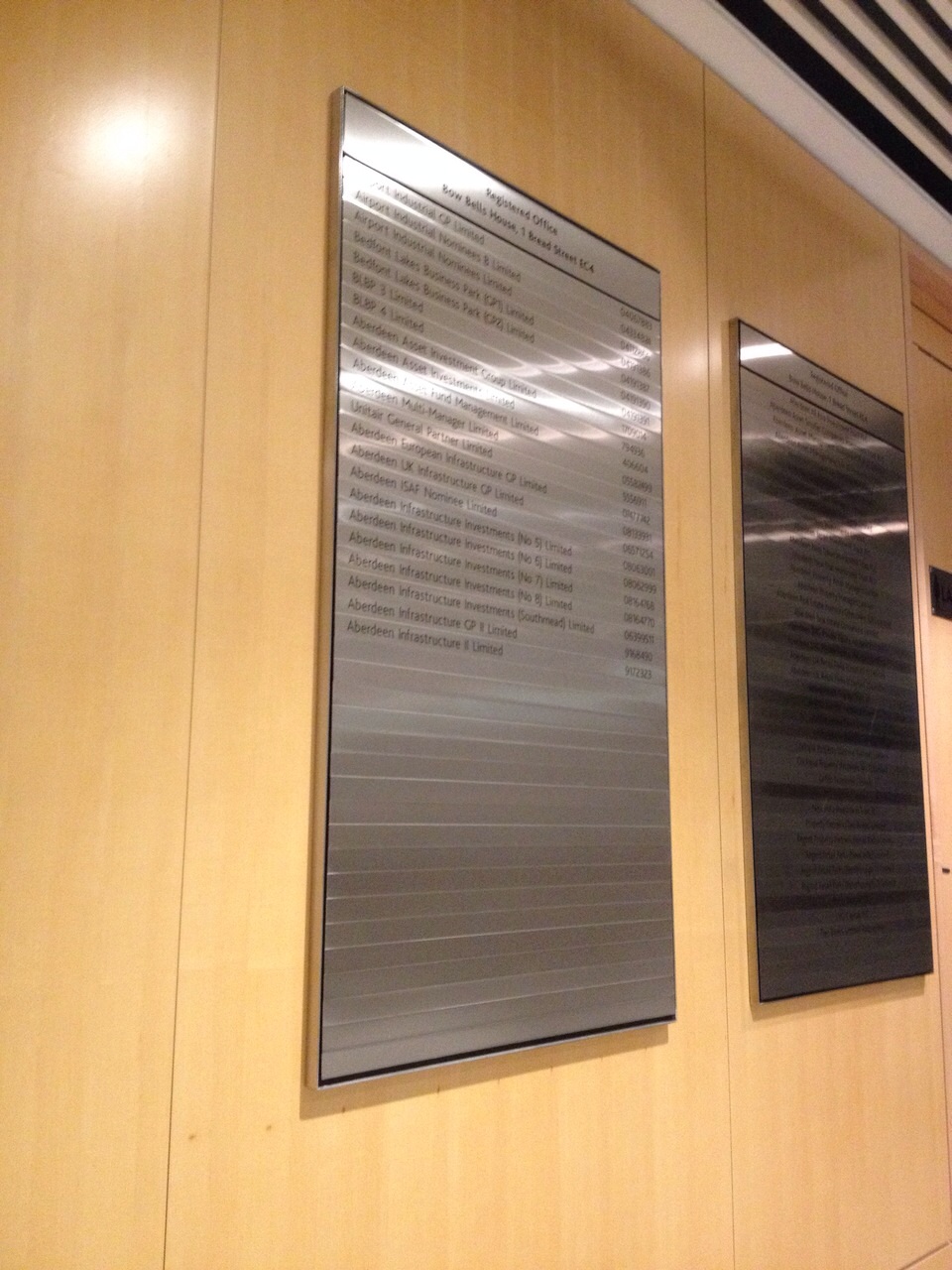 City of London Registered Office Sign List of company names sign board in stainless steel at entrance to company offices. Corporate SignsReception signsMetal SignsDirectory and modular signsDoor SignsOffice Signs Share this sign