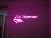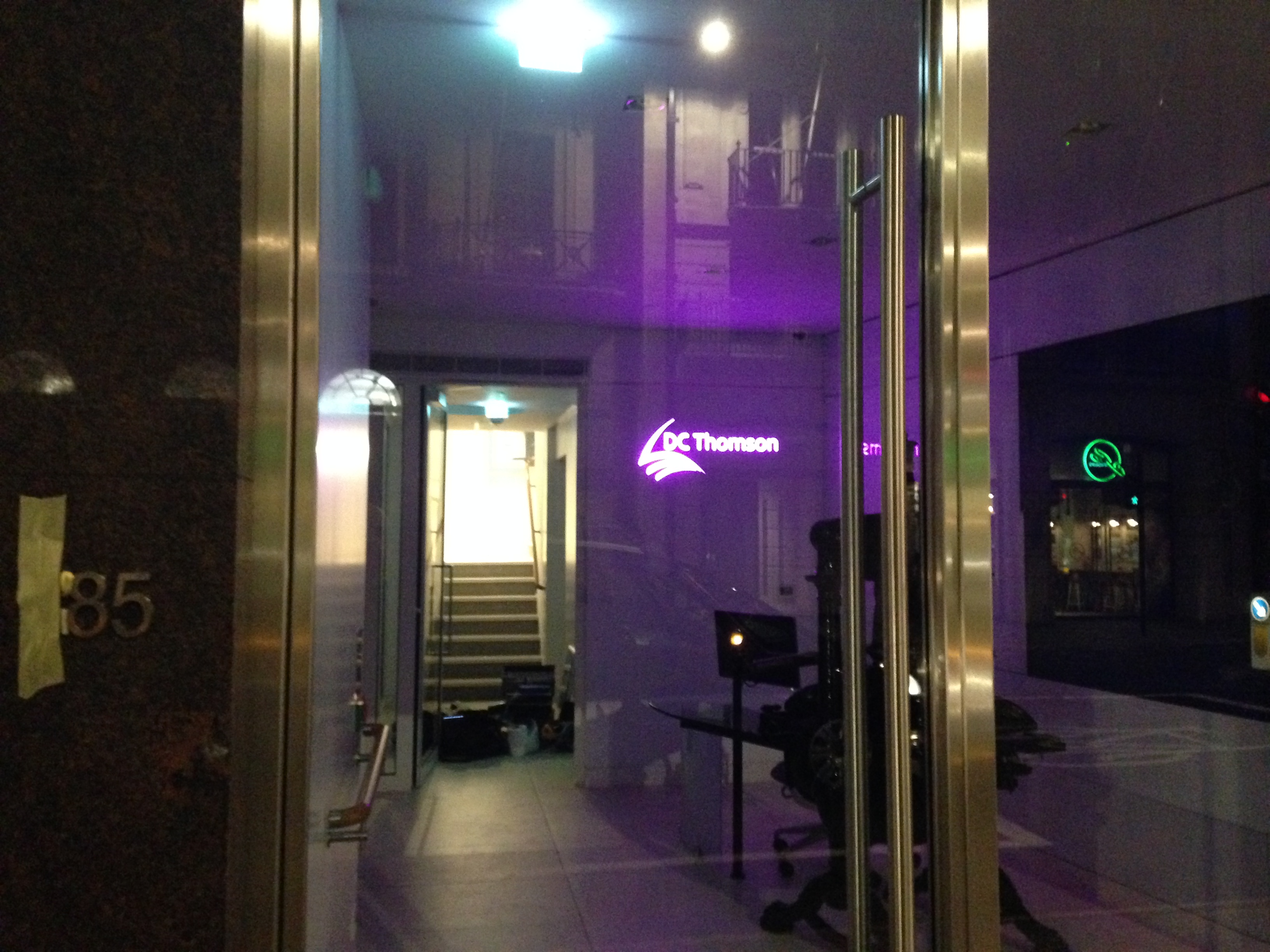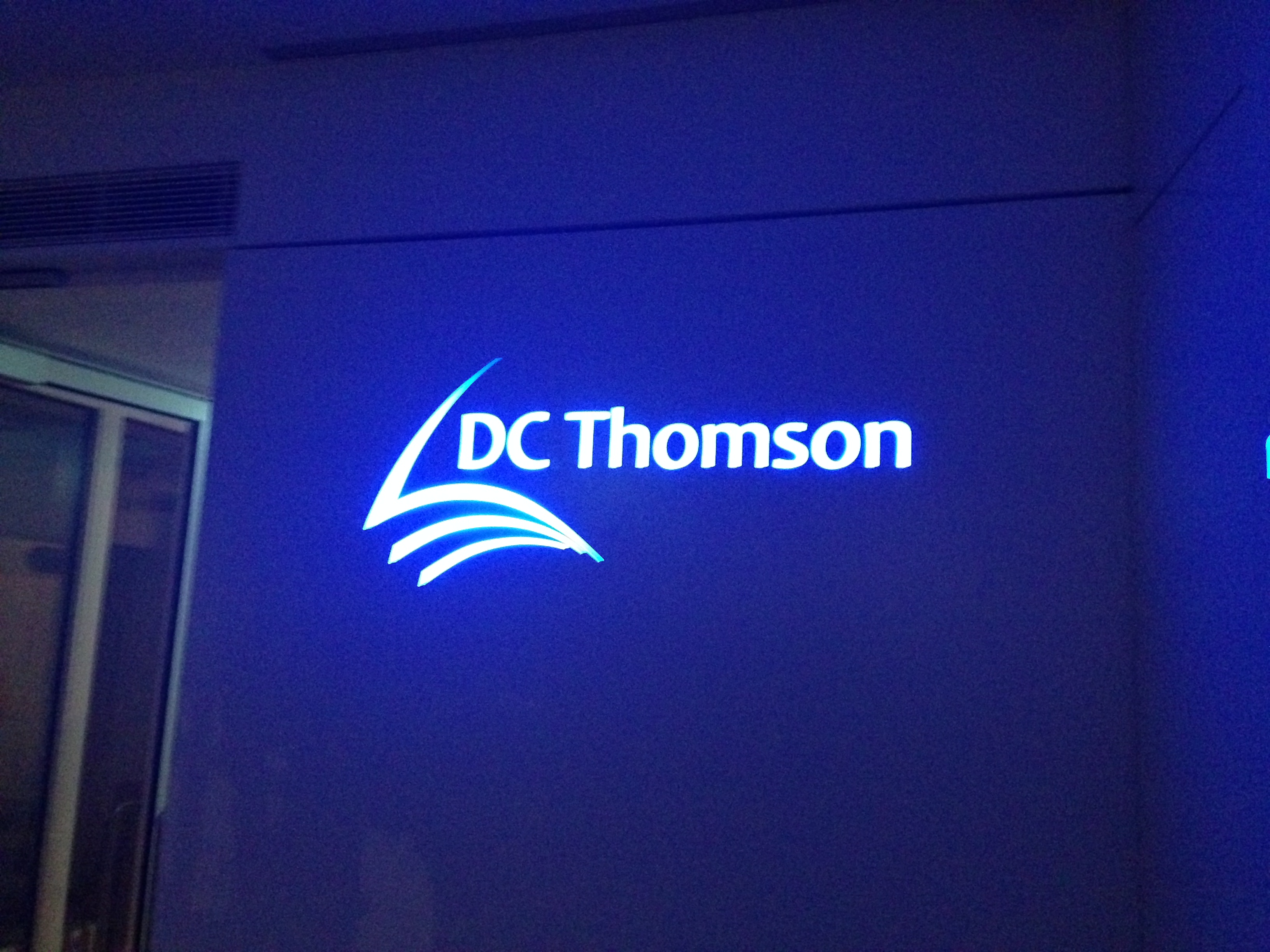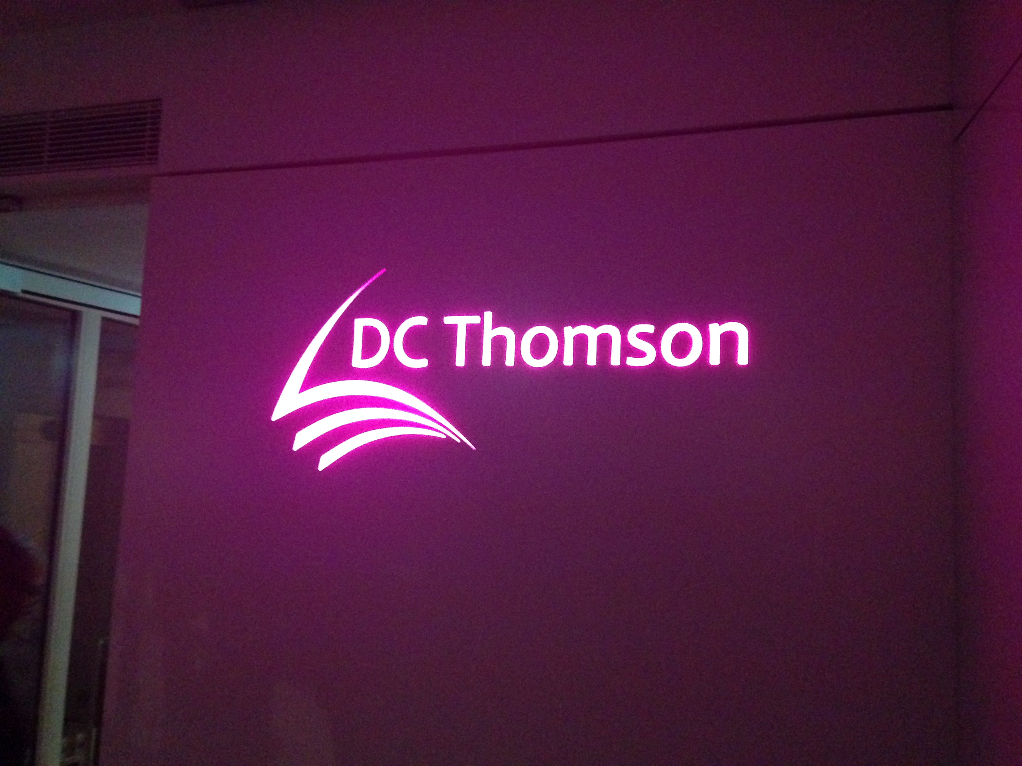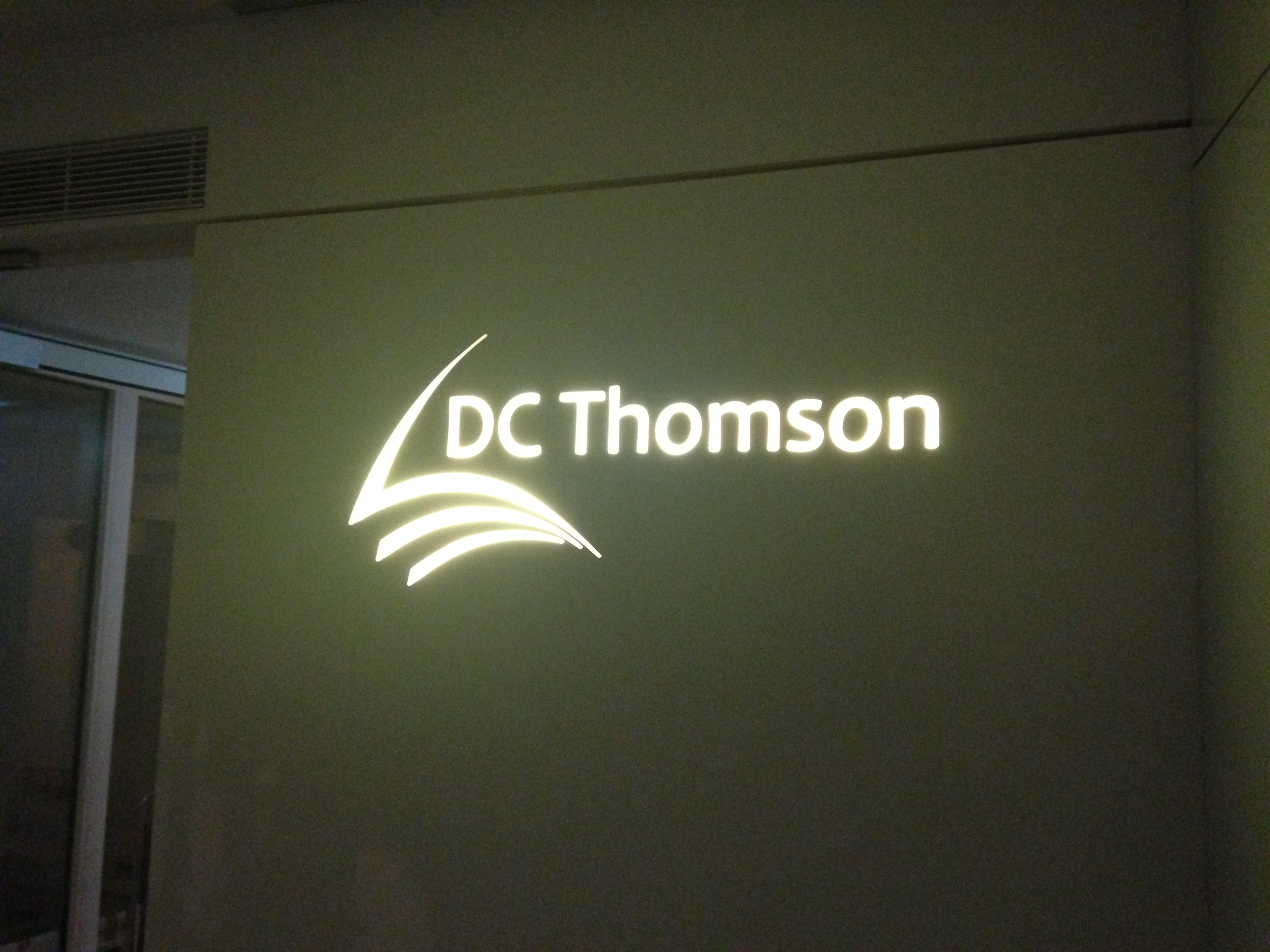 This reception sign features RGB colour change LEDs mounted behind a cut panel of MDF to display the corporate brand flush with interior wall. The LEDs rotate through a number of chosen corporate colours on a loop. We installed a replacement set of LED lights ready to be switched on in the event the original LEDs failed, effectively doubling the sign's shelf life.