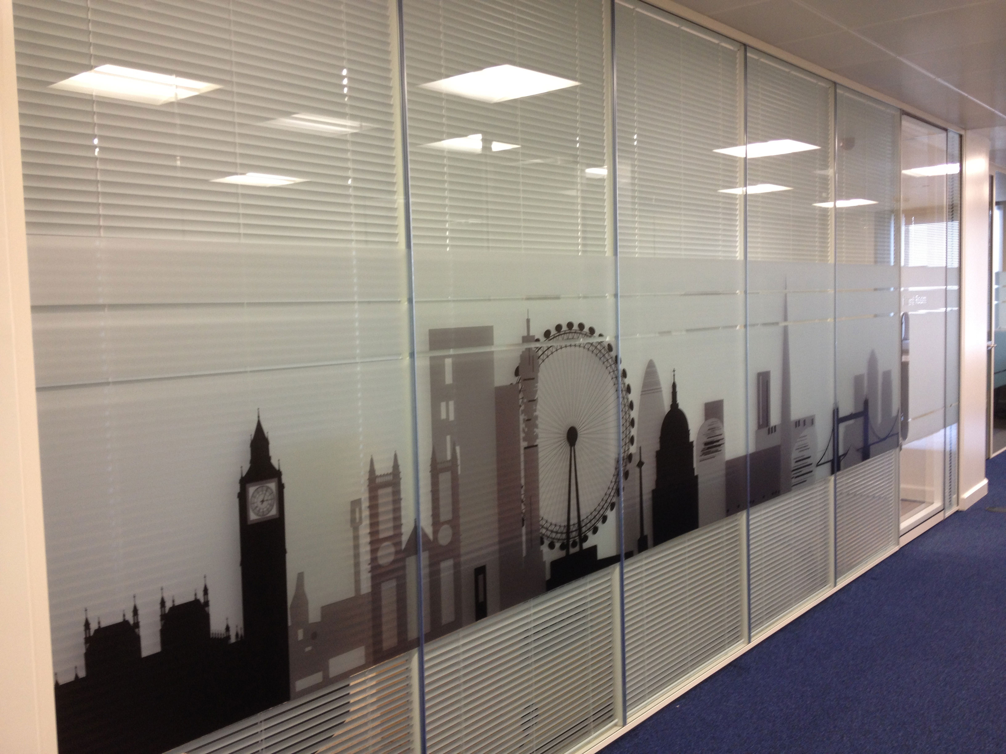 Digitally printed frosted manifestations help you to depict more detailed images and scenes within your internal office space. Canada Life chose to pick out the skylines of the cities in which they are located globally on various of their internal office glass partition walls.