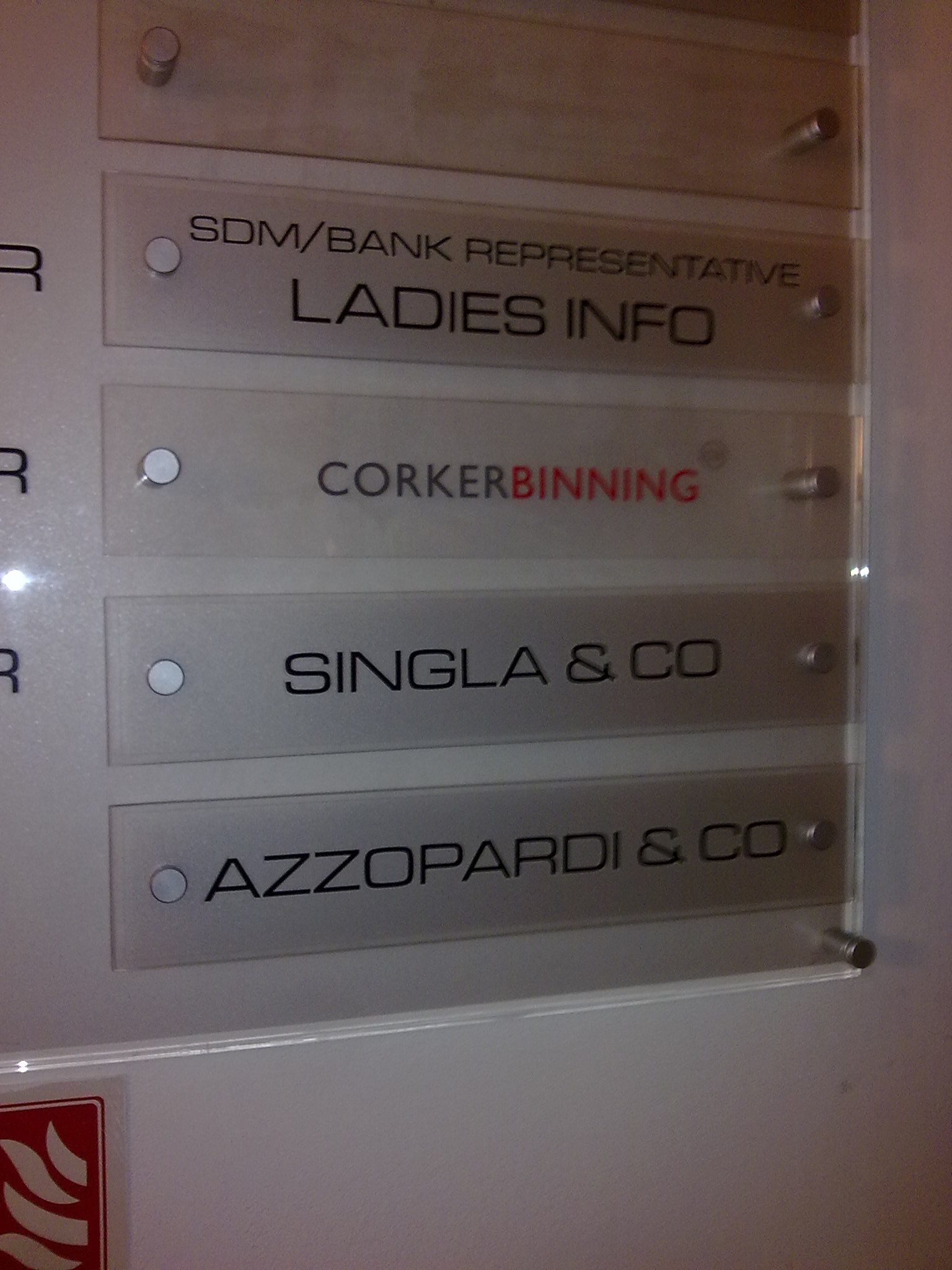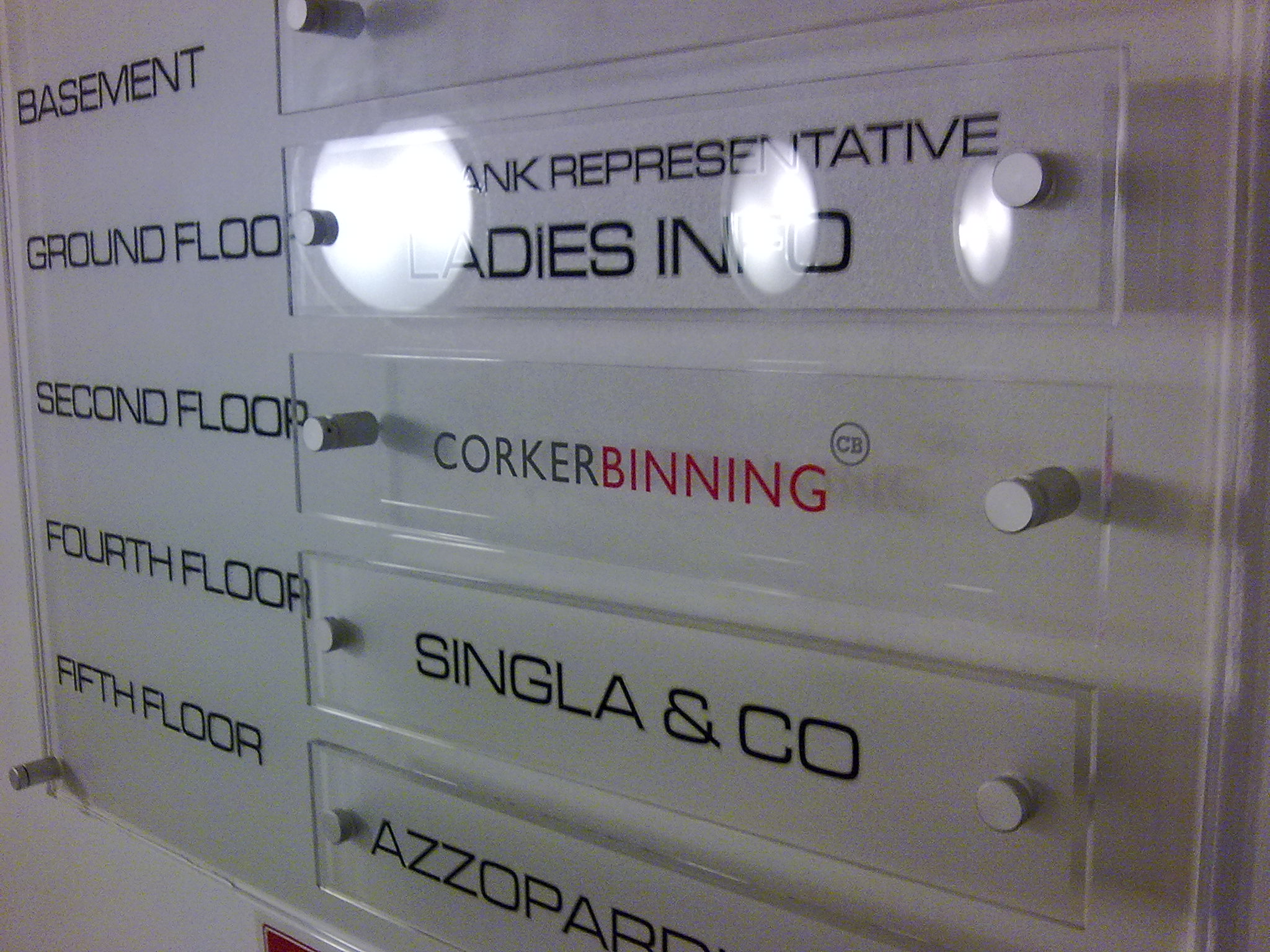 Glass effect directory sign Acrylic (clear) glass effect office directional sign mounted on interior office wall. Glass and glass-look acrylic signsDirectory and modular signsOffice Signs Share this sign