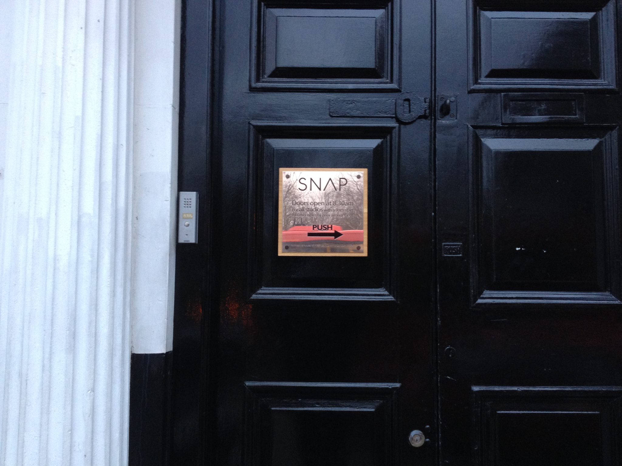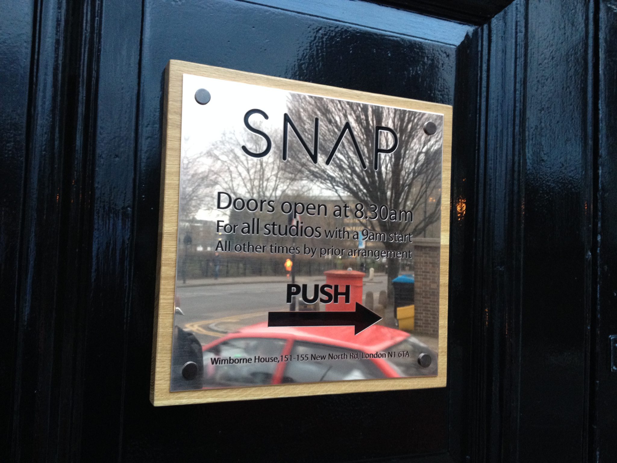 Door Sign (Snap) Door sign fixed to large wood panel door mounted on beech veneer base with detail in black paint. We can achieve total precision when acid etching is used to draw typography and images into metal plaques. Door SignsOffice SignsPlaques Share this sign