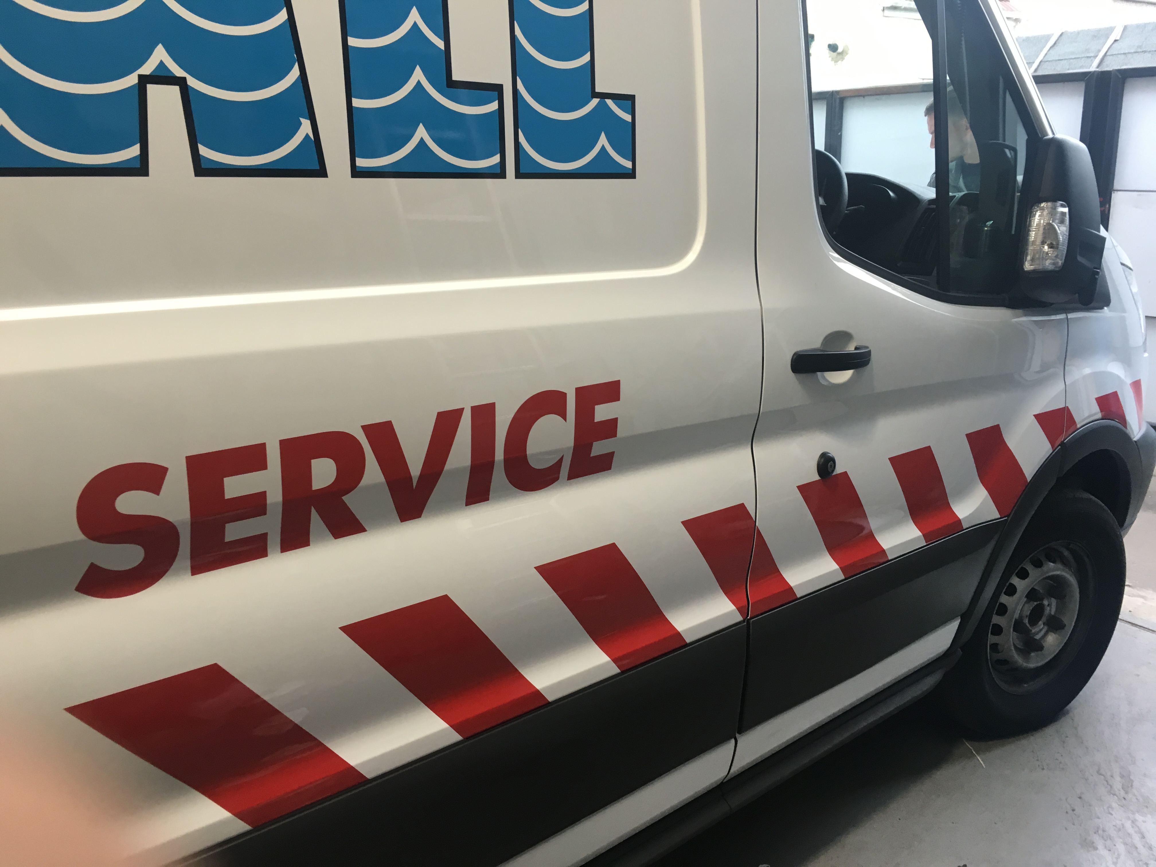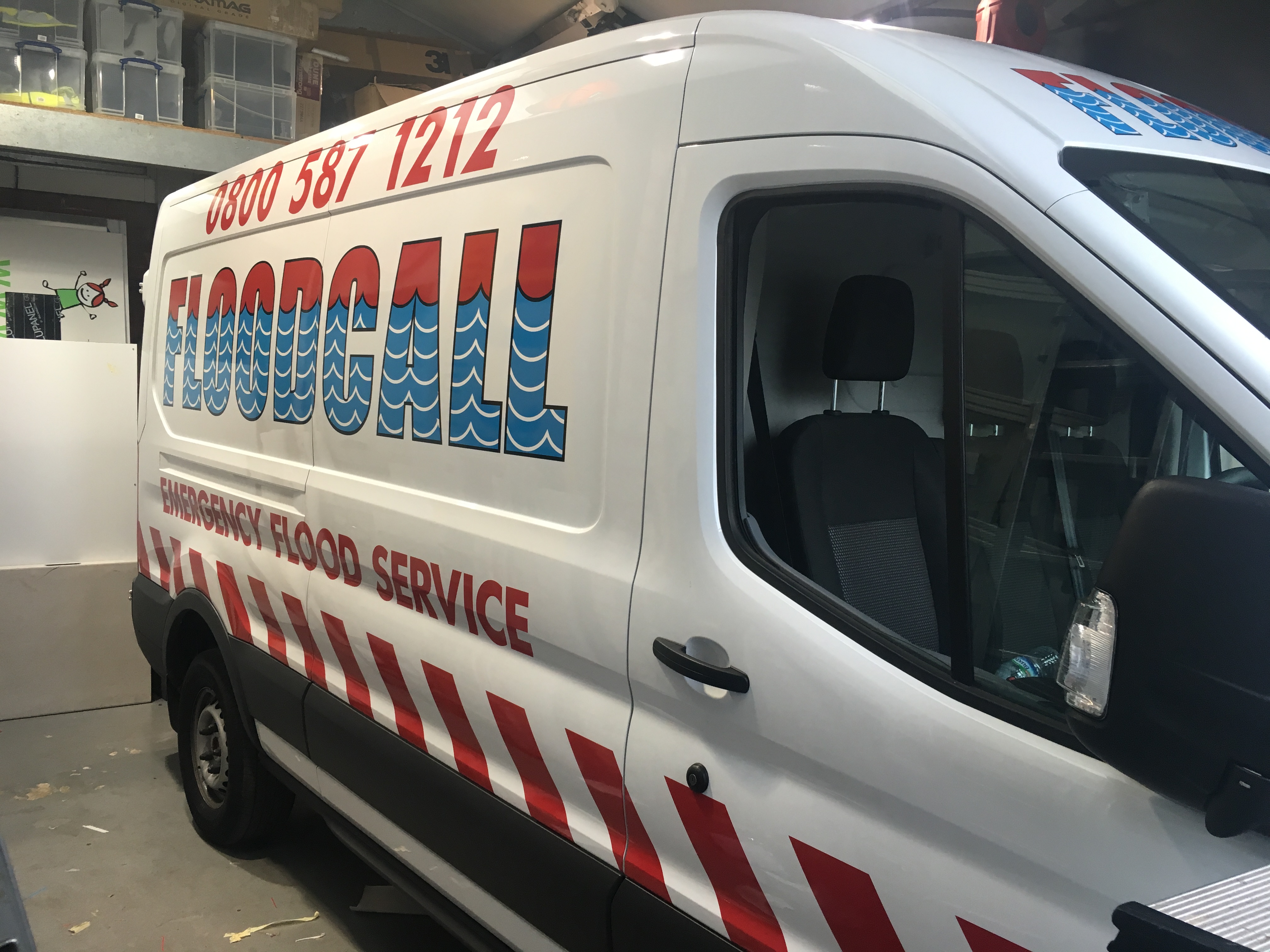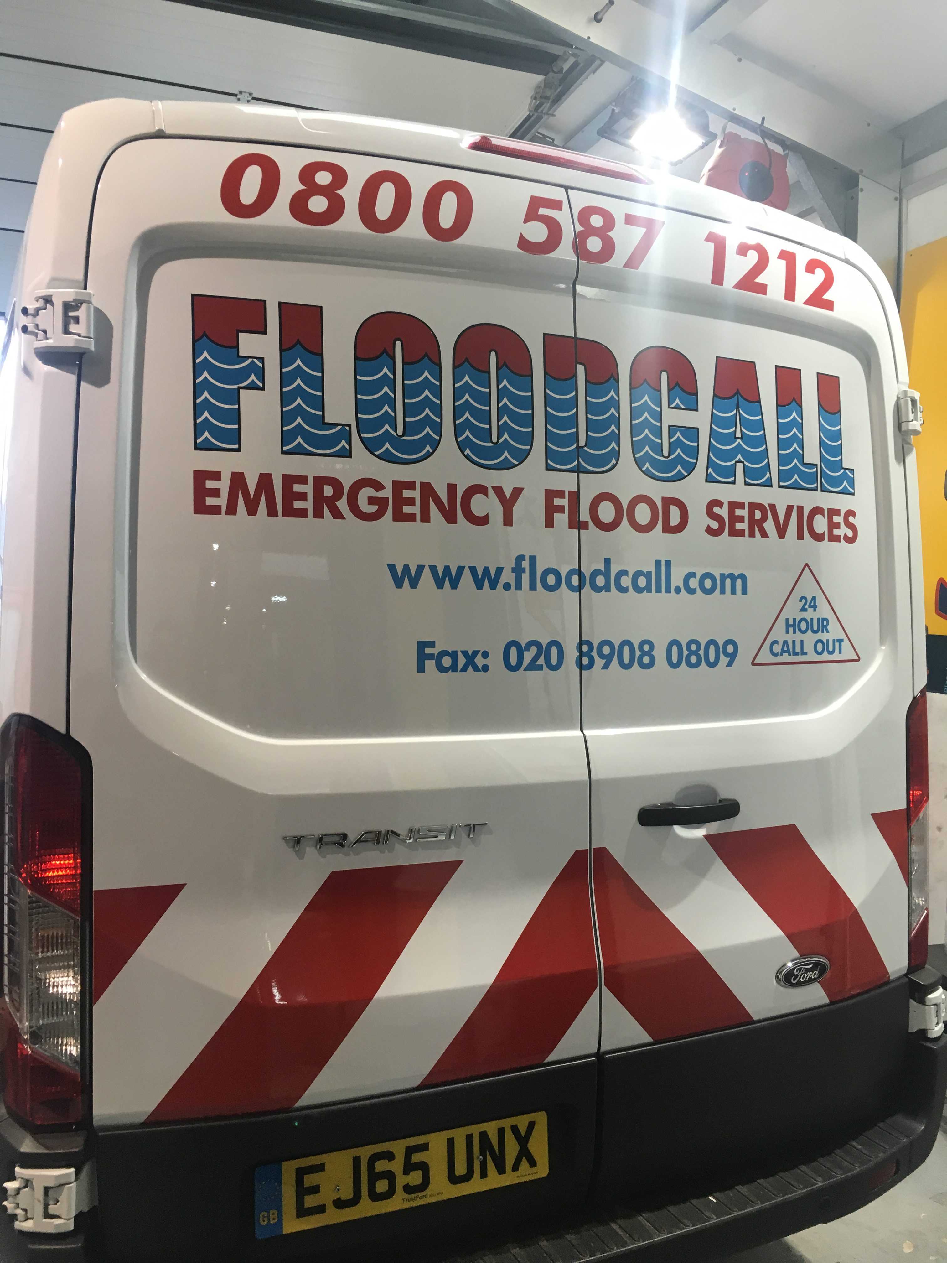 Emergency Response Vehicle Graphics Emergency response van with cut out vinyl graphics in three colours. Red chevron van graphics on the rear portion for London Flood Services company. Vehicle GraphicsVan Signs Share this sign