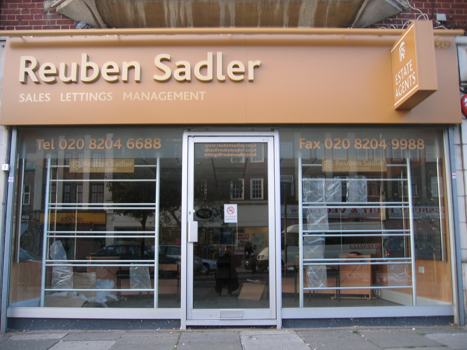 Estate Agent Shop Sign with Projection Sign A folded aluminium tray with built up painted metal letters and a projection sign also carrying the corporate logo for a London estate agent. Shop SignsProjection Signs Share this sign