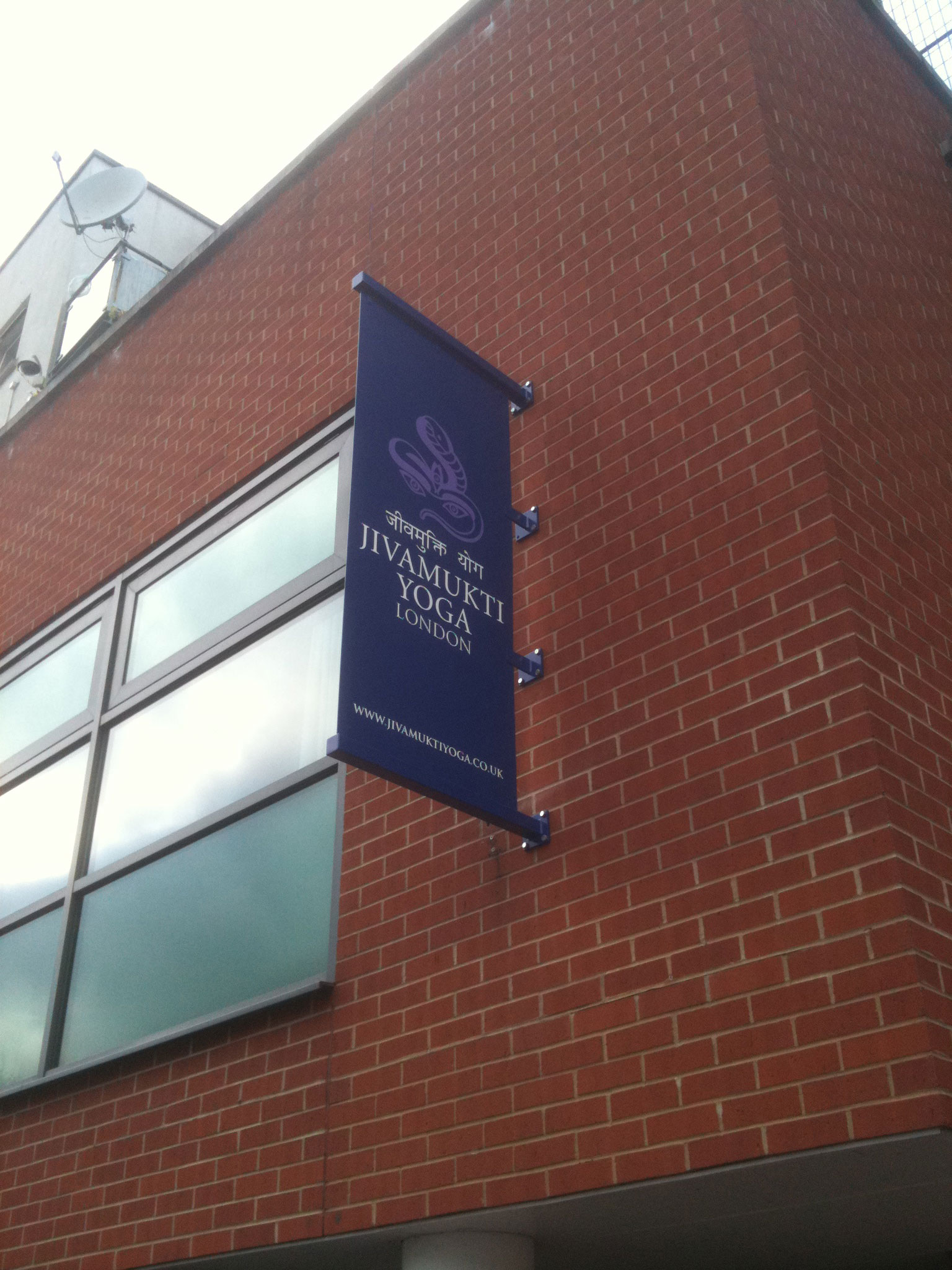 Rigid Yoga Banner Aluminium powder-coated, rigid metal banner projected from side of yoga studio to advertise yoga classes. Logo is digitally printed and then stuck to both sides. Vinyl BannersDigitally printed colour graphicsHealth and Wellbeing Share this sign