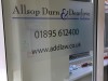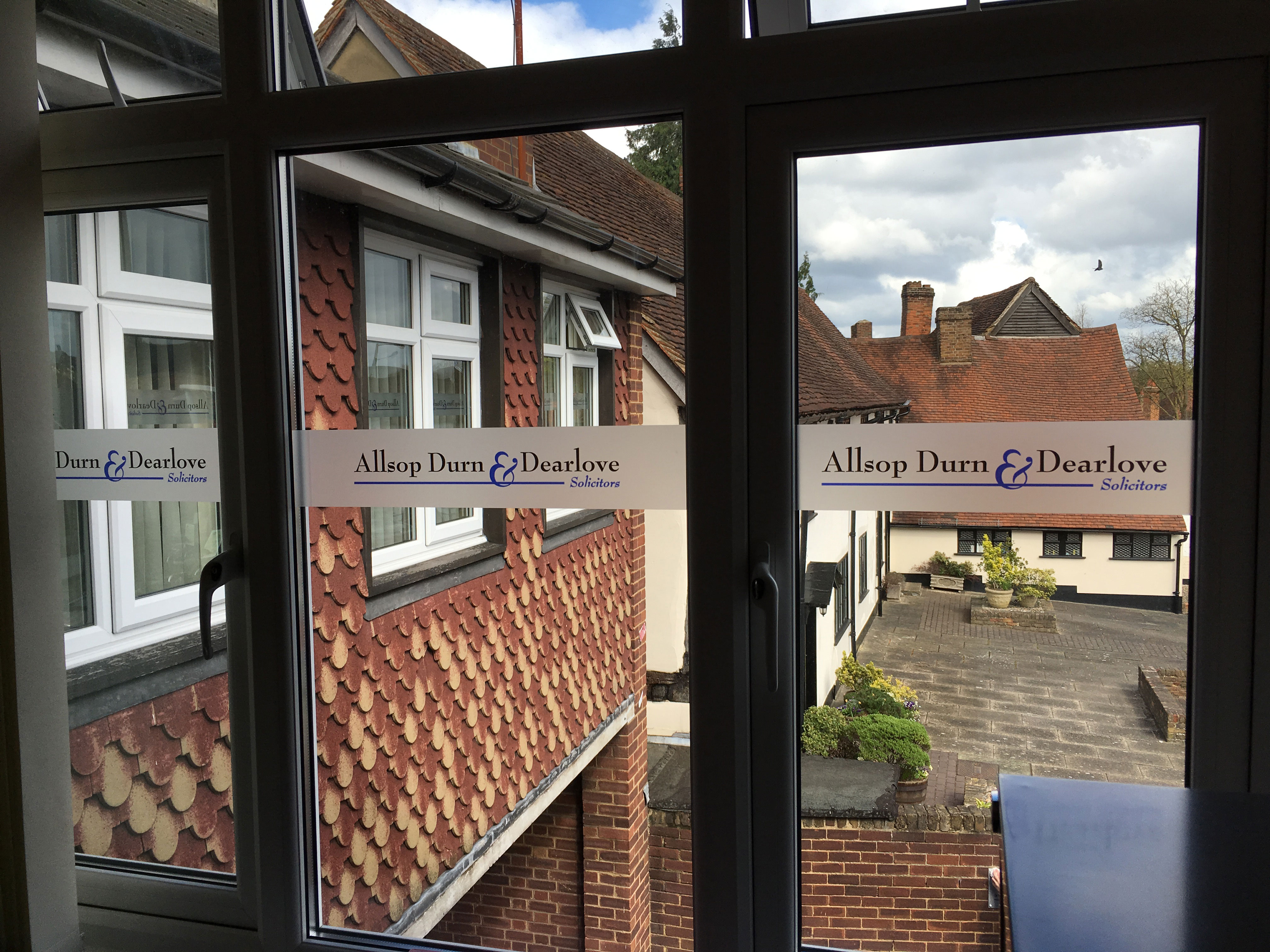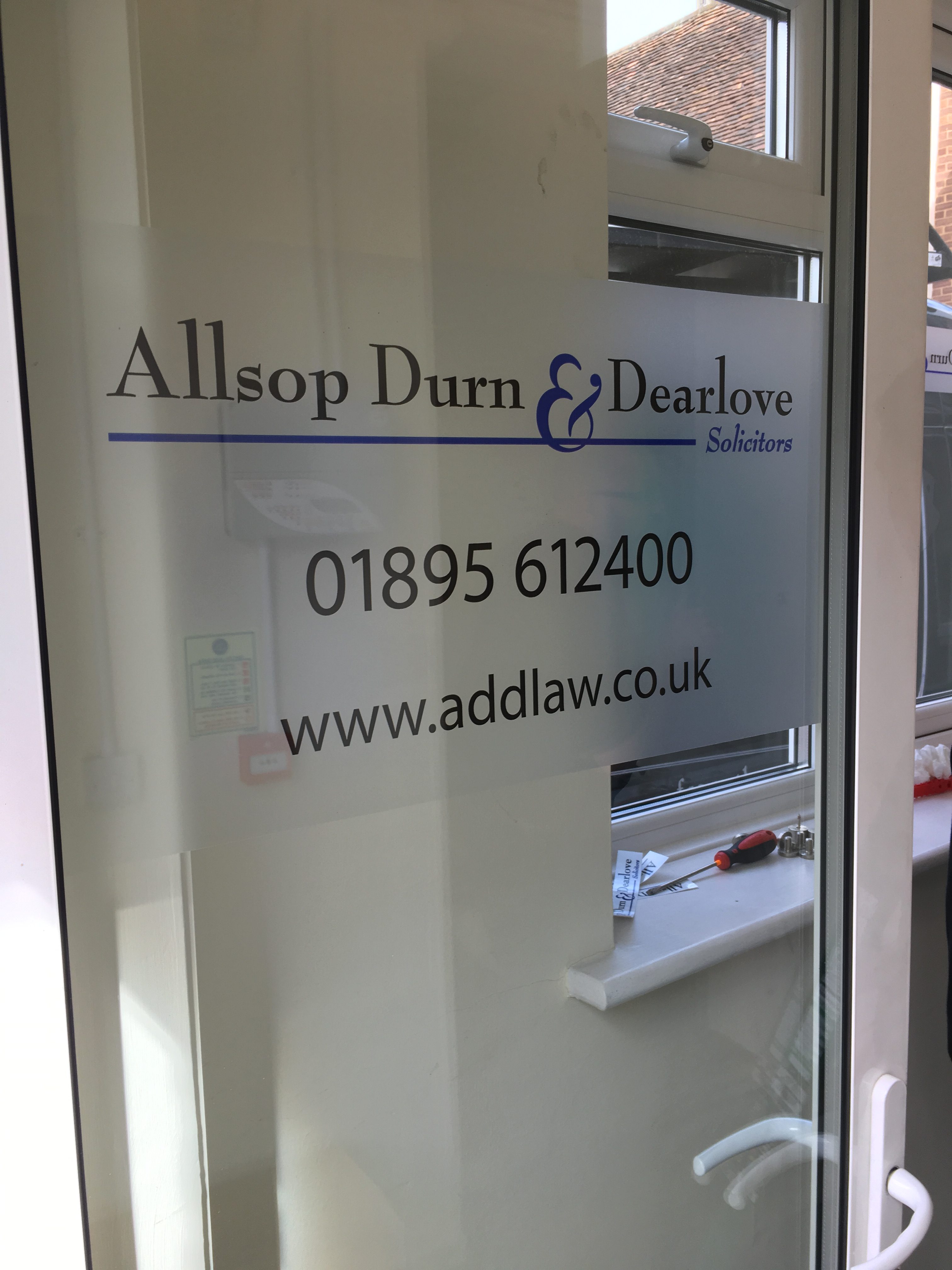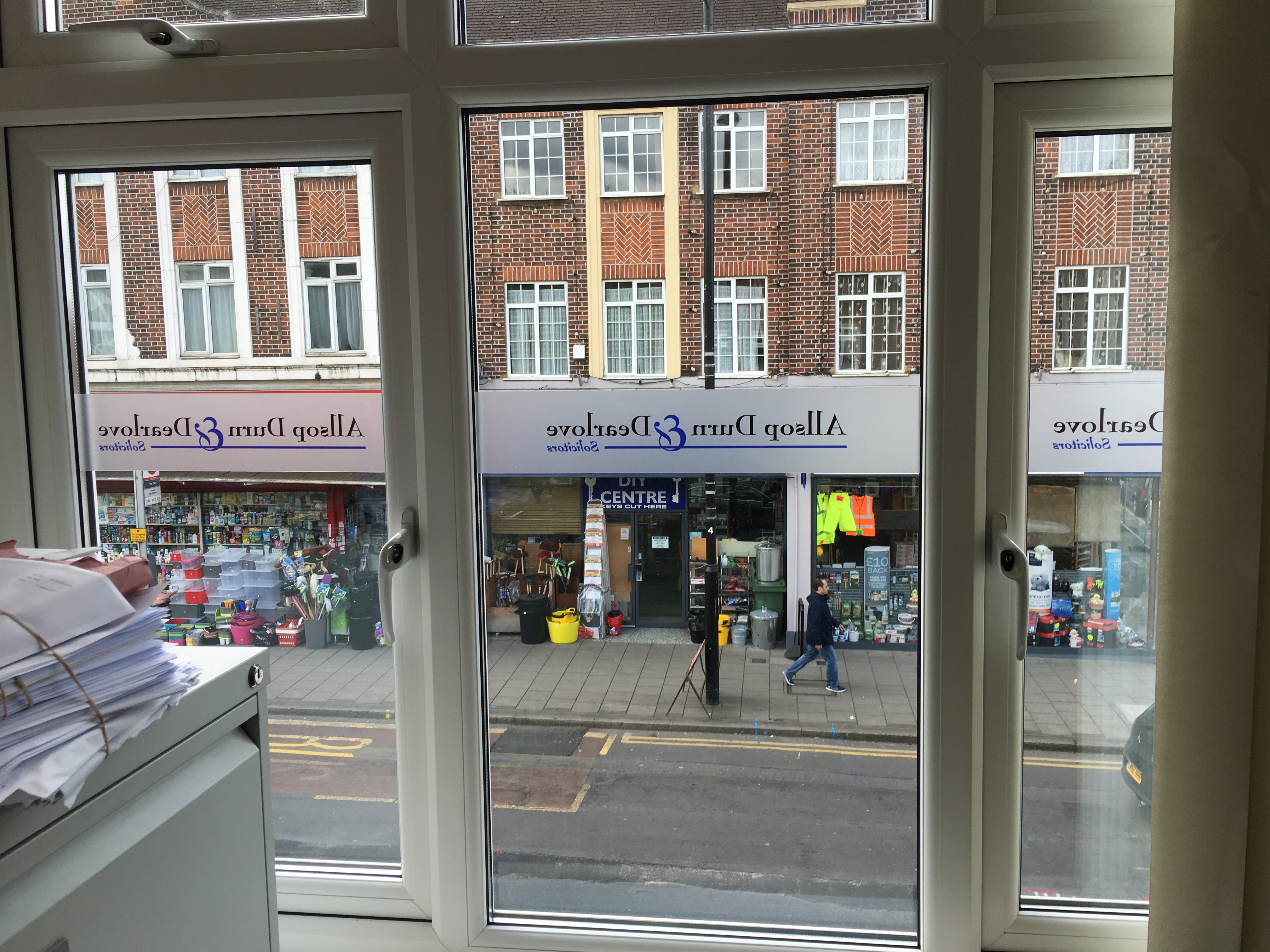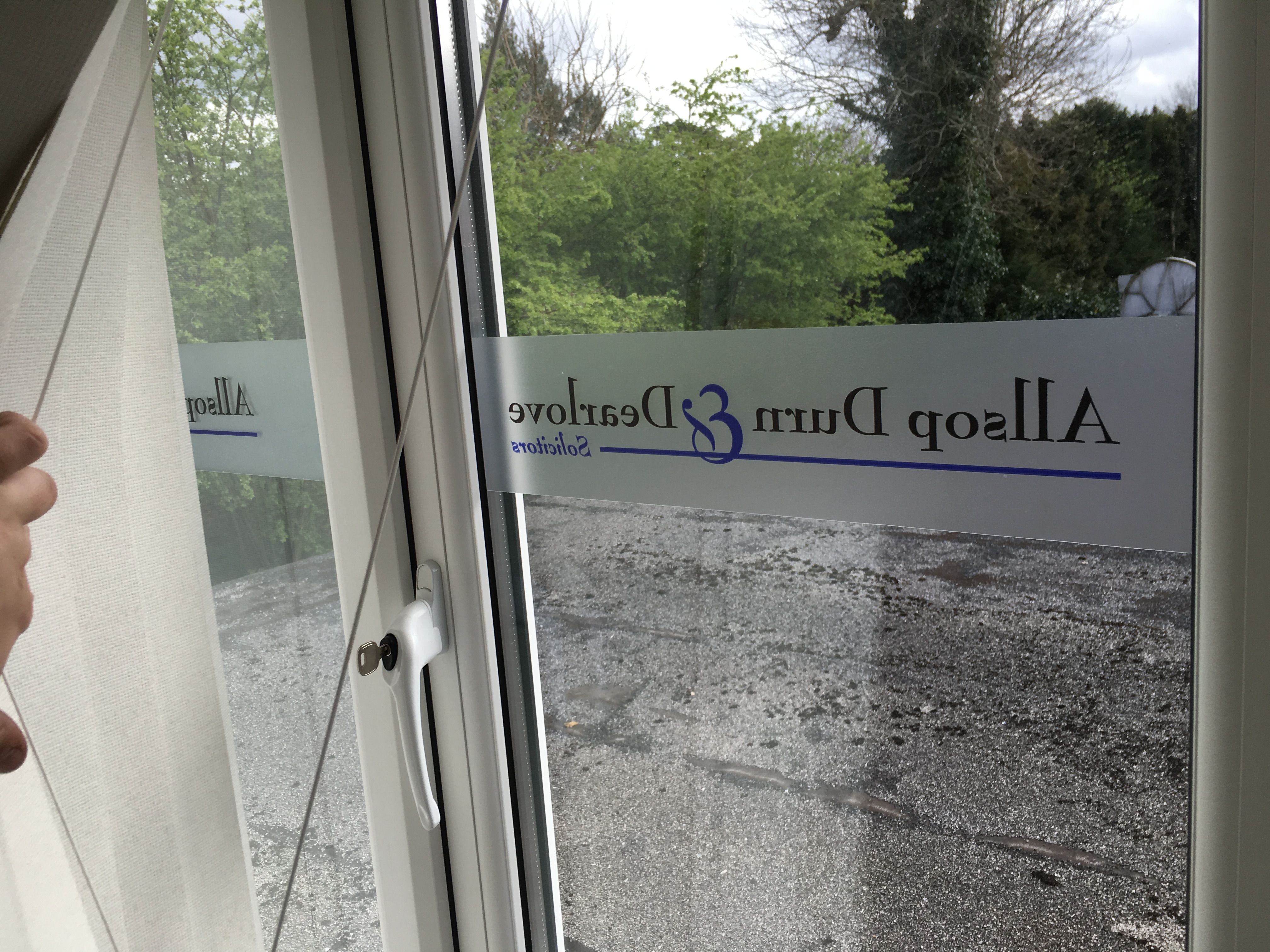 Frosted Window Logo For Solicitors Frosted window film with two colour digital printed overlay for firm of high street solicitors. Shop window sign. Frosted glass and manifestationsWindow GraphicsOffice Signs Share this sign