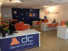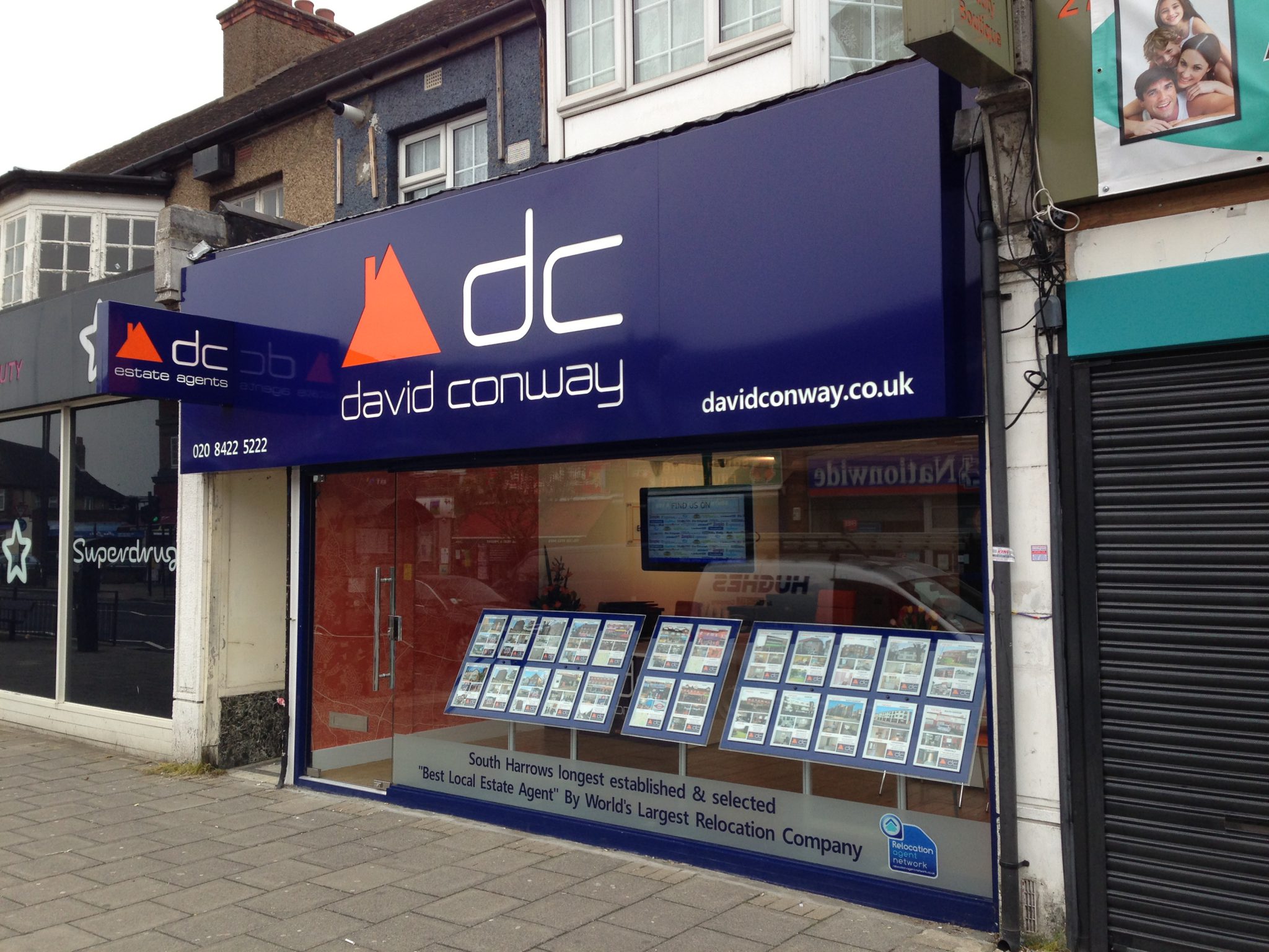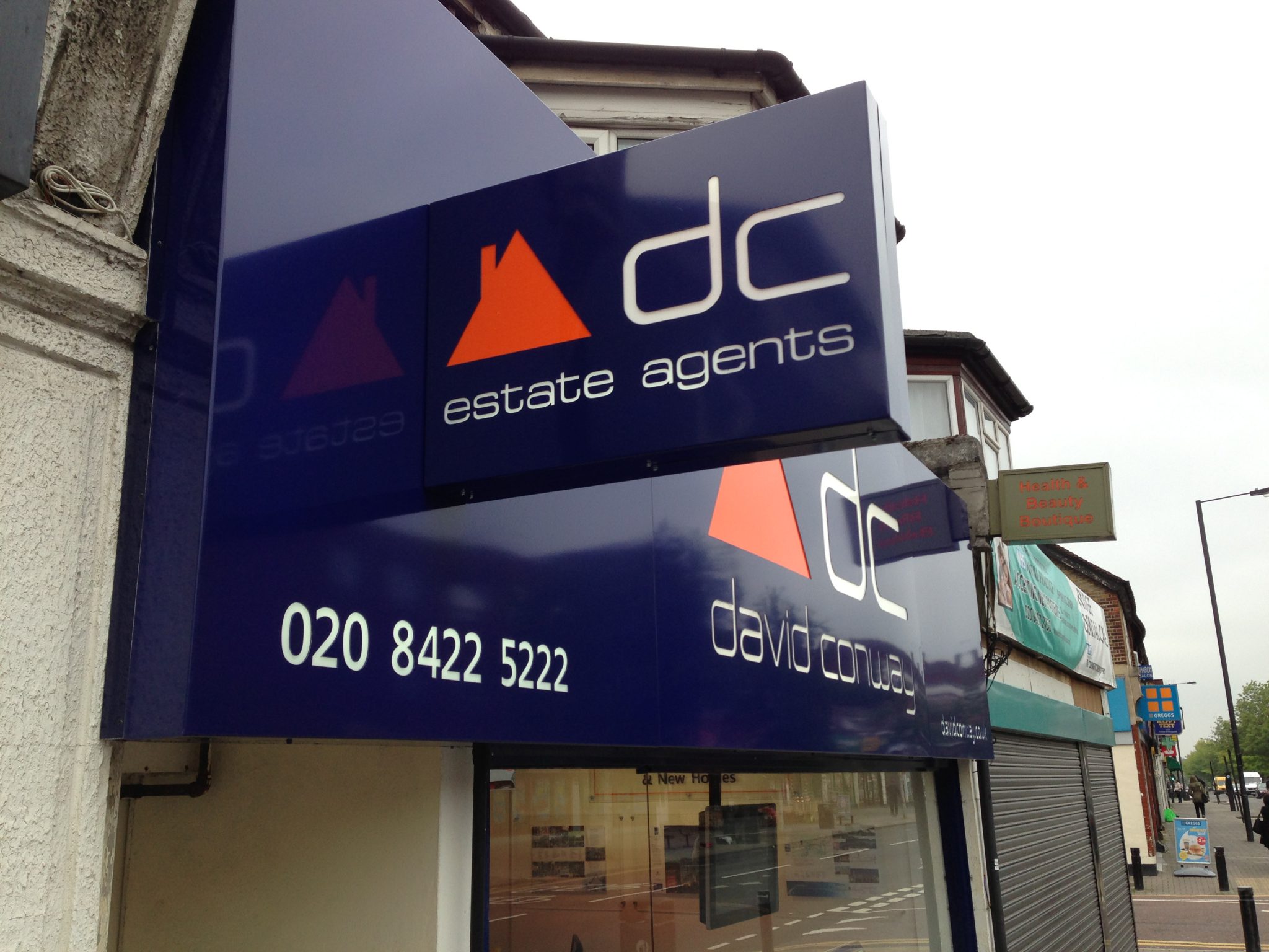 Projection sign and stencil cut, back-lit illuminated shop fascia sign for London estate agent. Internal signs also fitted such as acrylic logo panel and vinyl graphics mounted to solid colour wall.