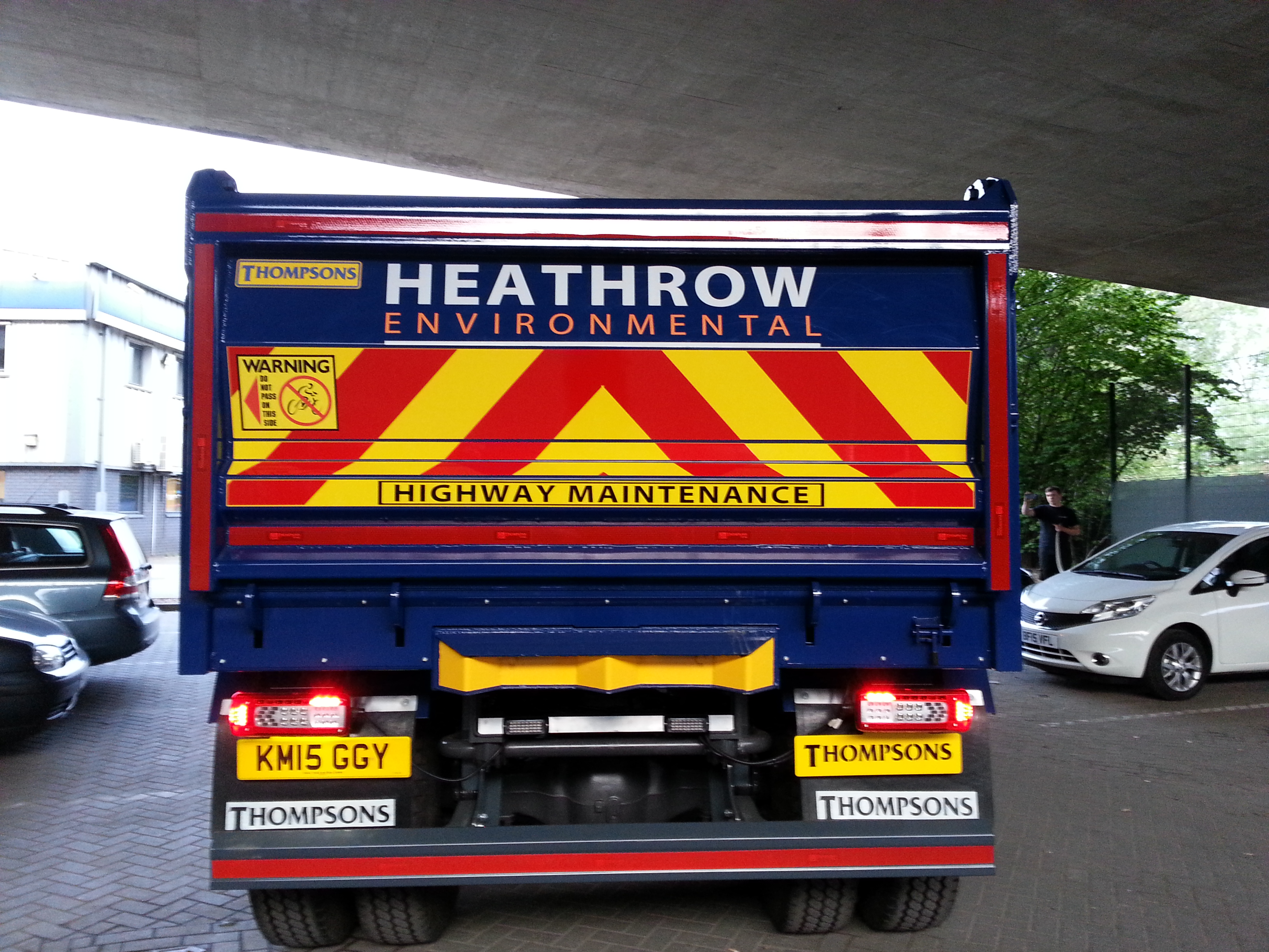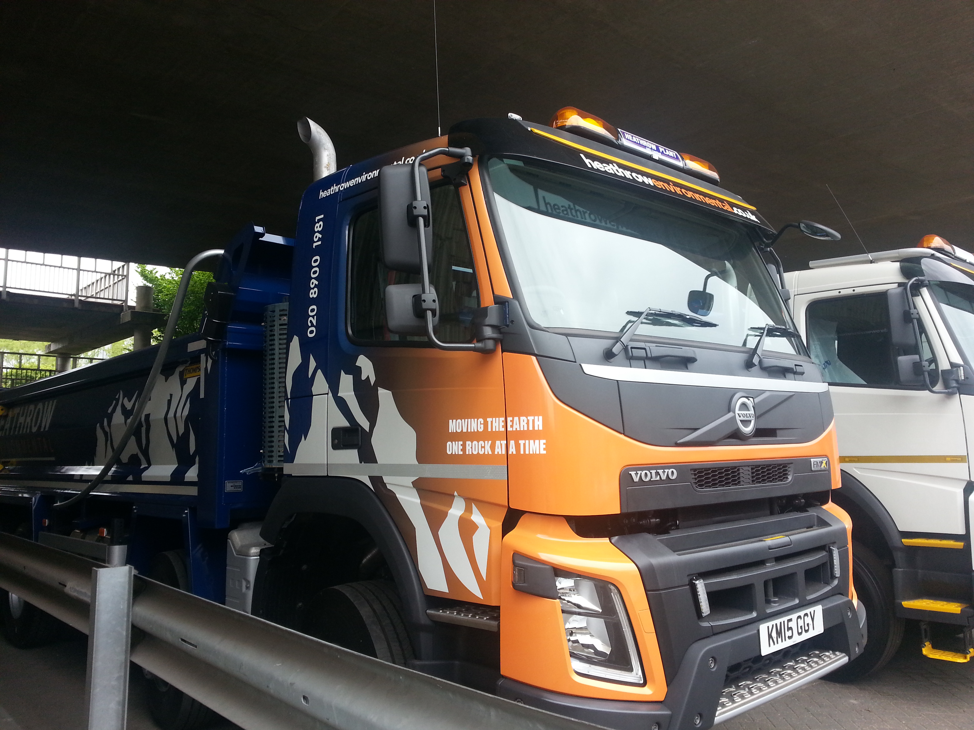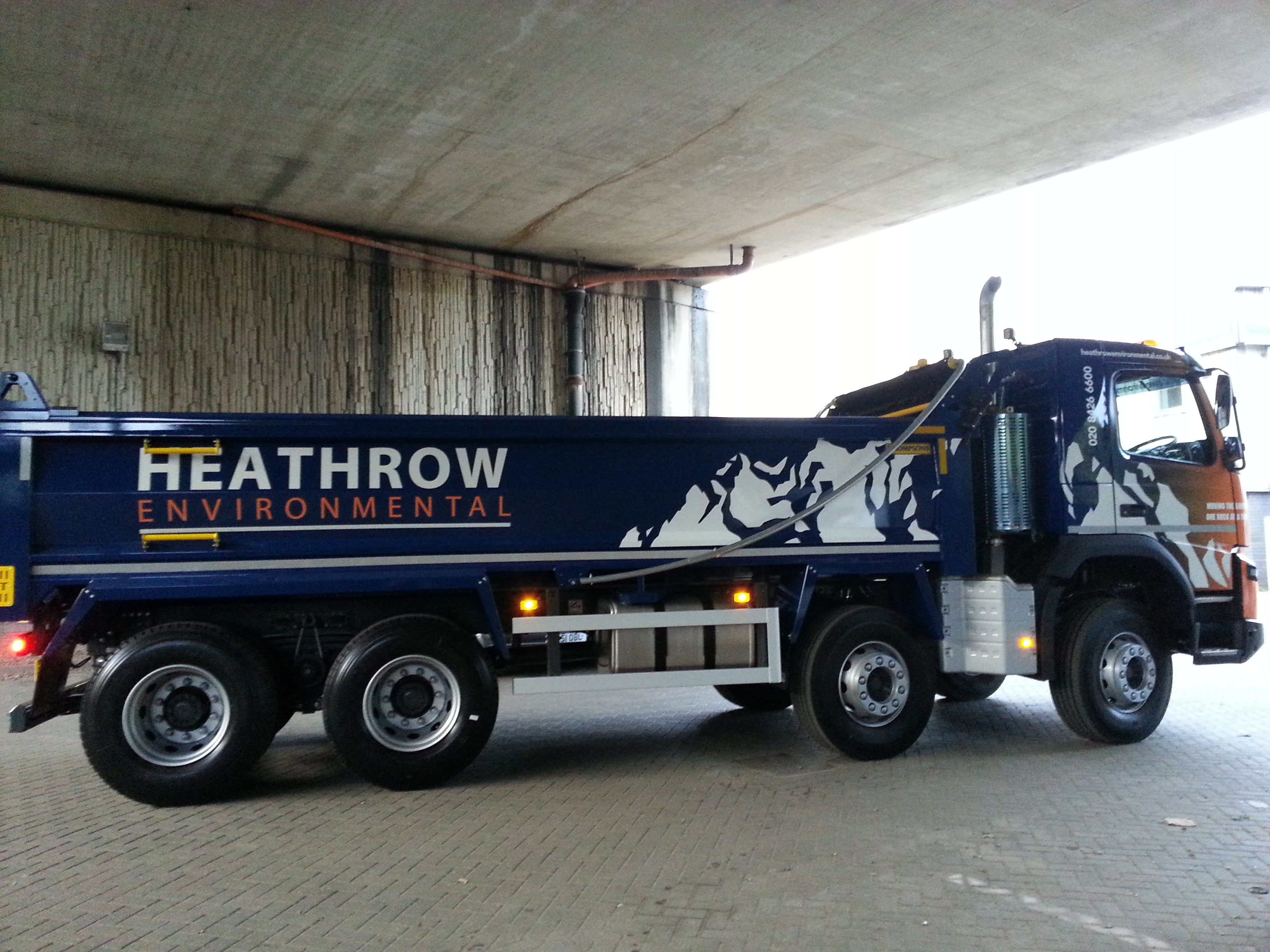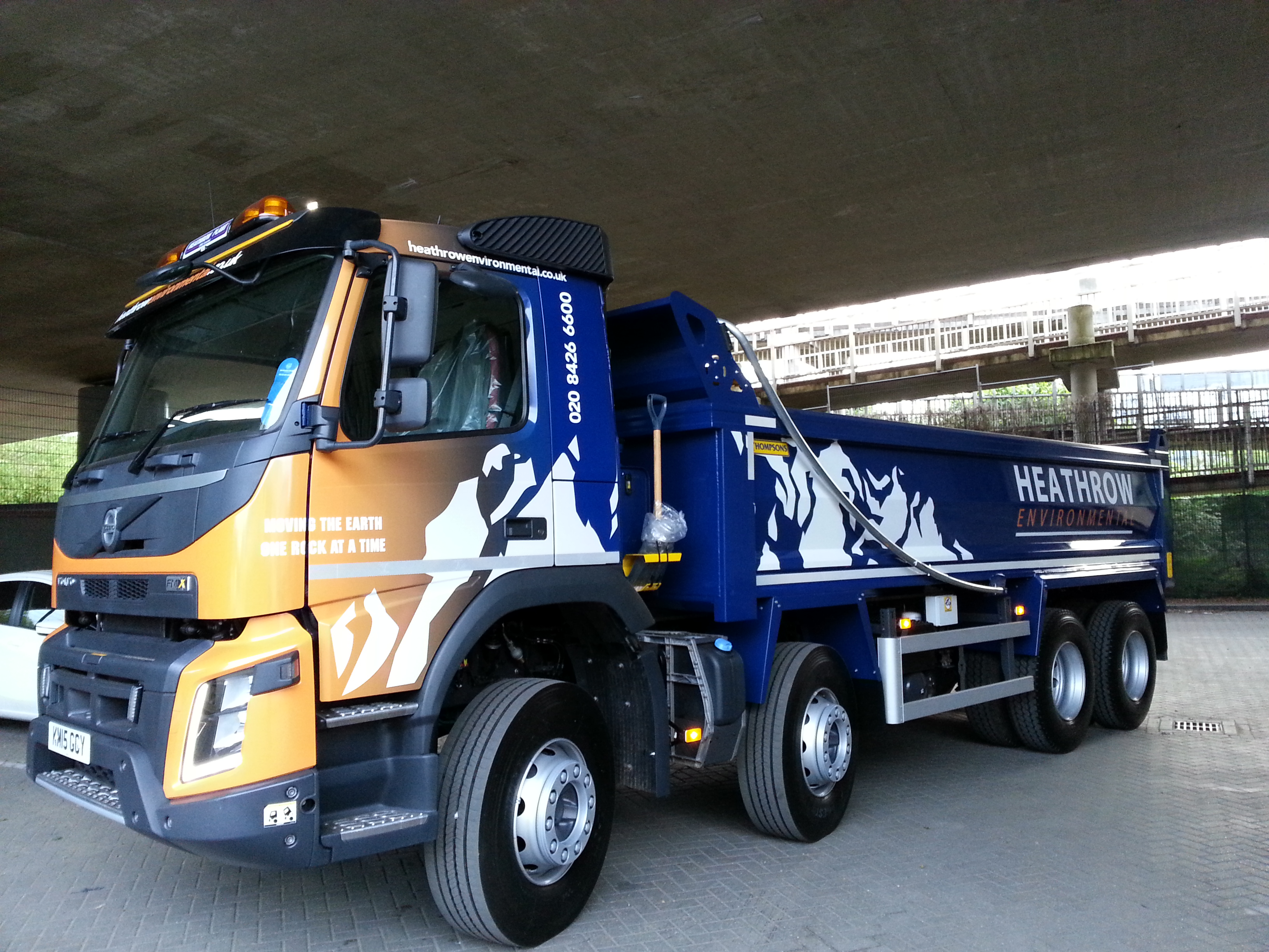 Heathrow Tipper Truck Vehicle Wrap HGV vehicle wrap tipper lorry with full cab sign coverage. Vinyl graphics to rear and reflective chevron back. Vehicle GraphicsPlant and HaulageWrapLorries and Commercial VehiclesChevron Share this sign