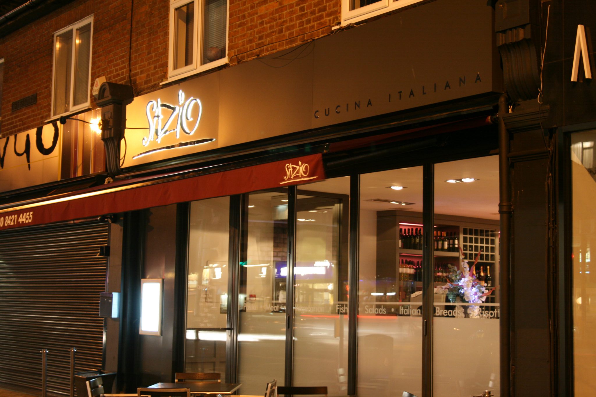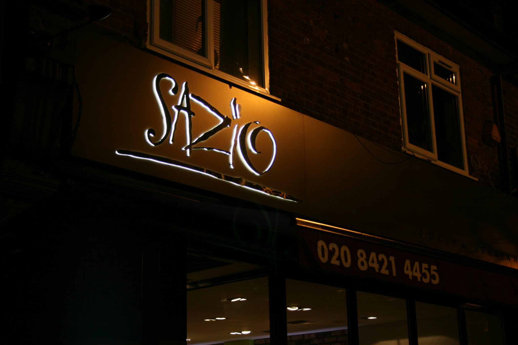 Illuminated Italian Restaurant Sign Stencil cut shop fascia with LED back-lighting. Rough edge creates organic, rustic feel to suit the theme of the brand. Shop SignsIlluminated LED and neon signs Share this sign agg_homepage agg_shop lightbox