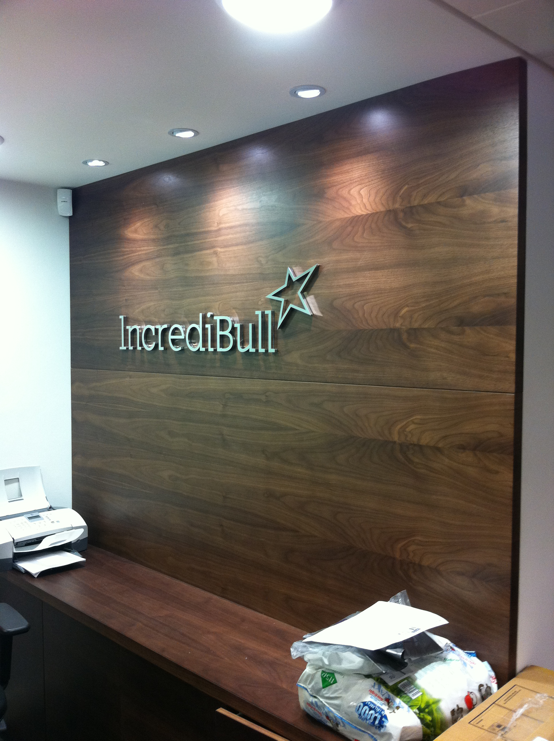 Built up fabricated letters Polished stainless steel letters mounted on walnut veneered wall panel. Corporate SignsReception signsMetal Signs3D Share this sign