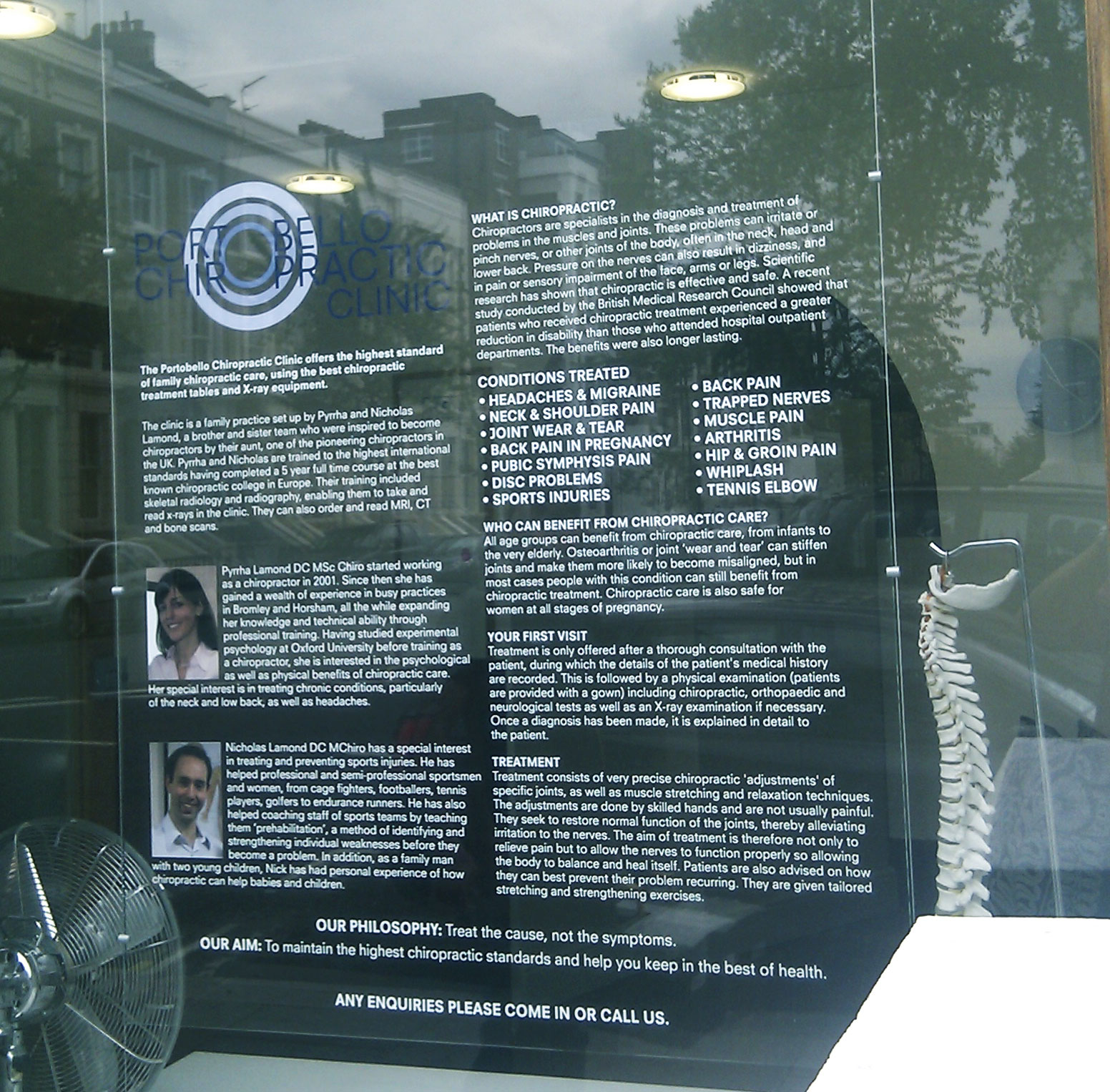 This informational window display panel is a great way of conveying a lot of information about your business from your shopfront. A single sheet of perspex is suspended by stainless steel cables and overlaid with cut out vinyl text. Using a window display rather than a window graphic applied directly to the window has the advantage that it is easier to change/maintain.