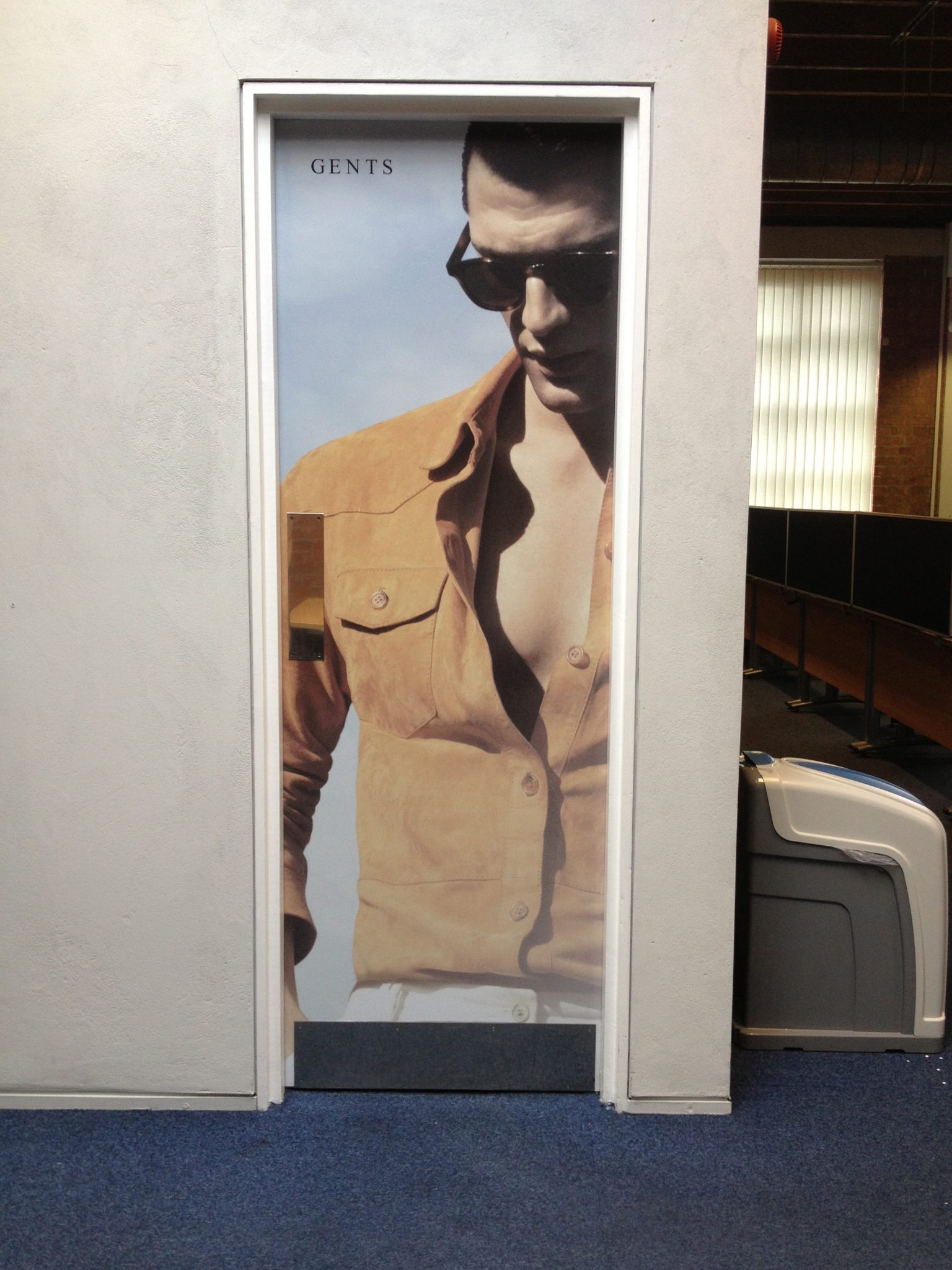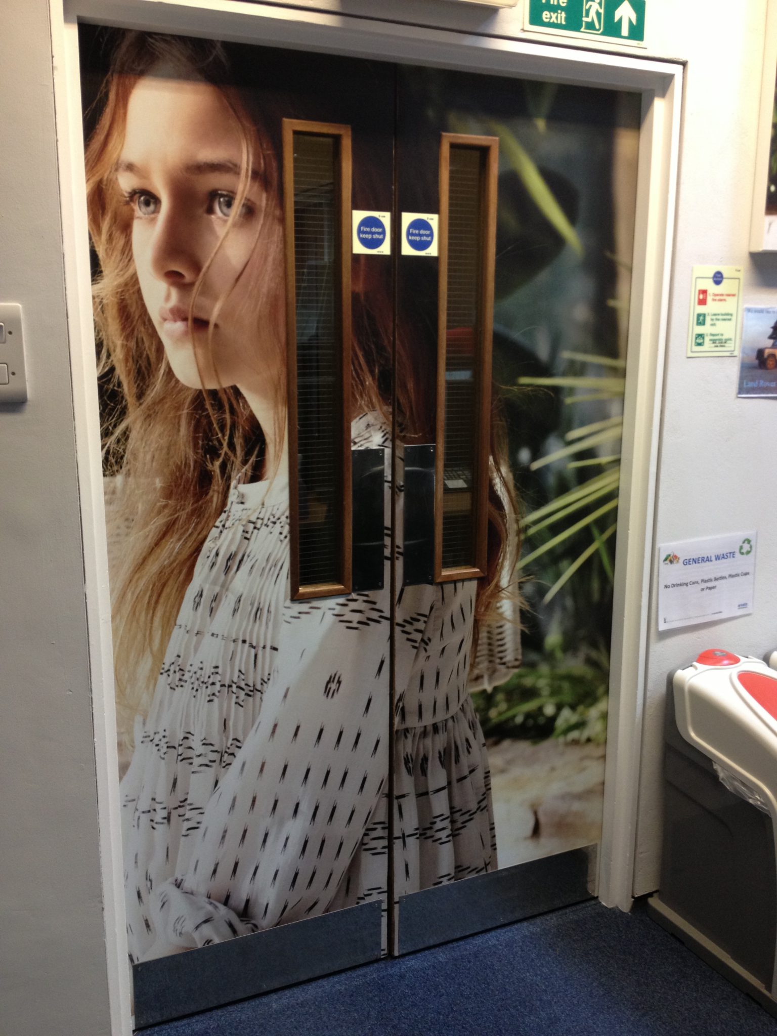 Interior Office Door Wraps Interior office doors wrapped with large photographic images to convey branding and corporate message of Zara (the clothing design and retailer) in their internal office headquarters. Murals and wallpaperDoor SignsOffice Signs Share this sign