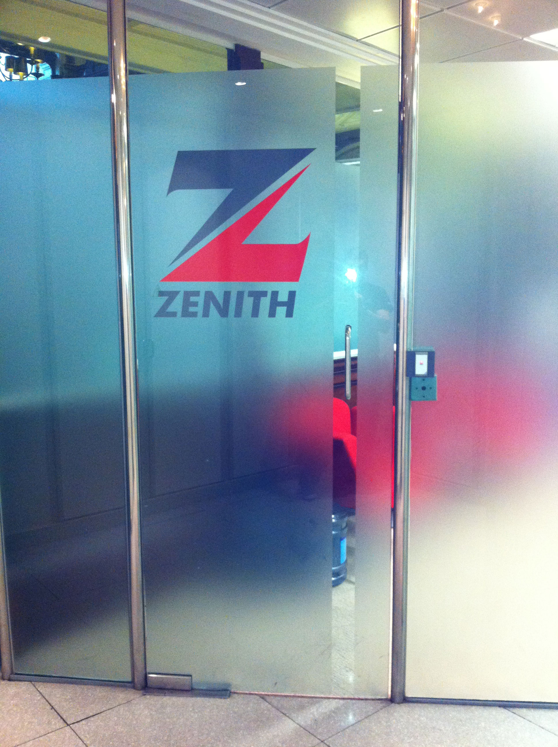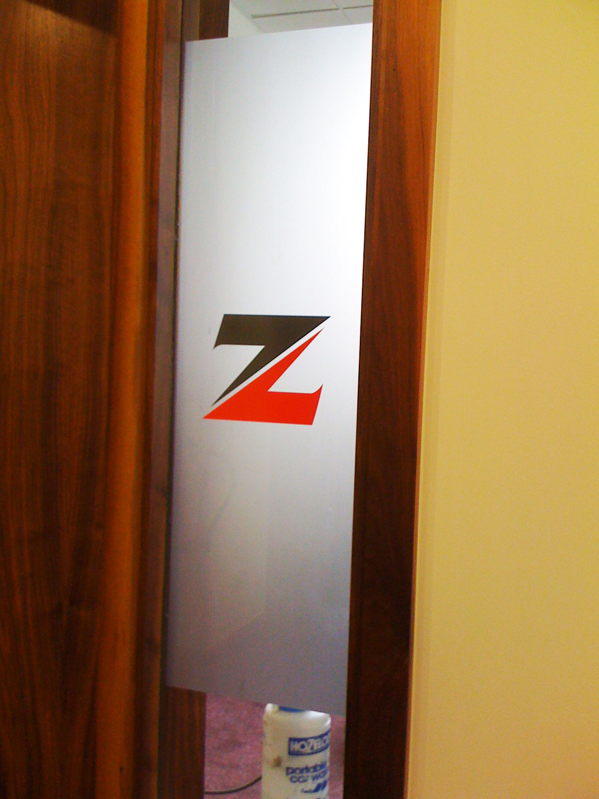 A variety of internal office signs for a City of London Bank on glass partition office walls and glass doors including coloured flat vinyl graphics applied over frosted film to showcase corporate colours and brand.