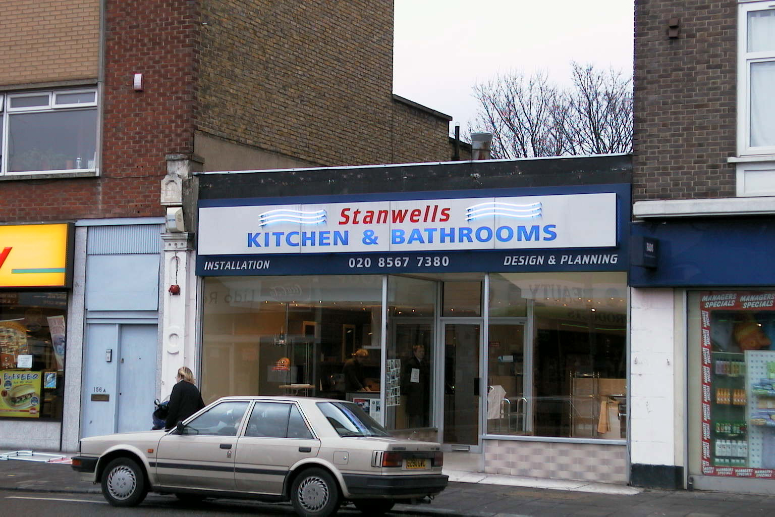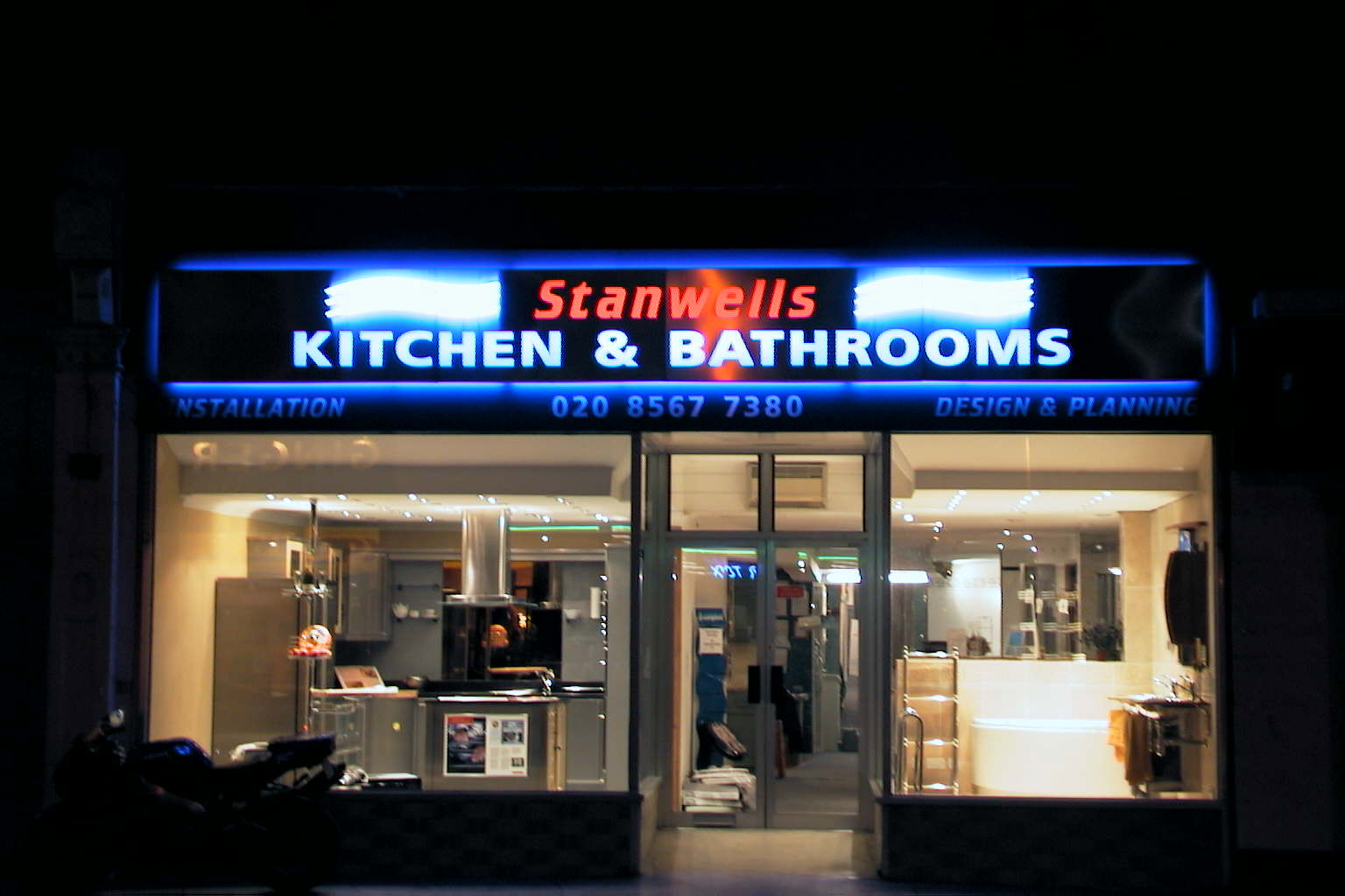 Kitchen and Bathroom Neon Shop Sign Acrylic graphics applied to lit up light box sign with exposed neon detail to create high-contrast striking sign at night. Shop SignsIlluminated LED and neon signs Share this sign illshop