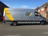 Vehicle graphics which span the length of these vehicles for a hydraulic hose services company. Bold yellow stripe wrapped around front and rear of van to complement iconic brand and corporate colours. Stylised chevrons added to base.