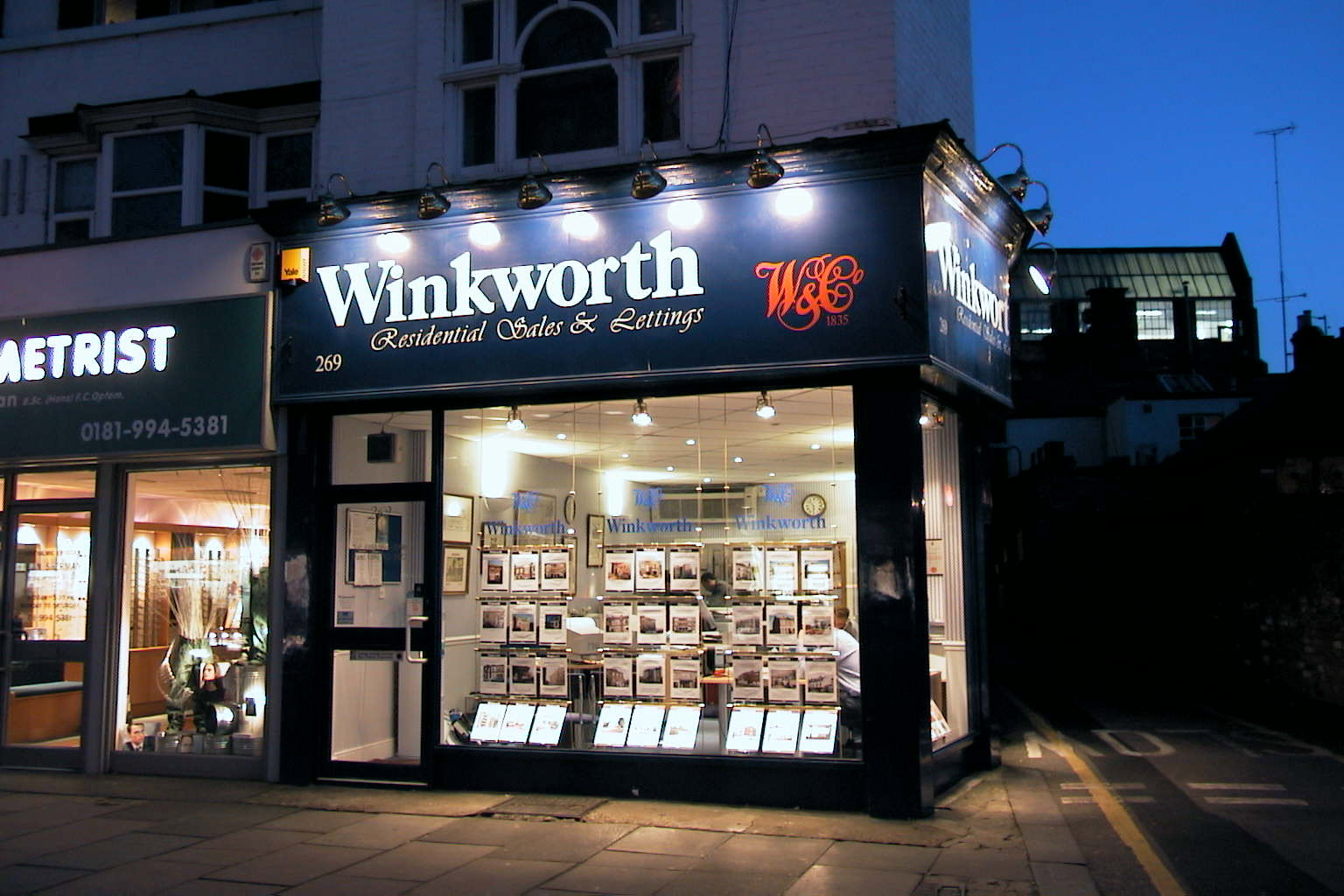 London Estate Agent shop sign for Winkworth with projection sign and built up, painted metal letters and illumination from above (one with trough light and other with spot lighting).