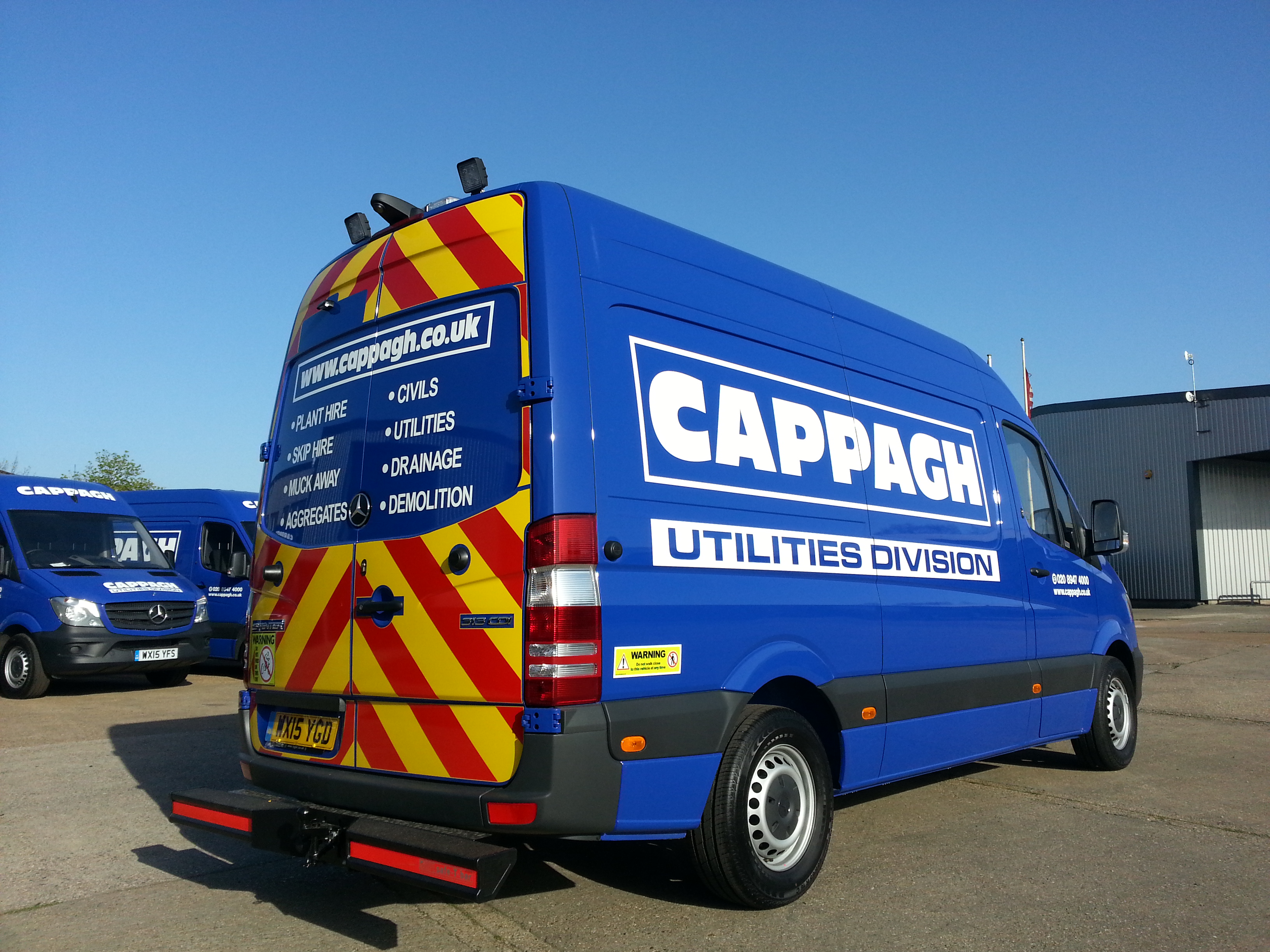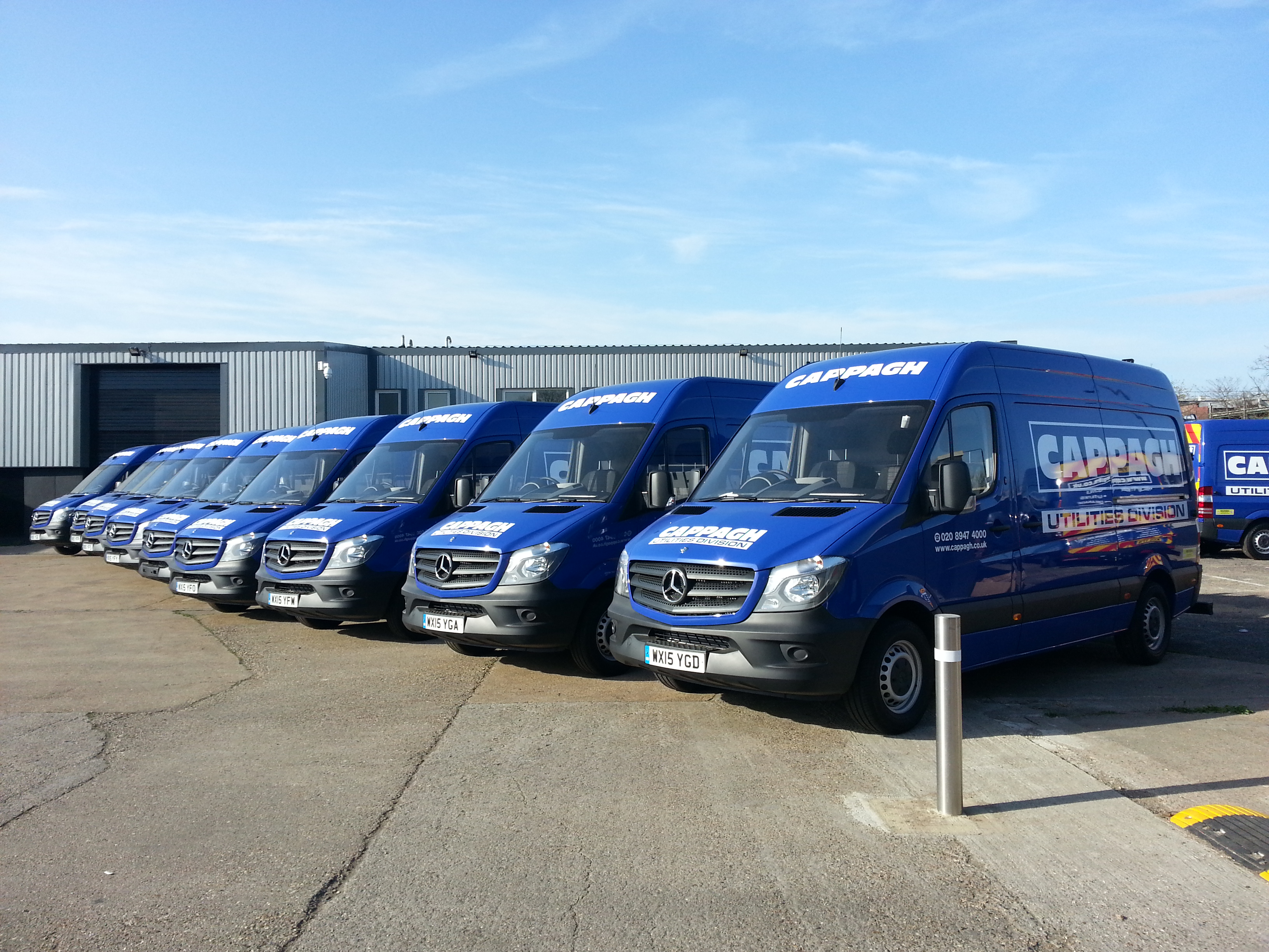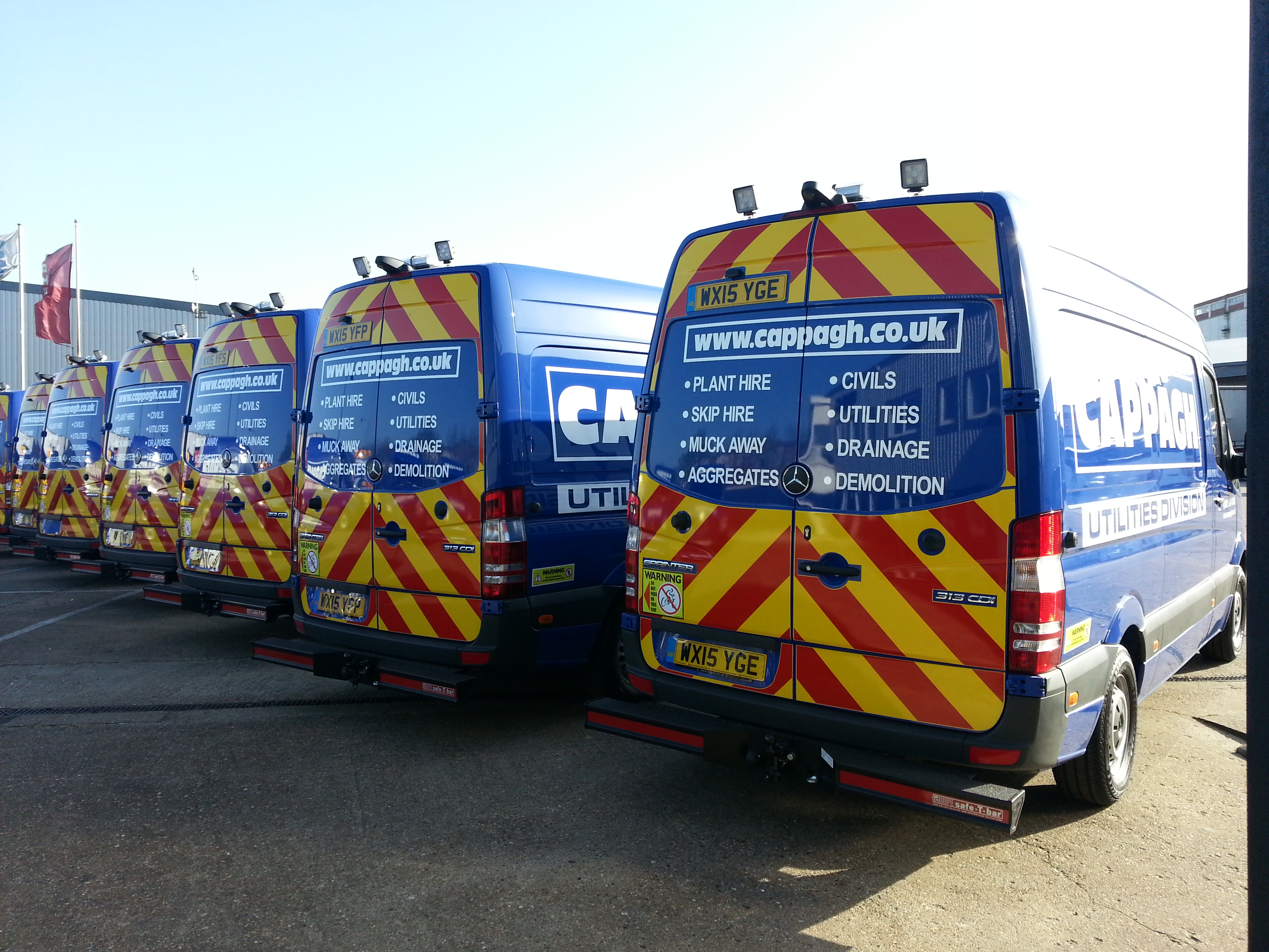 Mercedes Sprinter Van Fleet Vehicle Graphics Fleet of Mercedes Sprinter vans in London immediately post vehicle wrap installation by Action Signs. Vehicle GraphicsVan SignsChevron Share this sign