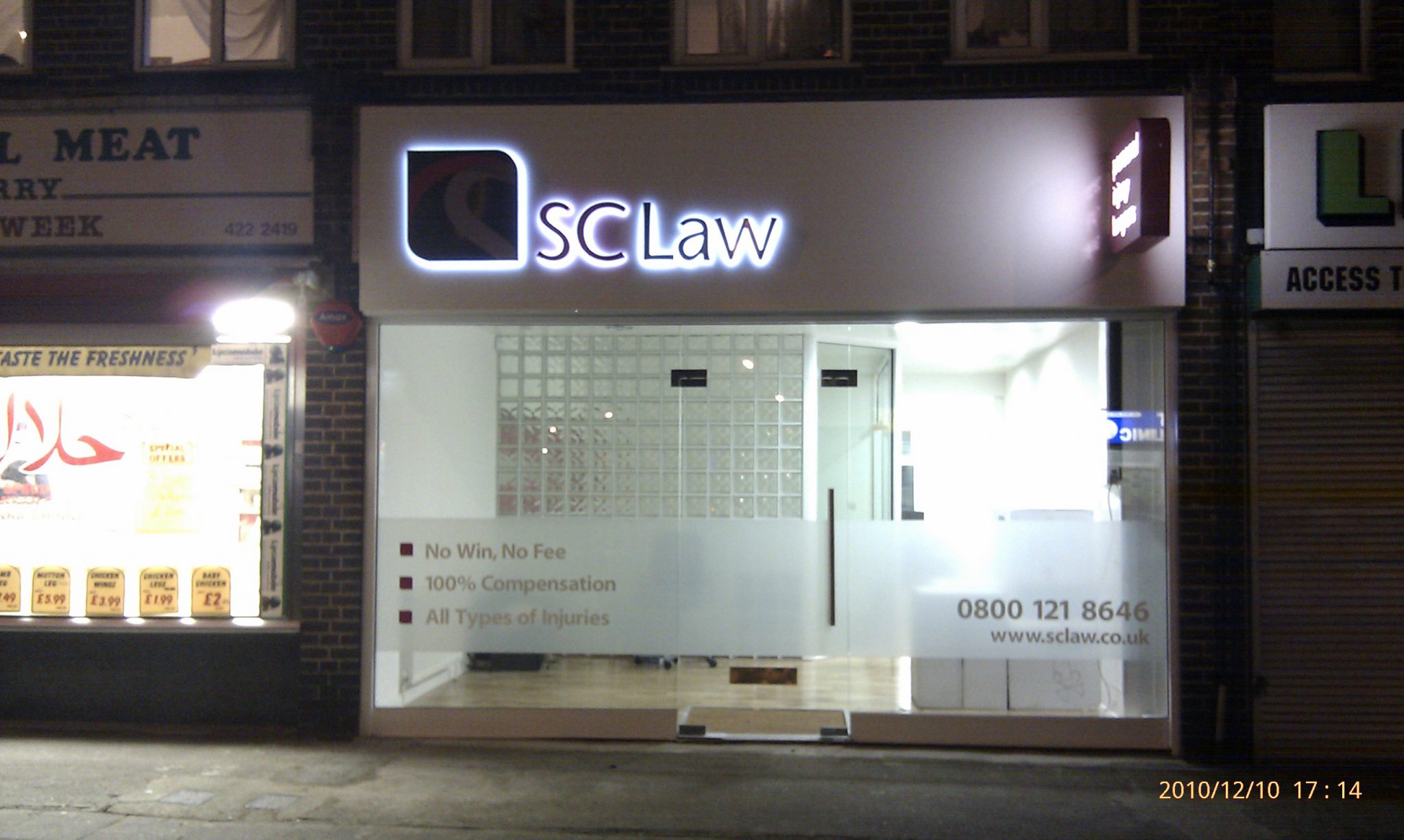 Modern High Street Solicitors Sign Back-lit metal letters create a striking impression for high street London solicitor sign. Mounted onto gloss finish stencil cut aluminium tray. Shop SignsIlluminated LED and neon signs Share this sign external illuminated