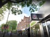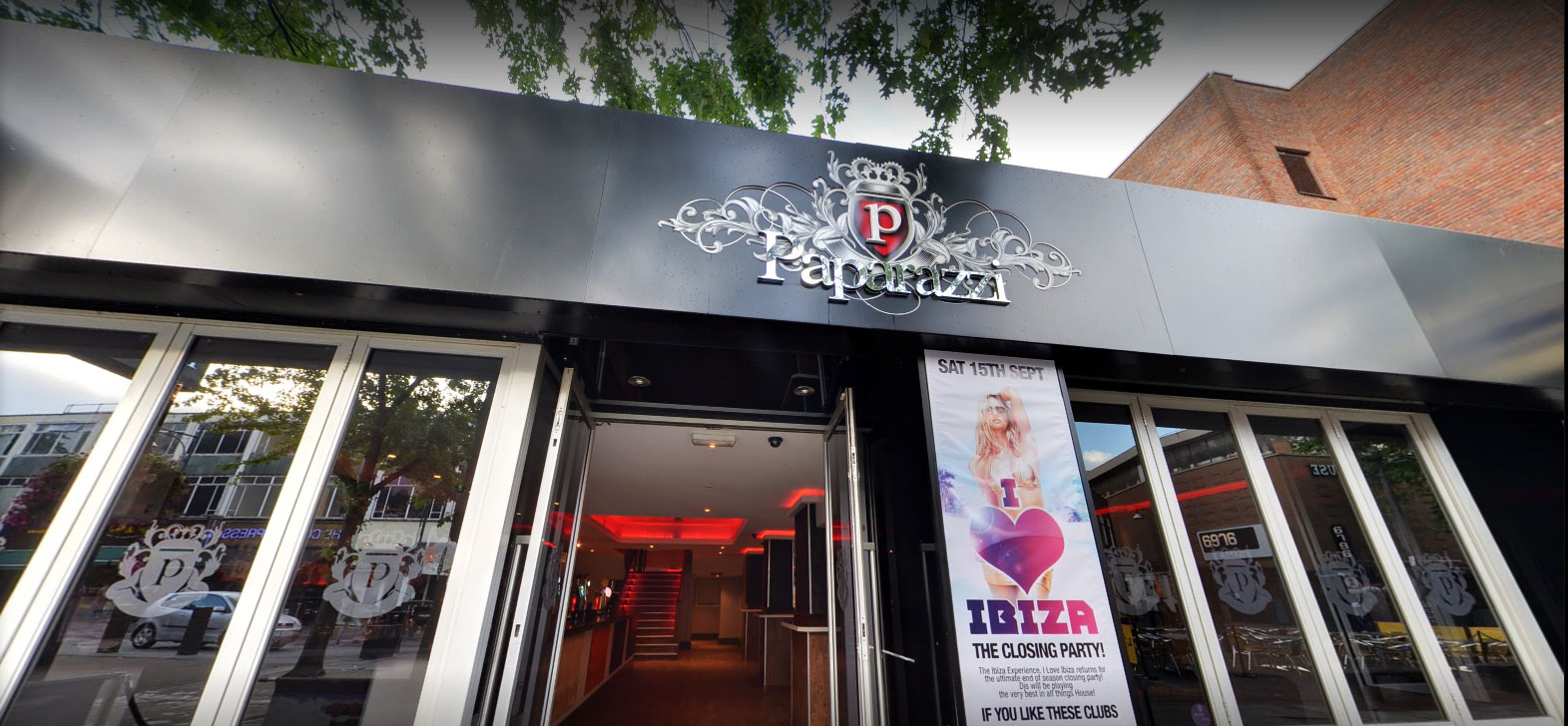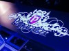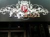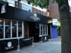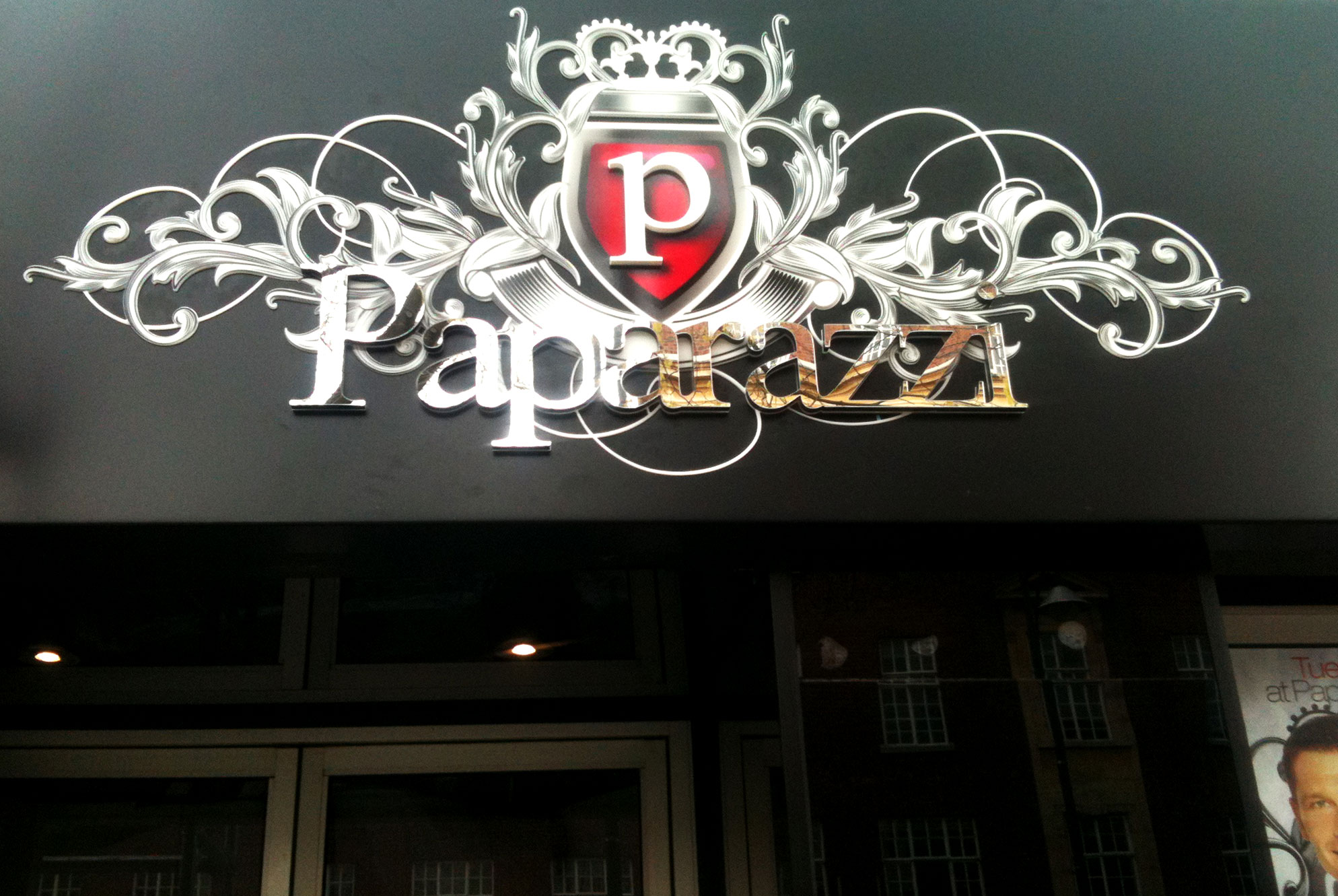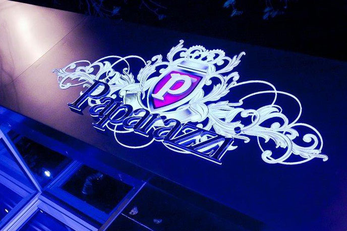 Black aluminium panels with overlaid gloss-finish vinyl graphics and built up acrylic letters finished with mirror-reflective material to produce chrome effect. Black aluminium panels are illuminated with LEDs. The sign accompanied by an illuminated projection sign, frosted window logos and bespoke cafe barriers, each incorporating the nightclub's brand.