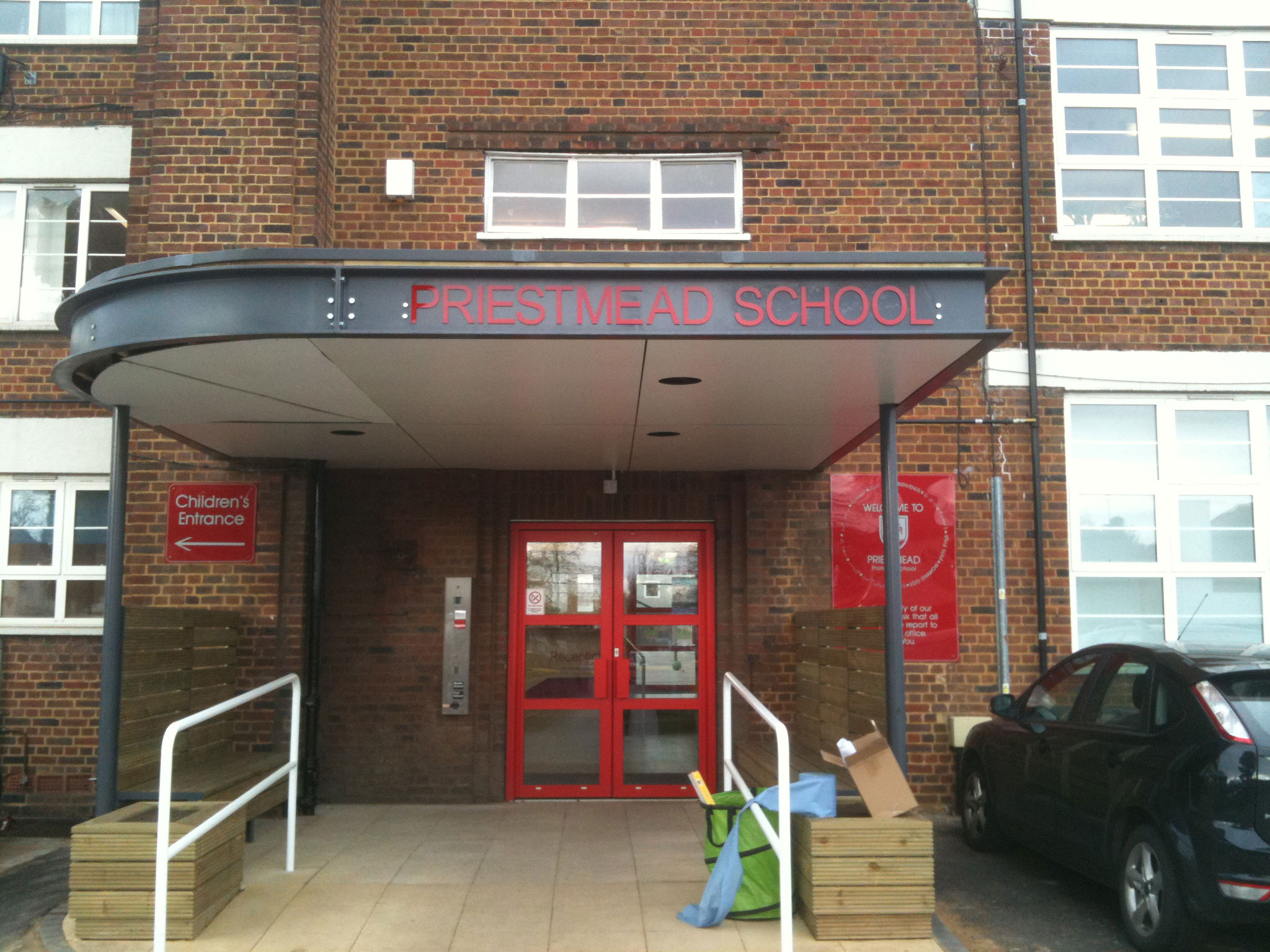 Plastic School Name Sign Simple plastic school name sign mounted in recess of entrance canopy. School SignsAcrylic Letters and Logos Share this sign