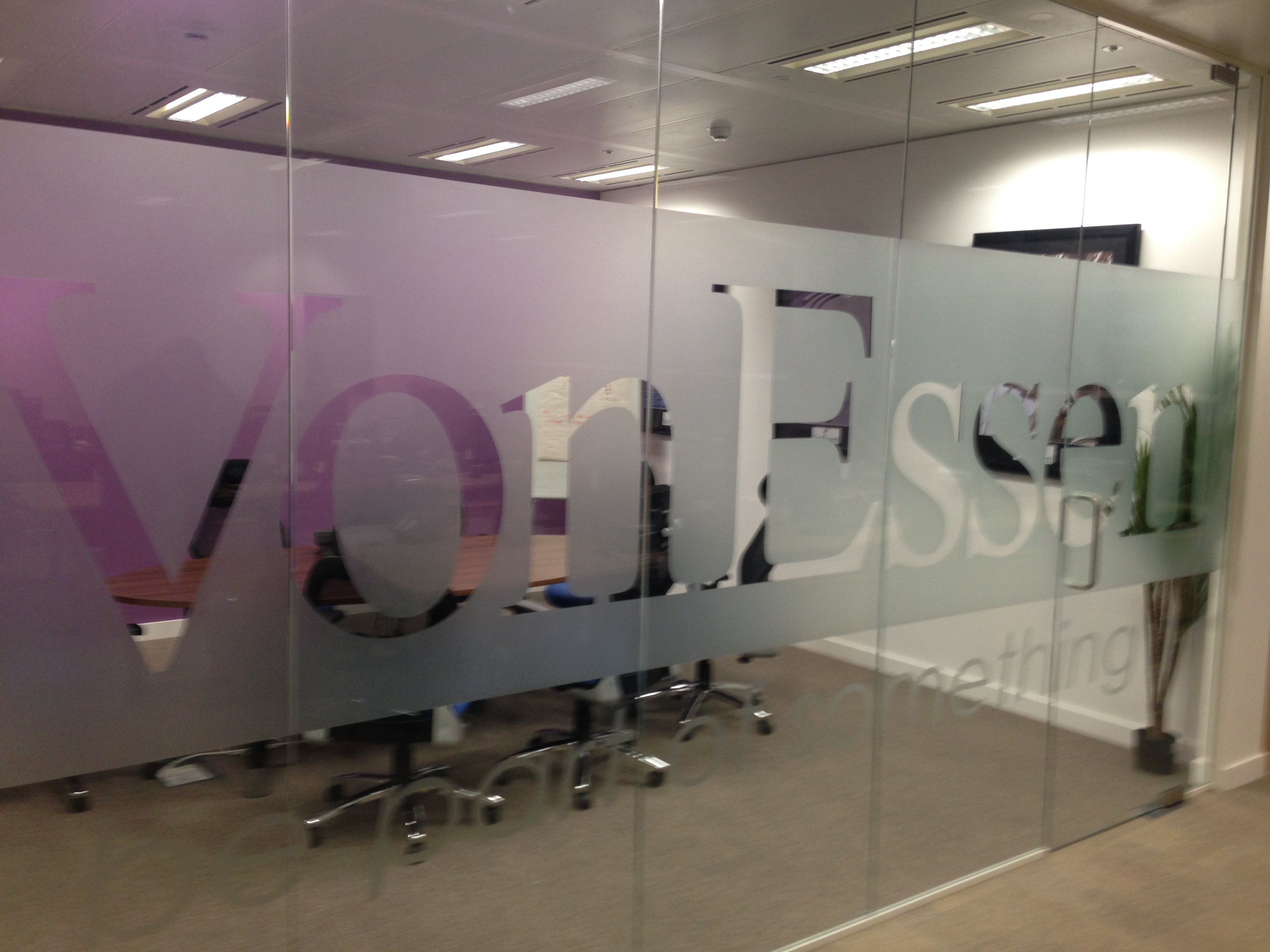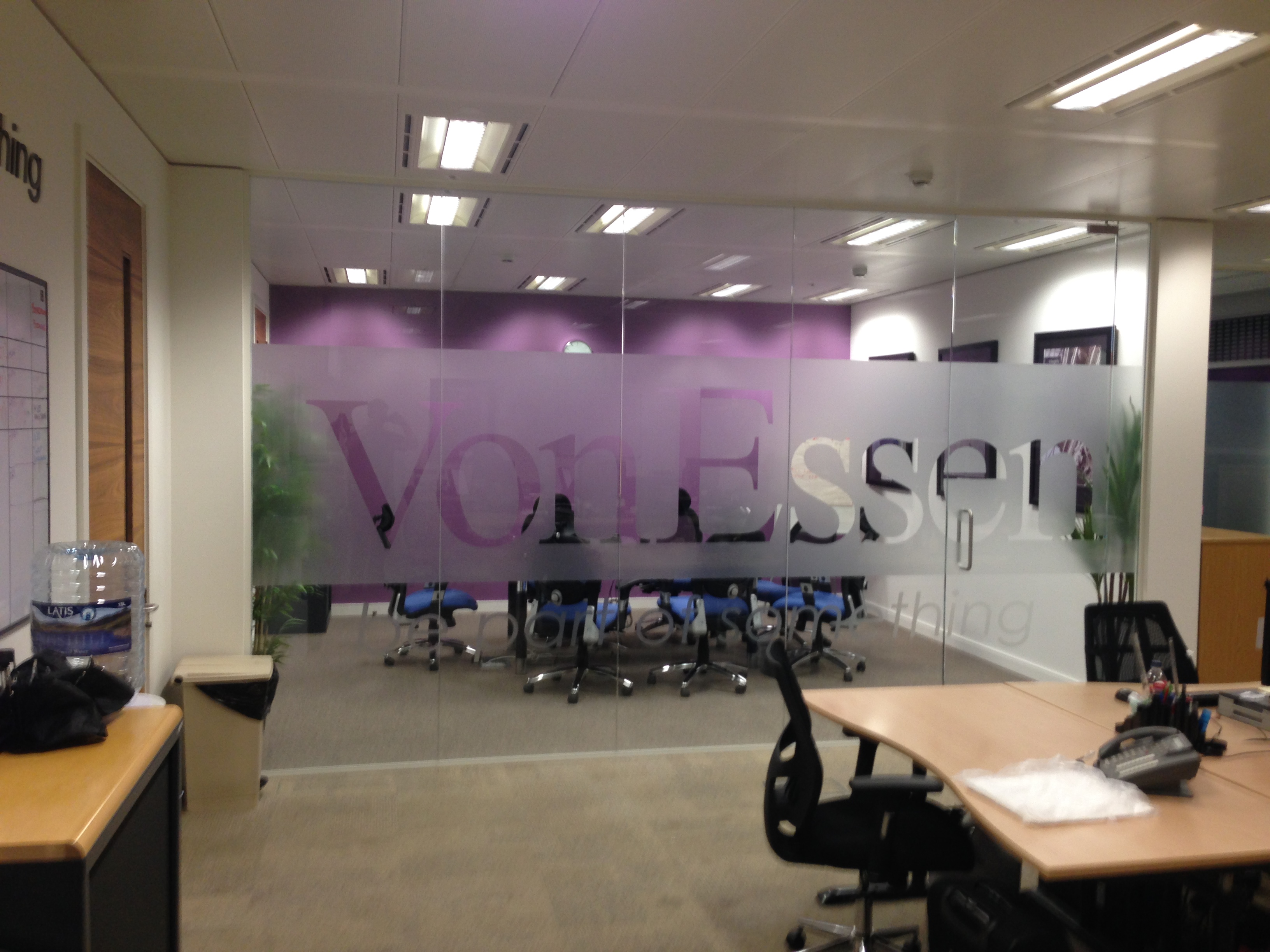 Sandblasted Large Typography We applied a sandblast-effect film to this this office boardroom. Frosted film serves the twin purpose of creating a sense of internal privacy and marketing your business to visitors. Frosted glass and manifestationsOffice Signs Share this sign
