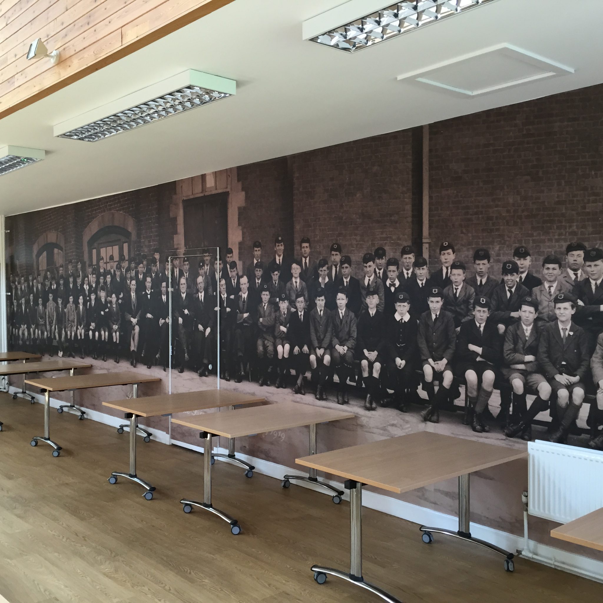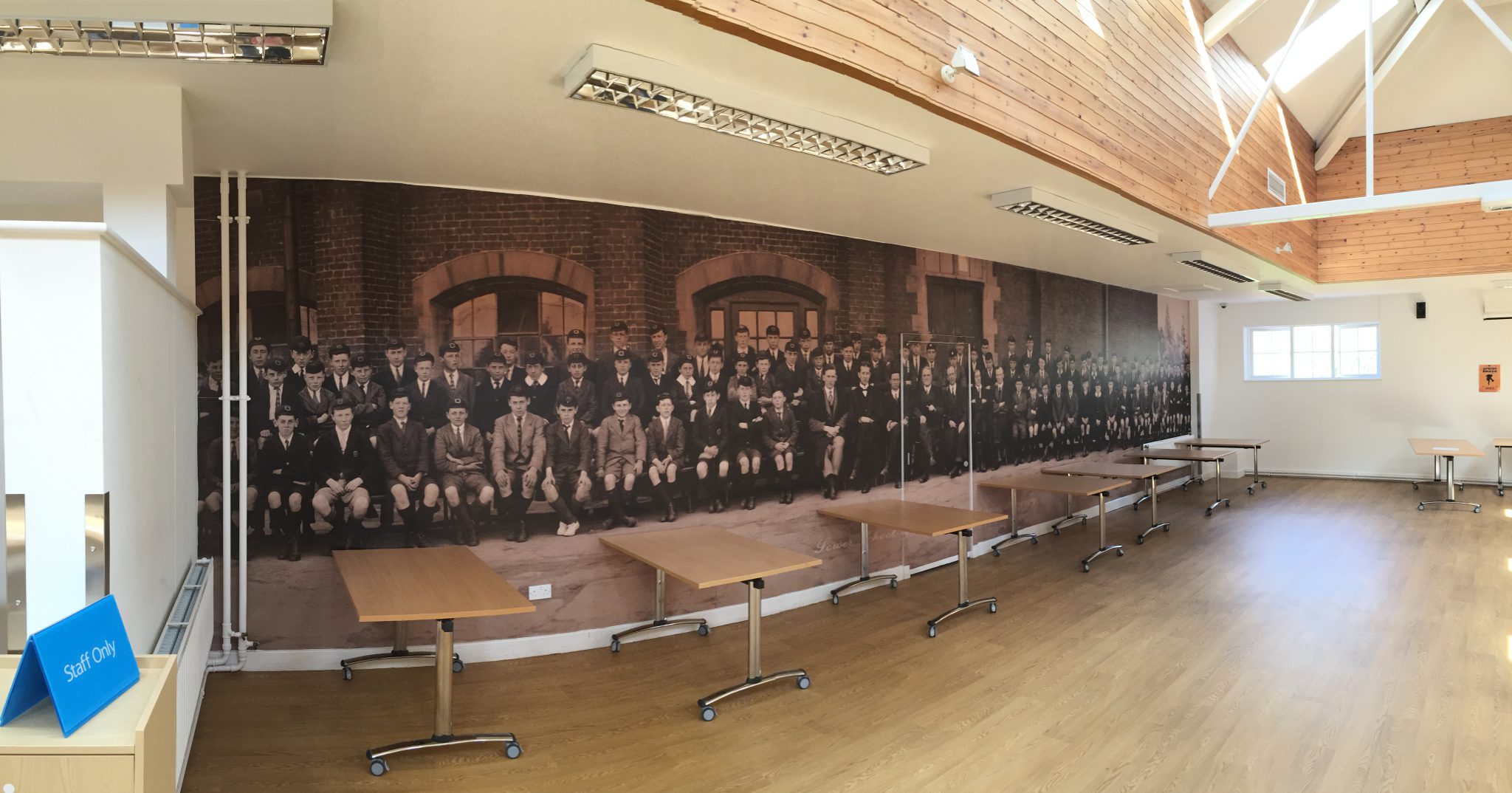 Large school photo panoramic view of old fashioned year group photo in sepia applied to wall in digitally printed vinyl graphics to create a sense of heritage and local history.