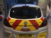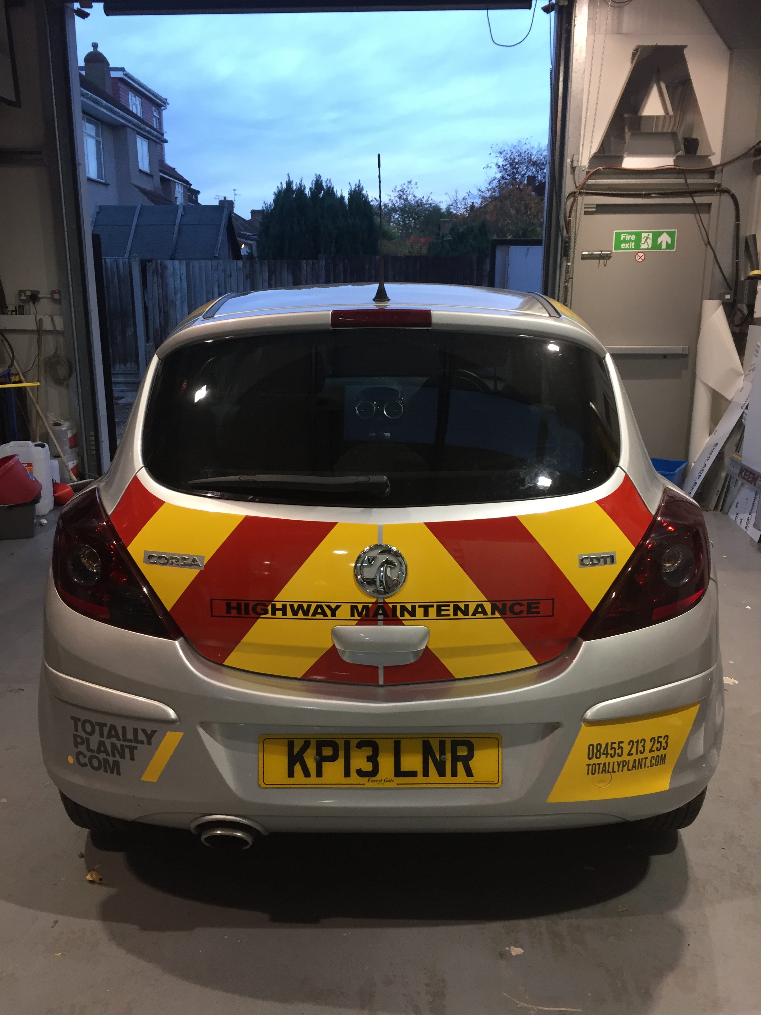 Totally plant small van graphics with iconic yellow branded stripe The vehicle graphics Bold yellow stripe wrapped around front and rear of the van to and corporate colours. red and yellow chevrons added to back. Plant and HaulageVan SignsChevron Share this sign