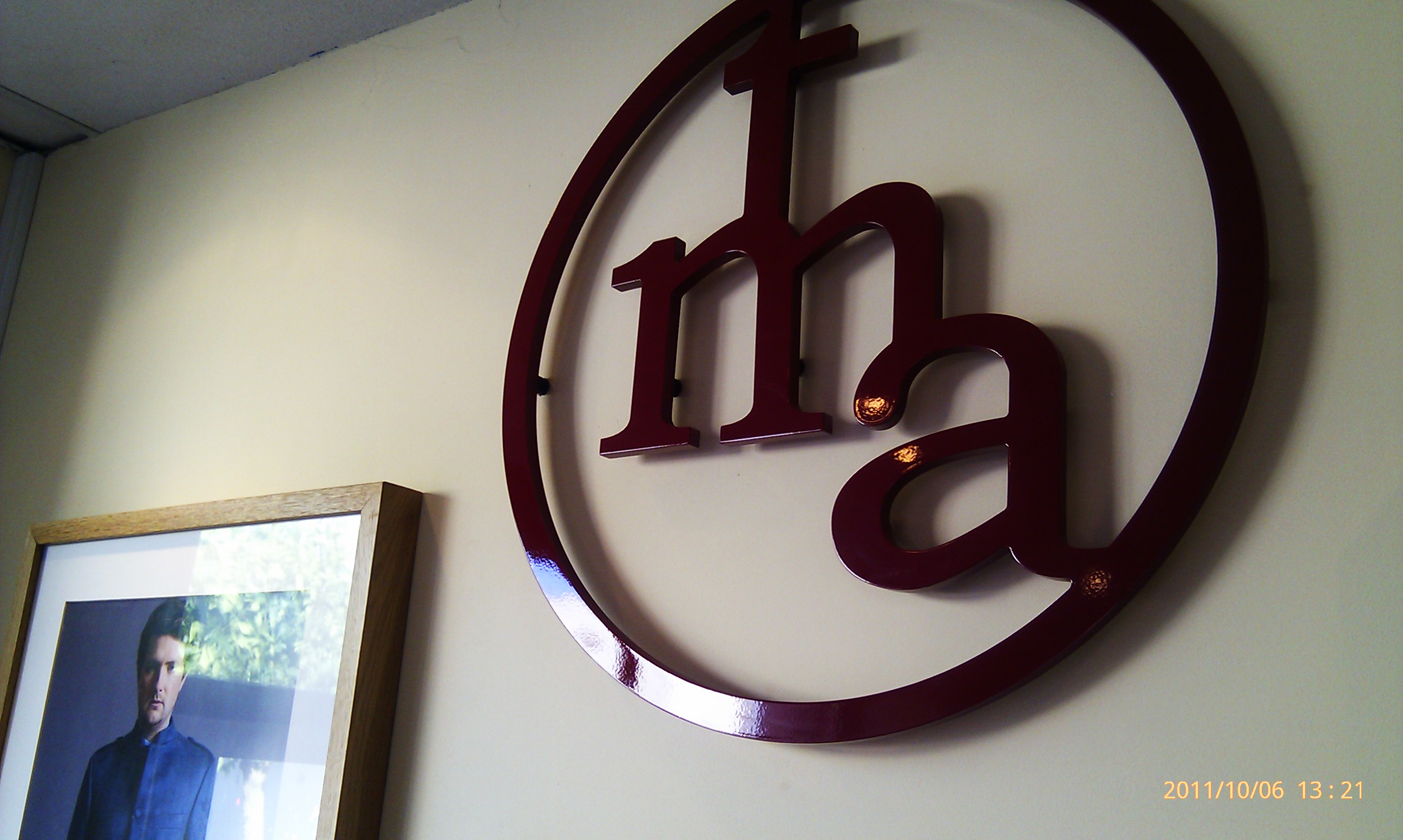 Painted Acrylic Sign For Tailor Small acrylic logo sign finished which high-gloss paint to create painted metal effect in high-end bespoke tailor (The Measure Agency) workshop in London. Acrylic Letters and LogosOffice Signs Share this sign