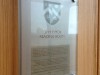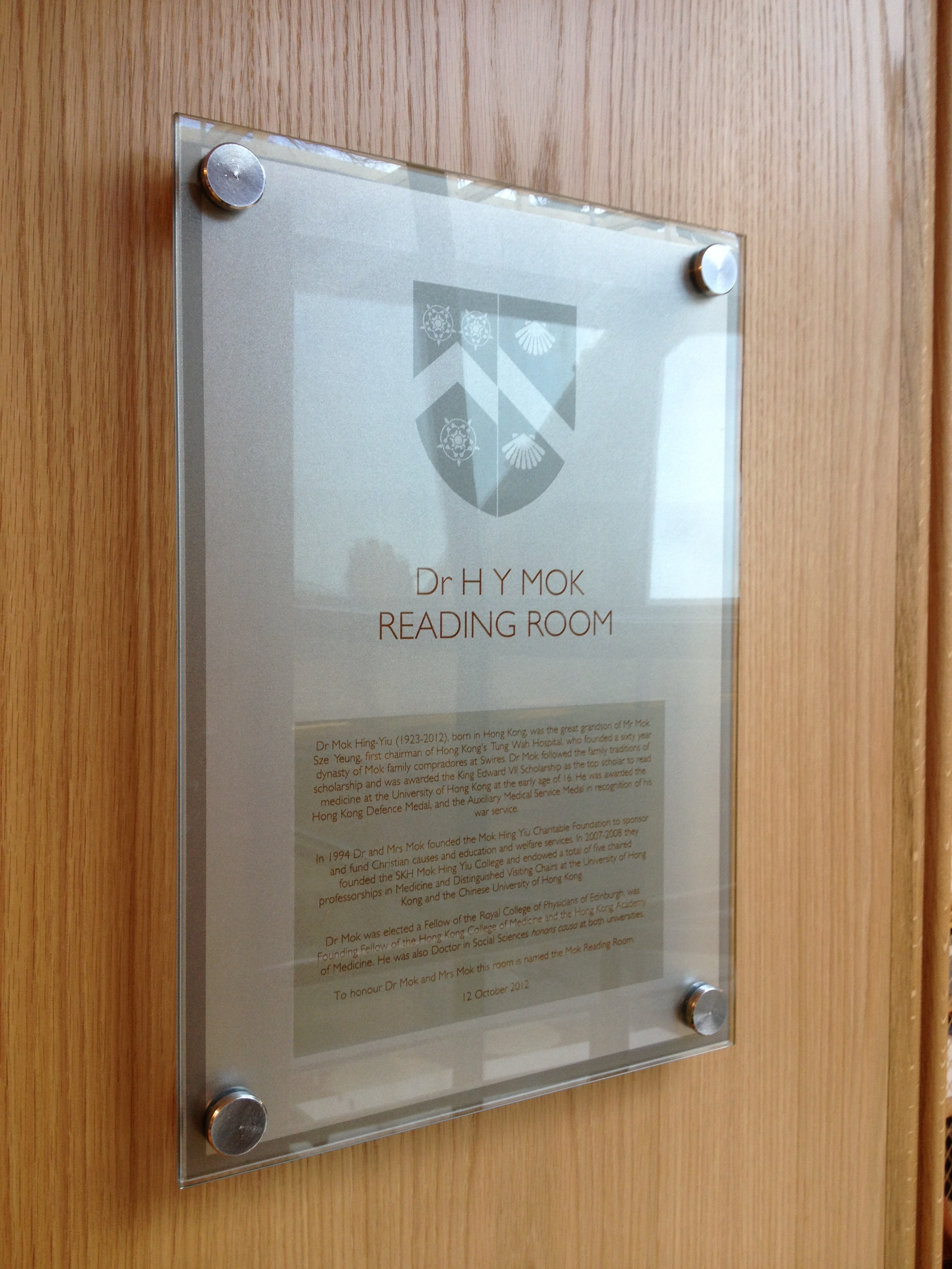 the small detail in the text and logos was achieved by printing onto optically clear vinyl this was then flood coated with a frosted film to provide contrast. The signs are installed at study rooms at Cambridge University.