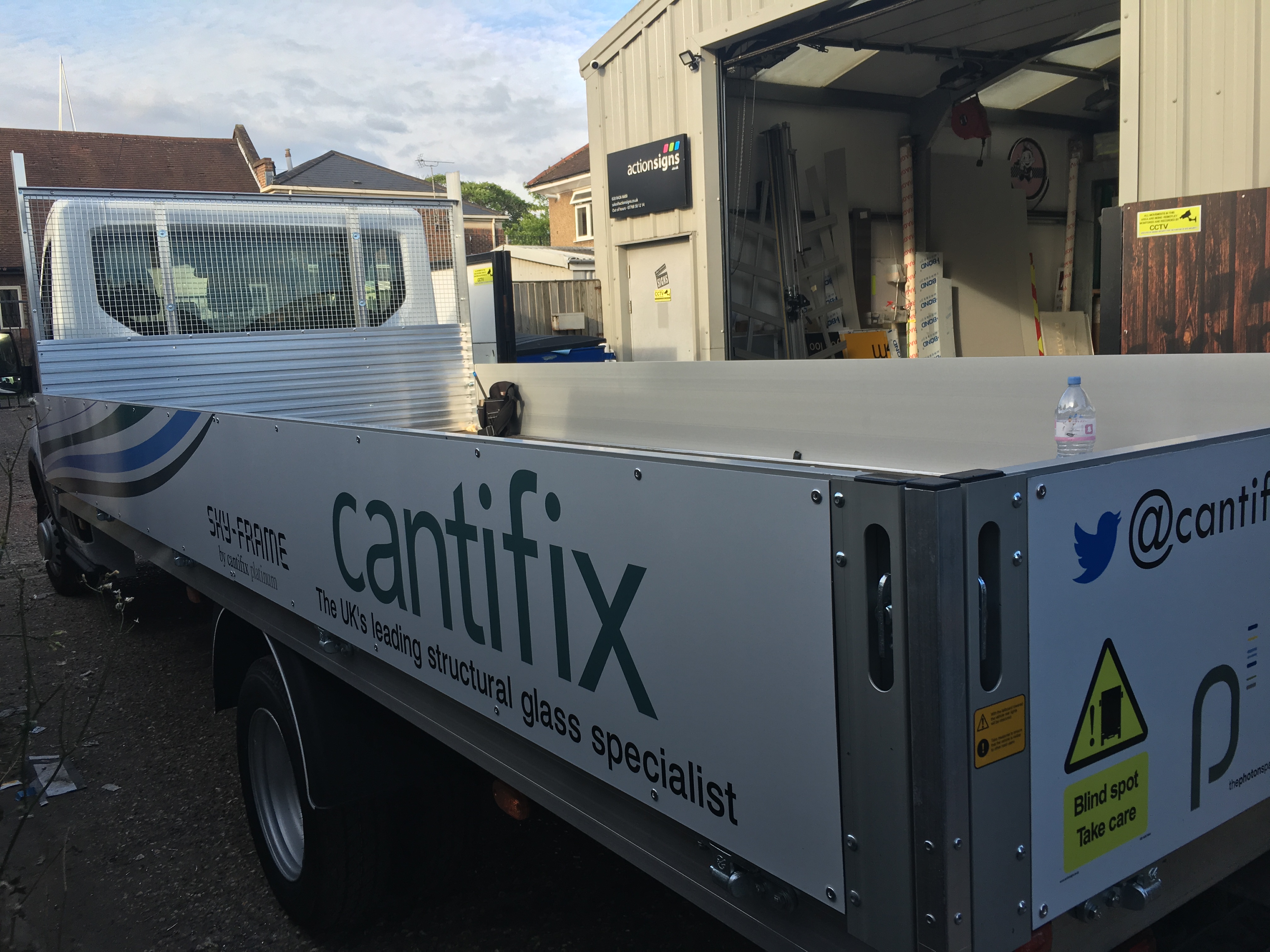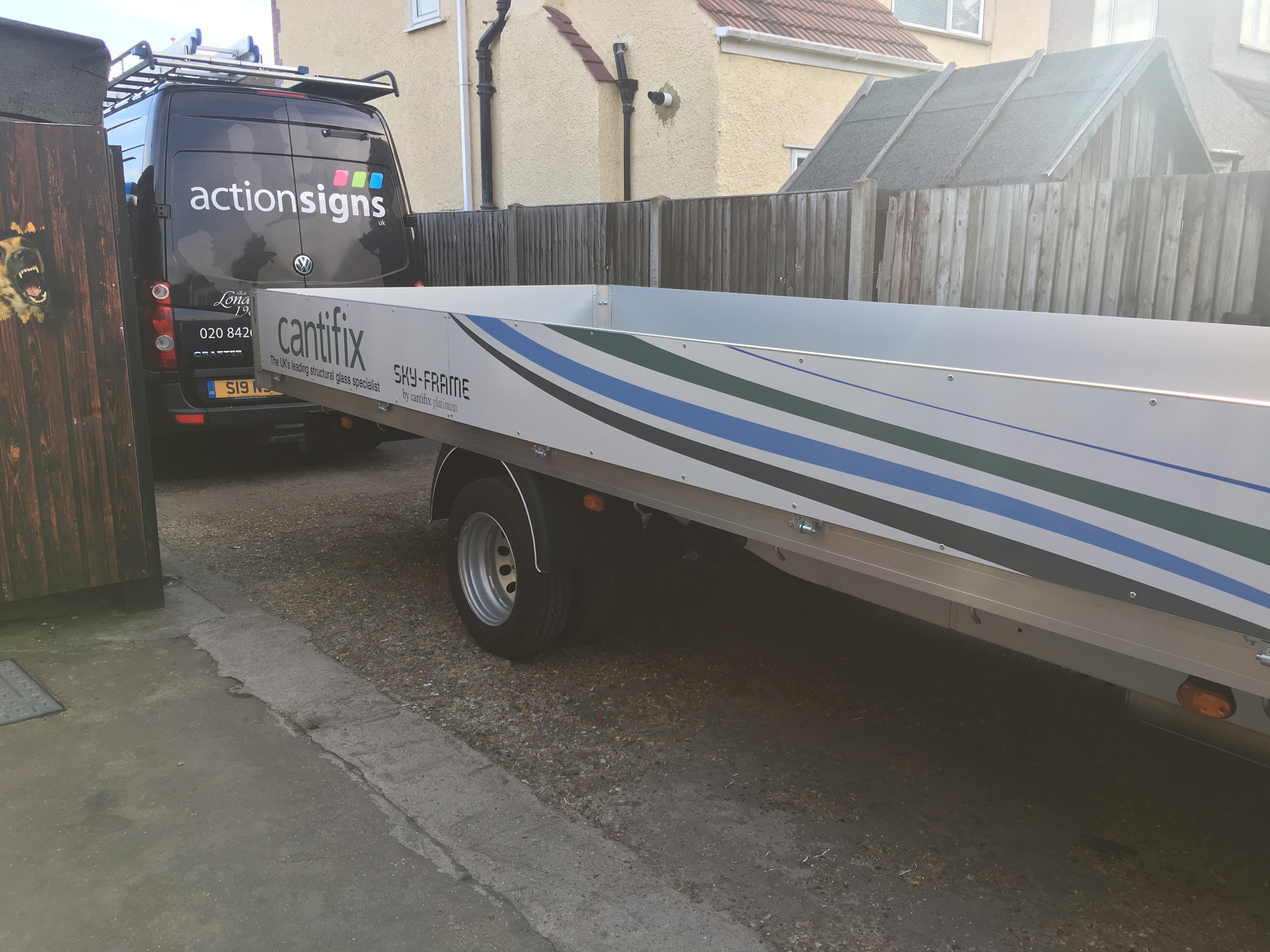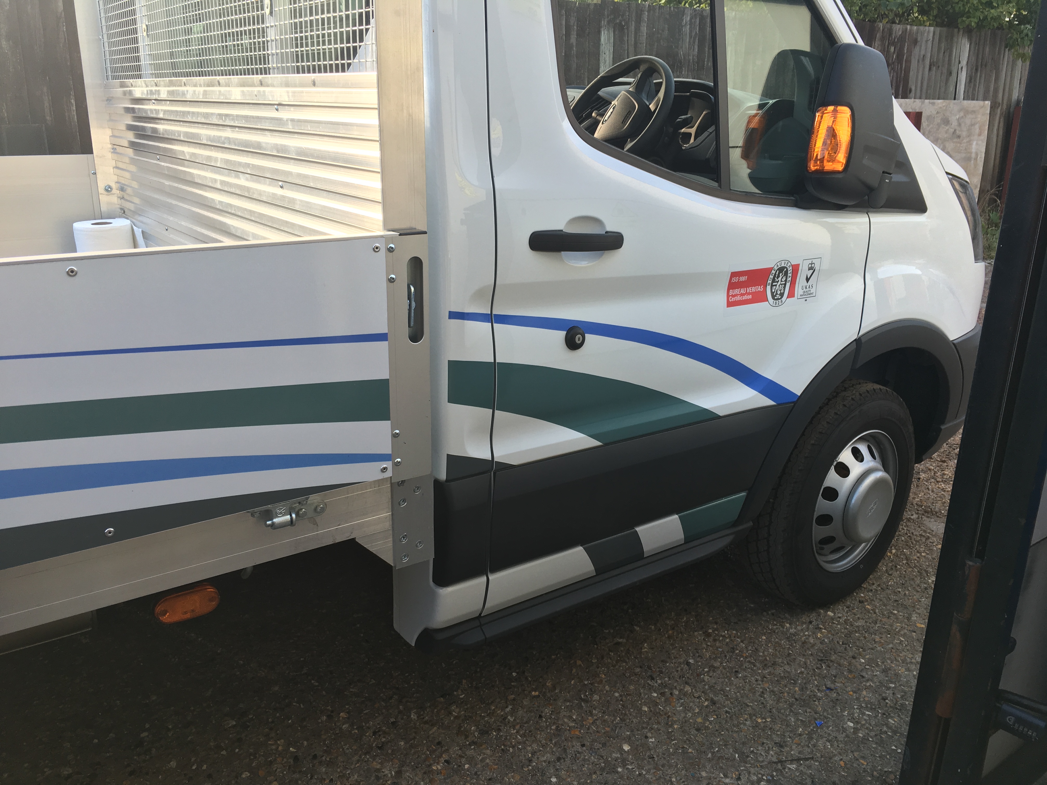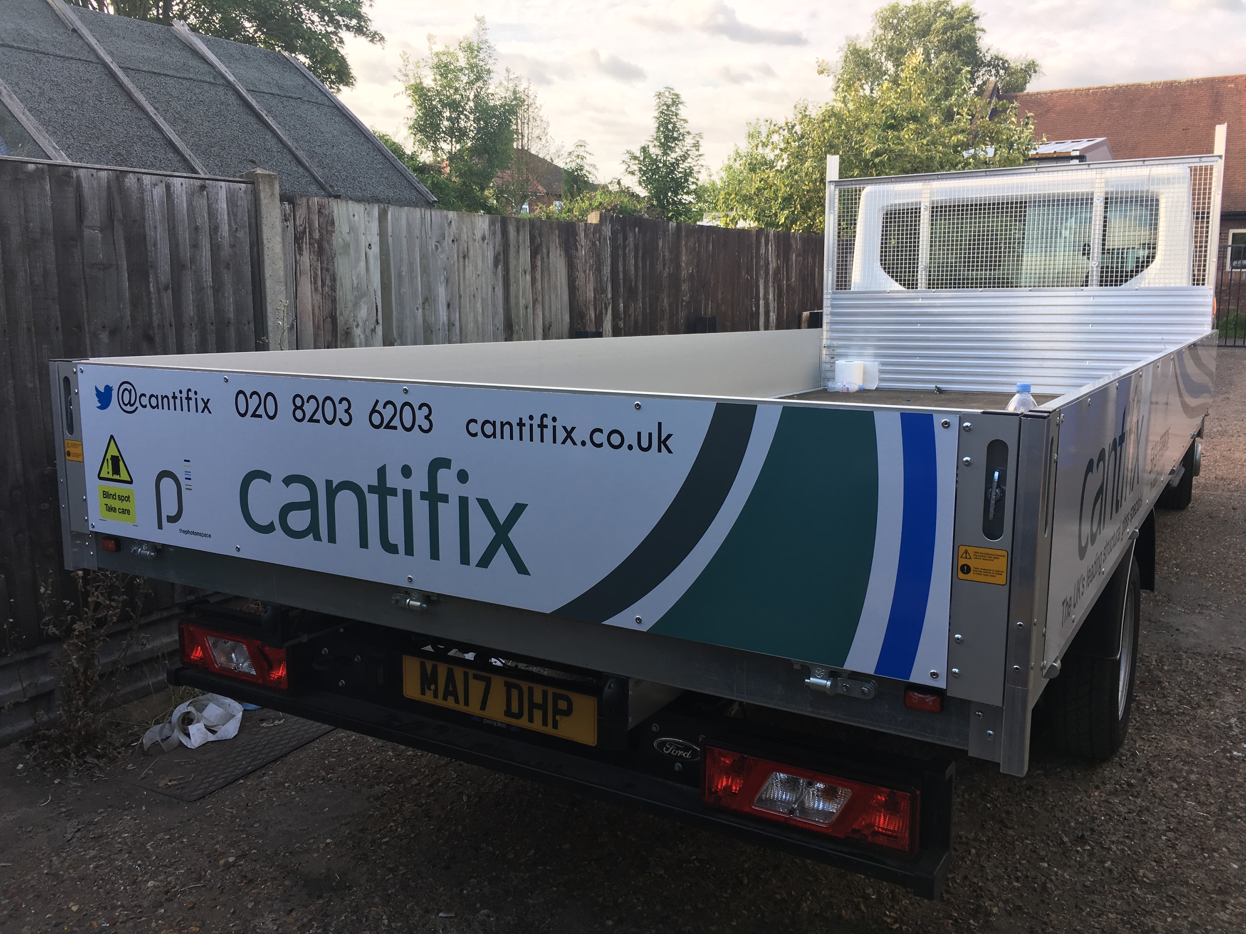 For this extra-long, flat bed Transfit van we applied vinyl graphics to aluminium composite panels and then riveted them to the side and back of the van. This is necessary where the underlying bodywork is corrugated or an irregular shape that does not permit signs to be installed directly to the body of the vehicle.