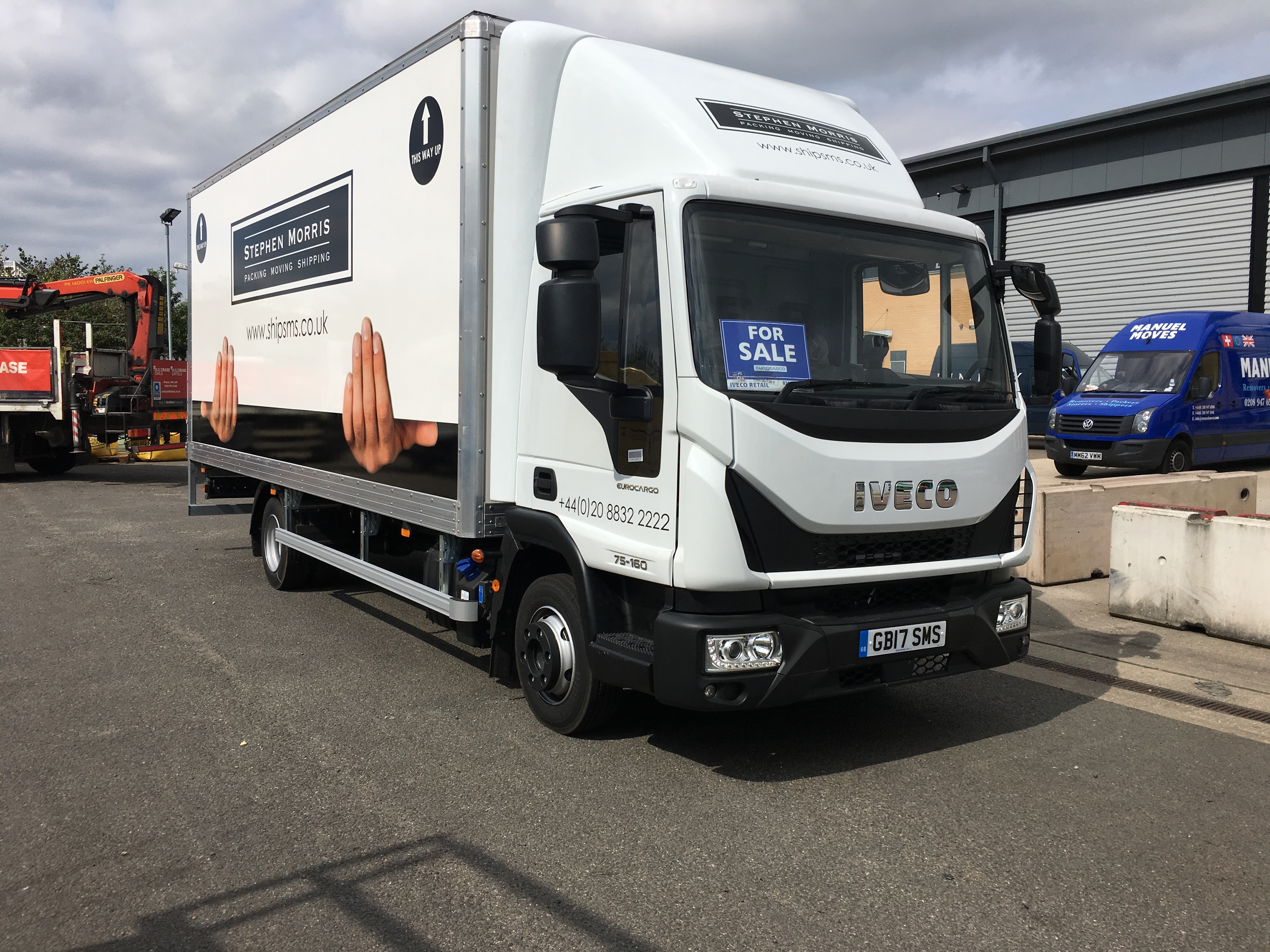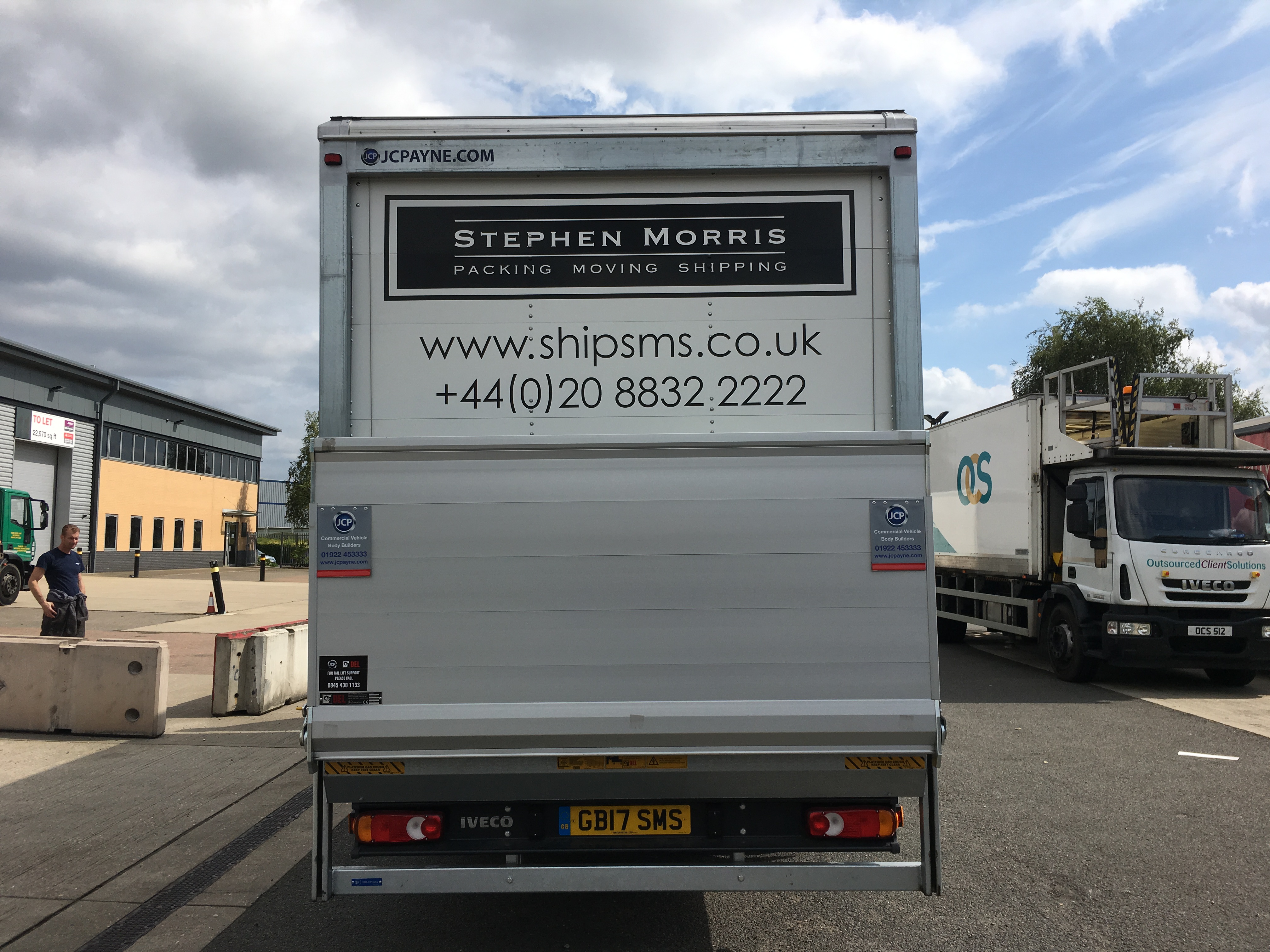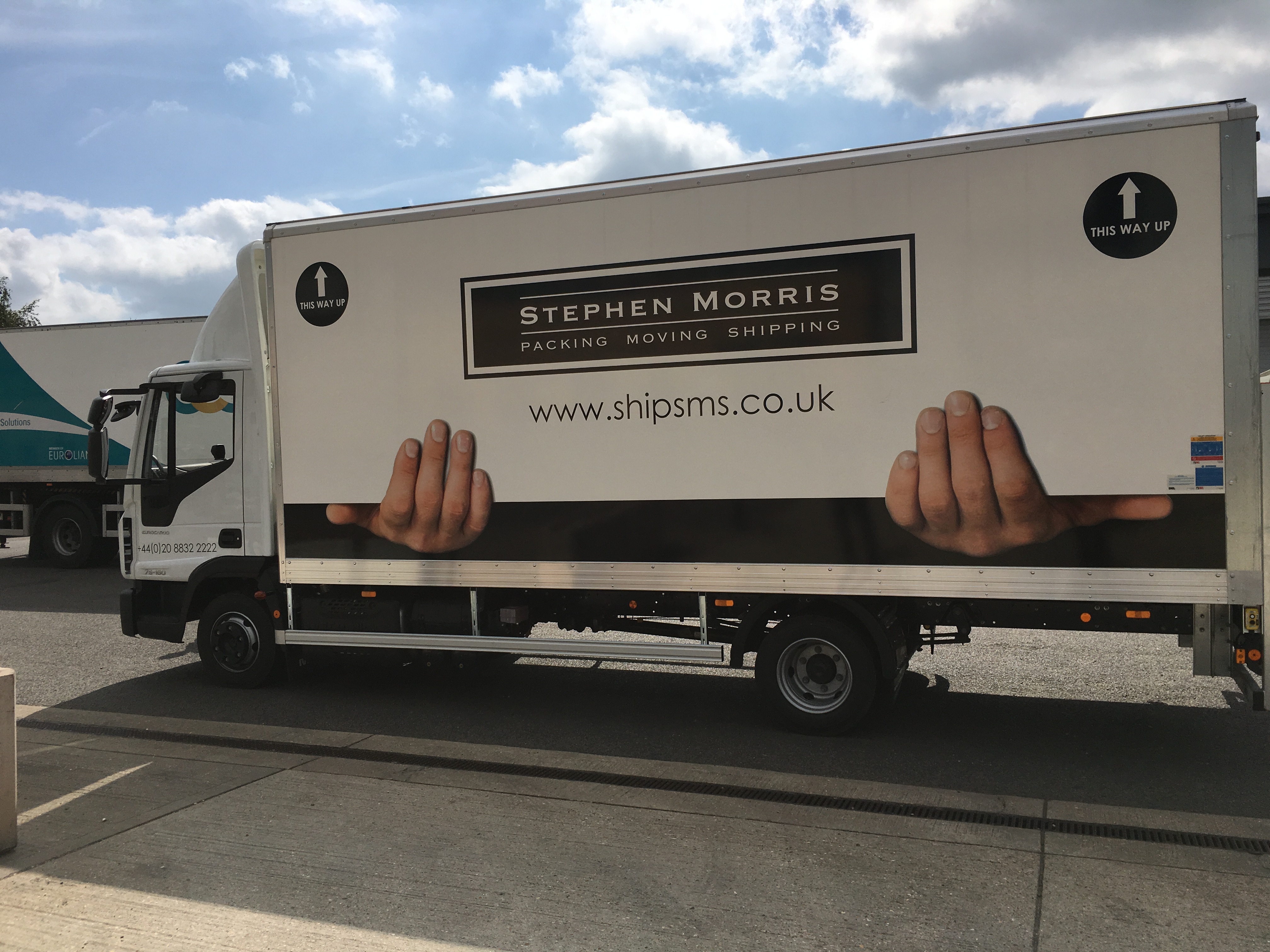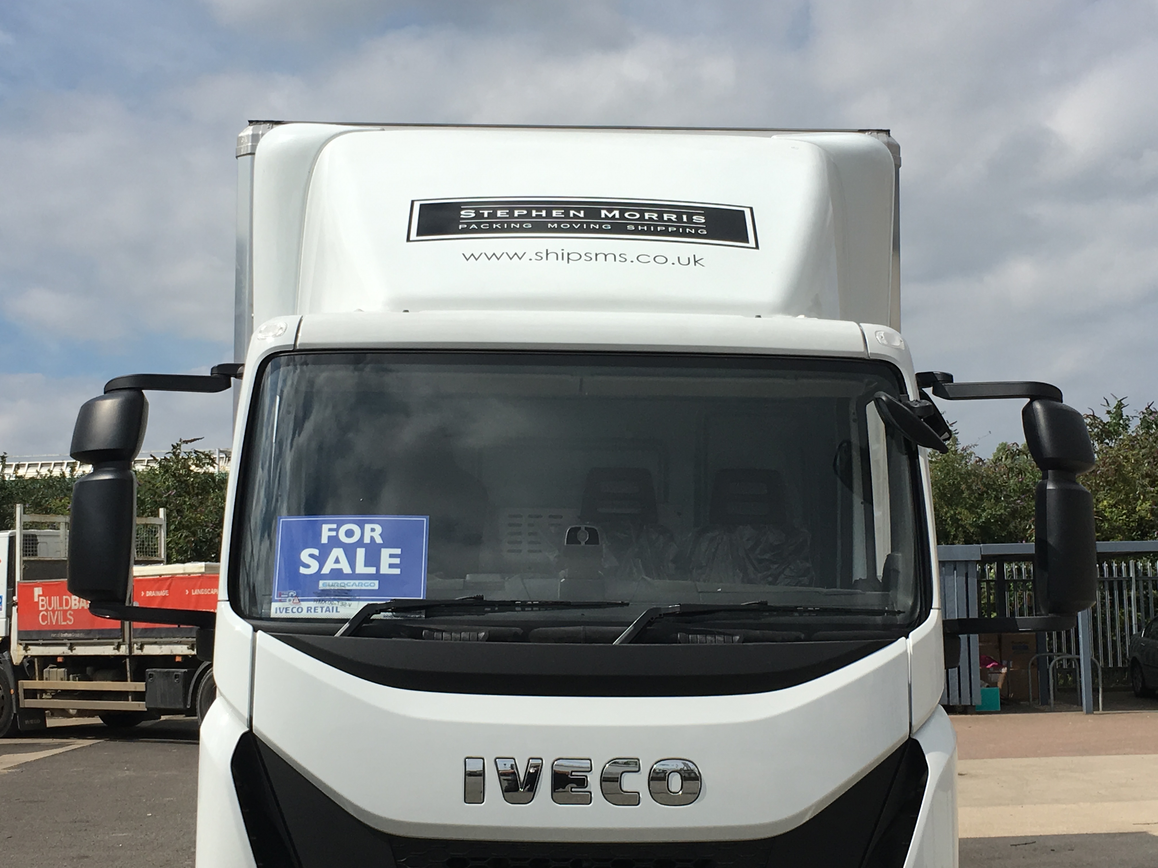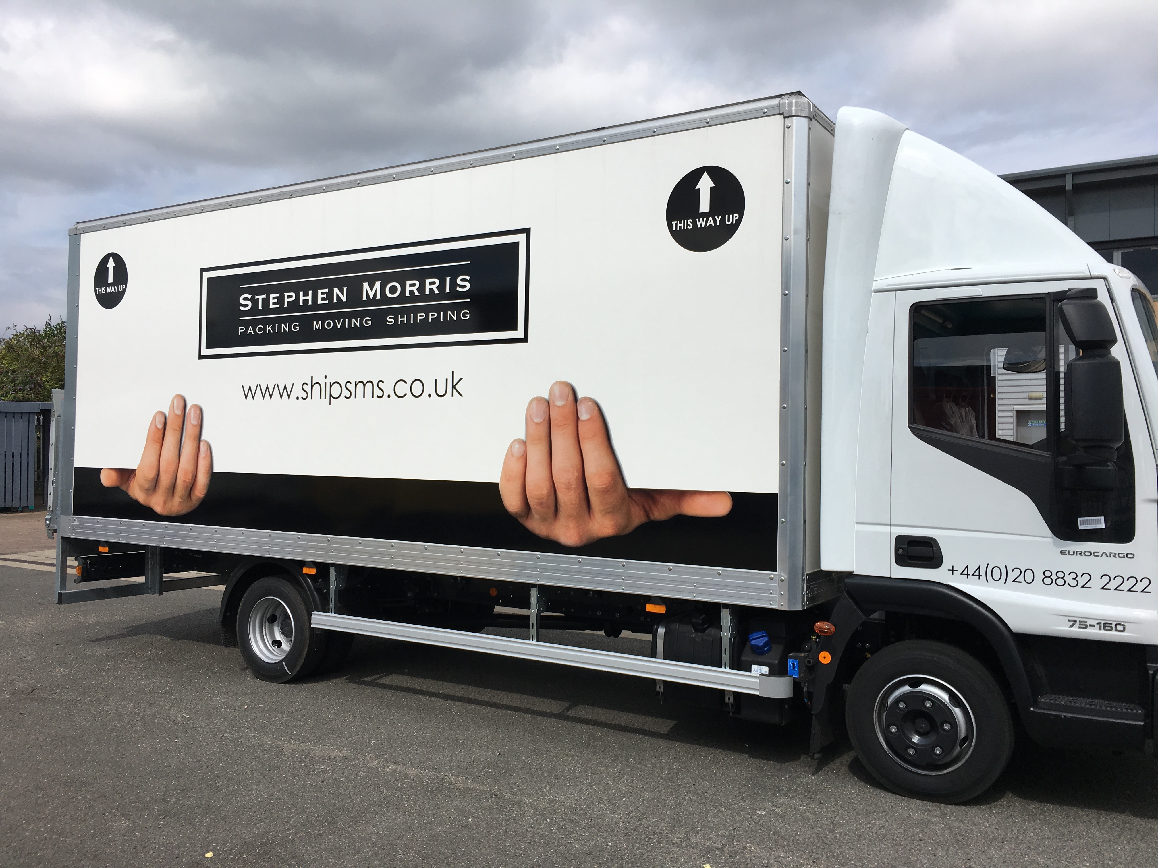 Signs For Large Luton Van Full colour detailed digital print applied to side of large truck for shipping firm with computer cut logos. Signs applied to Luton box, roller-shutter and cab. Lorries and Commercial Vehicles Share this sign