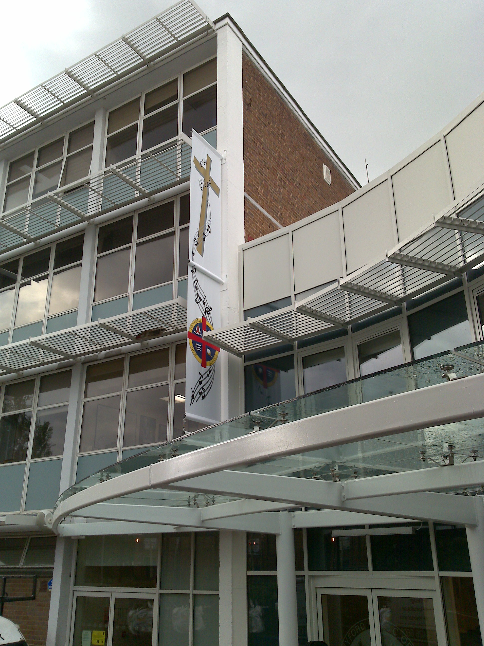 Double sided projection banner for side of school building. We used a heavy duty wall mounting system (which is also weather resistant) with built-in tensioner, allowing banners to be installed projecting at 90 degrees from the wall. The banner material itself is triple skinned not allowing light to travel through the banner for a clearer, more prominent sign.