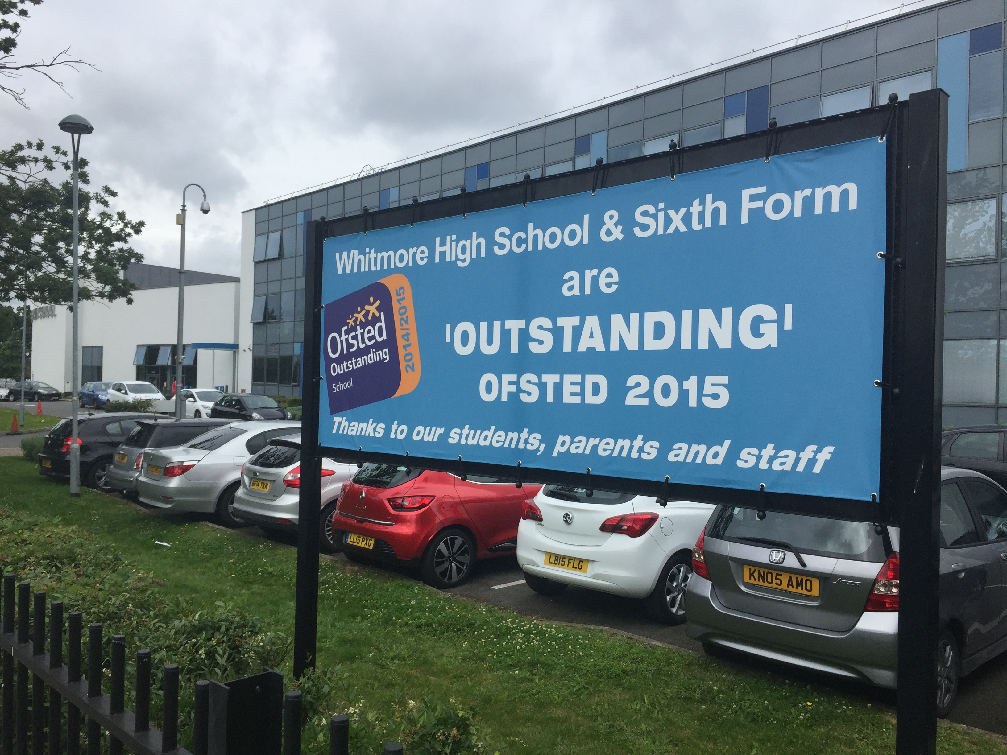 Vinyl banner mounted on metal frame provides semi-permanent school road sign. Height of fabricated metal metal frame means these vinyl banners are less likely to be vandalised unlike other banners which are mounted within reach of passersby.