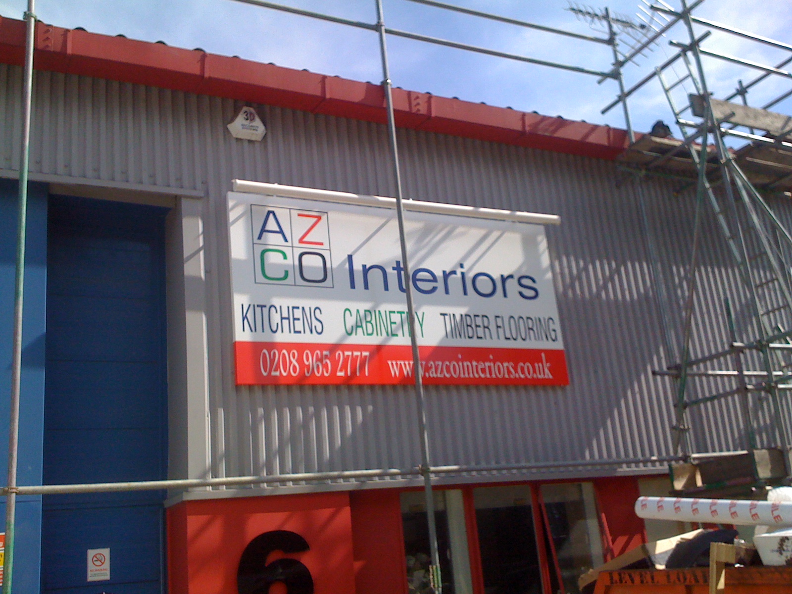 Interior and Woodwork Company Sign Aluminium tray sign mounted on warehouse for London timber and interior woodwork company. Sign is illuminated with an overhead trough light. Construction SignsBuilding SignsFolded Aluminium Share this sign