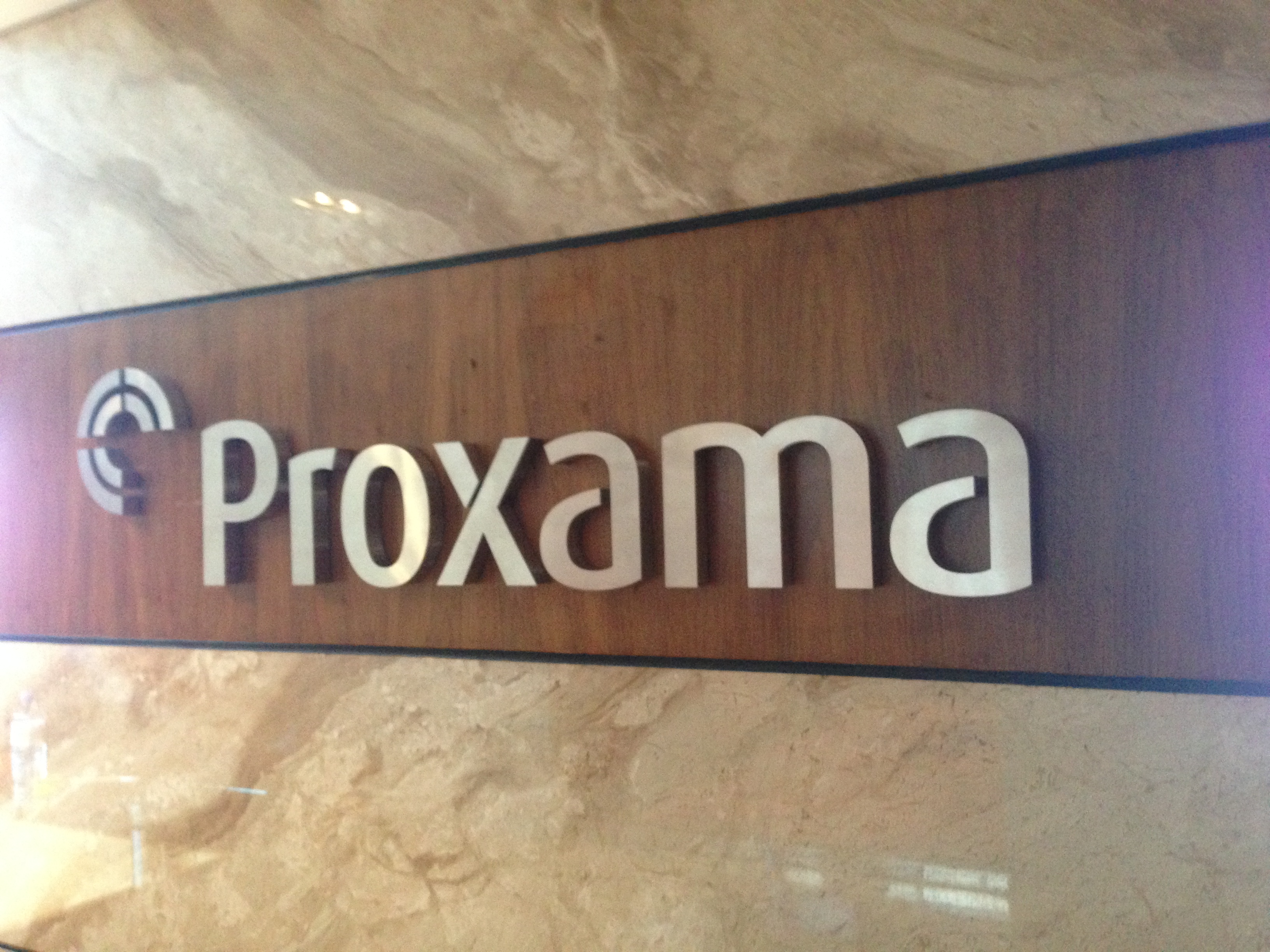 Wood-mounted Entrance Sign Brushed stainless steel sign mounted on wood veneer panel set into recess of marble wall in London office entrance wall. Corporate SignsReception signsOffice Signs Share this sign