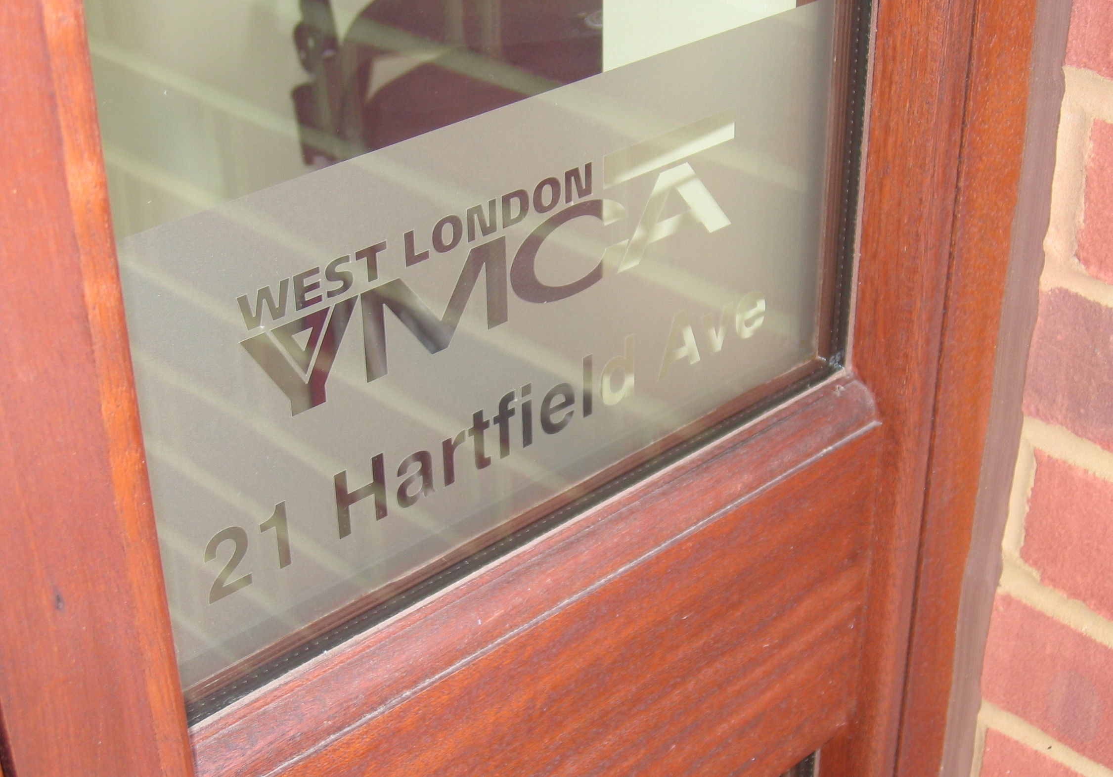 YMCA Door Sign Small window graphic inserted into glass panel of YMCA wooden door. Frosted glass and manifestationsHealth and Wellbeing Share this sign